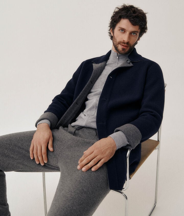 ビジネスシーンでカーディガンを着用する際には、気を付けたいポイントが複数あります。生地の厚さは、通常または少し薄手のものを選び、カジュアルに見えてしまう恐れのある厚手のカーディガンは避けましょう。カラーは、フォーマルな印象を与える黒やネイビー、ダークグレーがおすすめです。ワイシャツの上からアウターとして着用するなら、フルジップカーディガンを。スーツやジャケットに合わせる際は、ベーシックなVネックカーディガンが最適。アウターにメンズカシミヤコートを合わせればスマートにきまります。