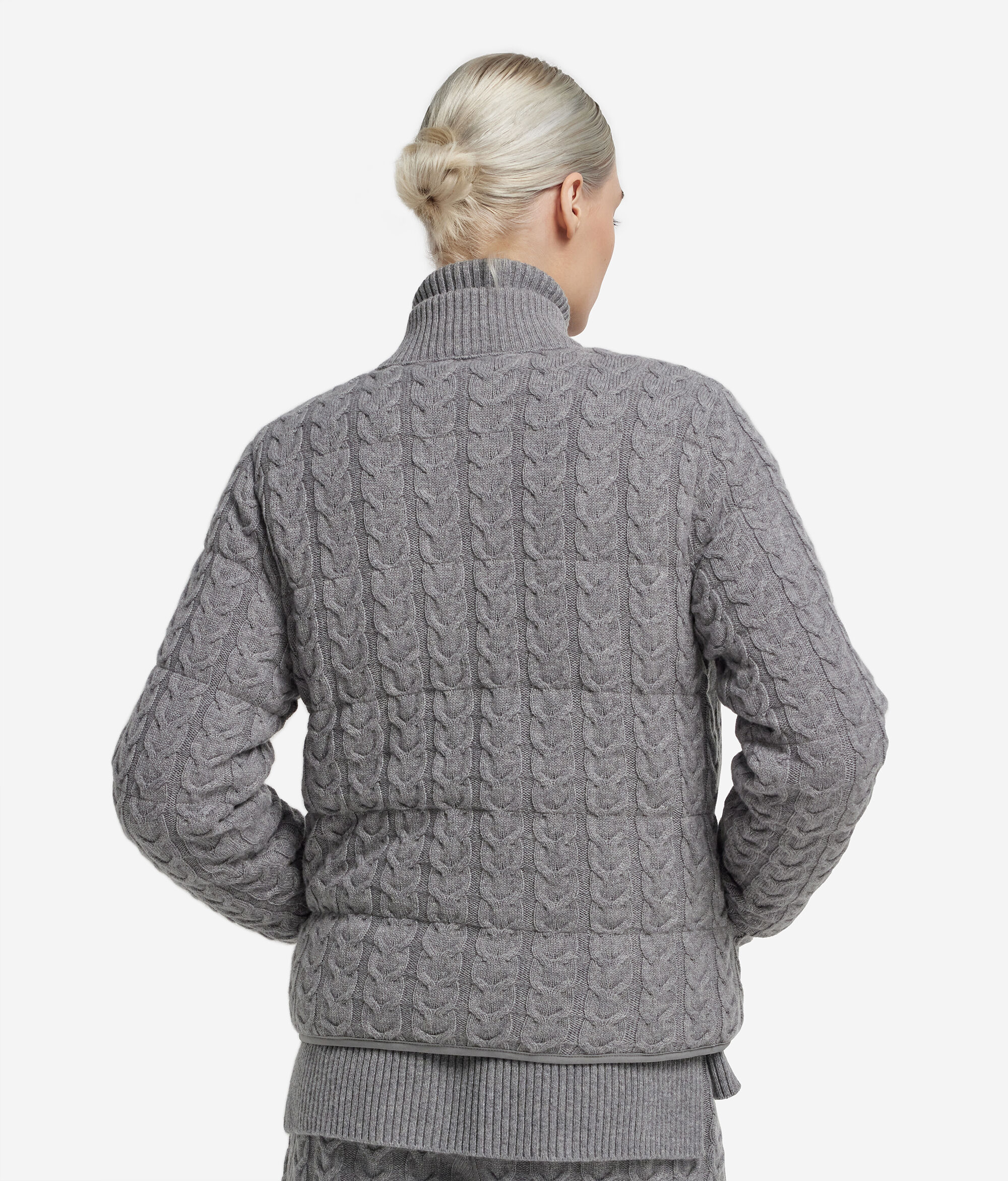 テクニカルファブリックとウルトラソフトカシミヤを使用した、リバーシブルのダウンジャケット。柔らかな着心地で、活躍の場を選ばない一枚。ケーブル編みの模様が豊かなテクスチャーと個性を演出。ニット地で作られたハイネックの襟が、首元を心地よく包み込んで暖かく保ちます。フロントポケットを備えており、開閉はファスナー式で実用性も抜群。ディテールにはテーラリングの要素を取り入れました。丈の長さとフィット感はレギュラー。エレガントな印象と現代的なスタイルを兼ね備えた、冬のキーアイテムとして活躍します。