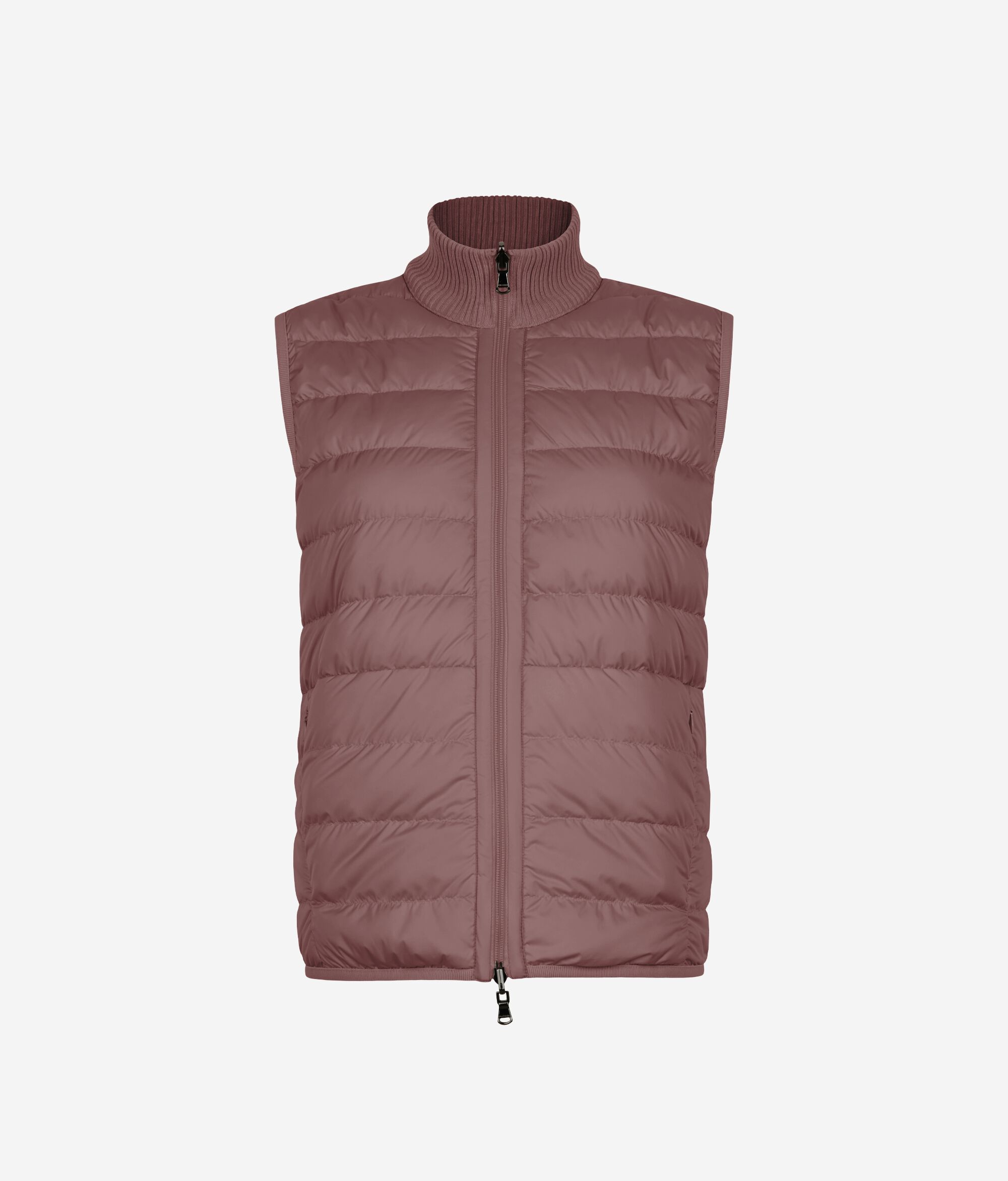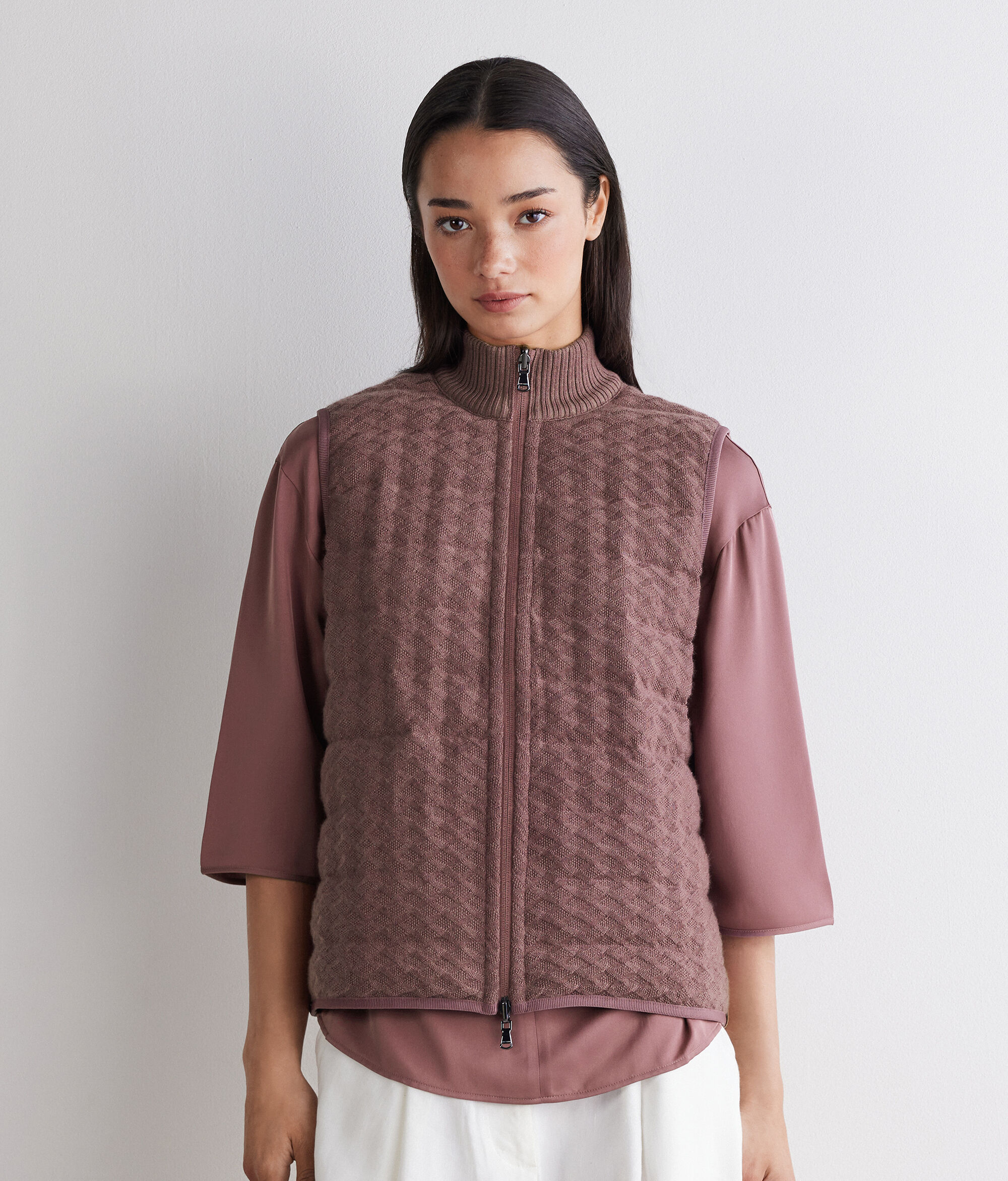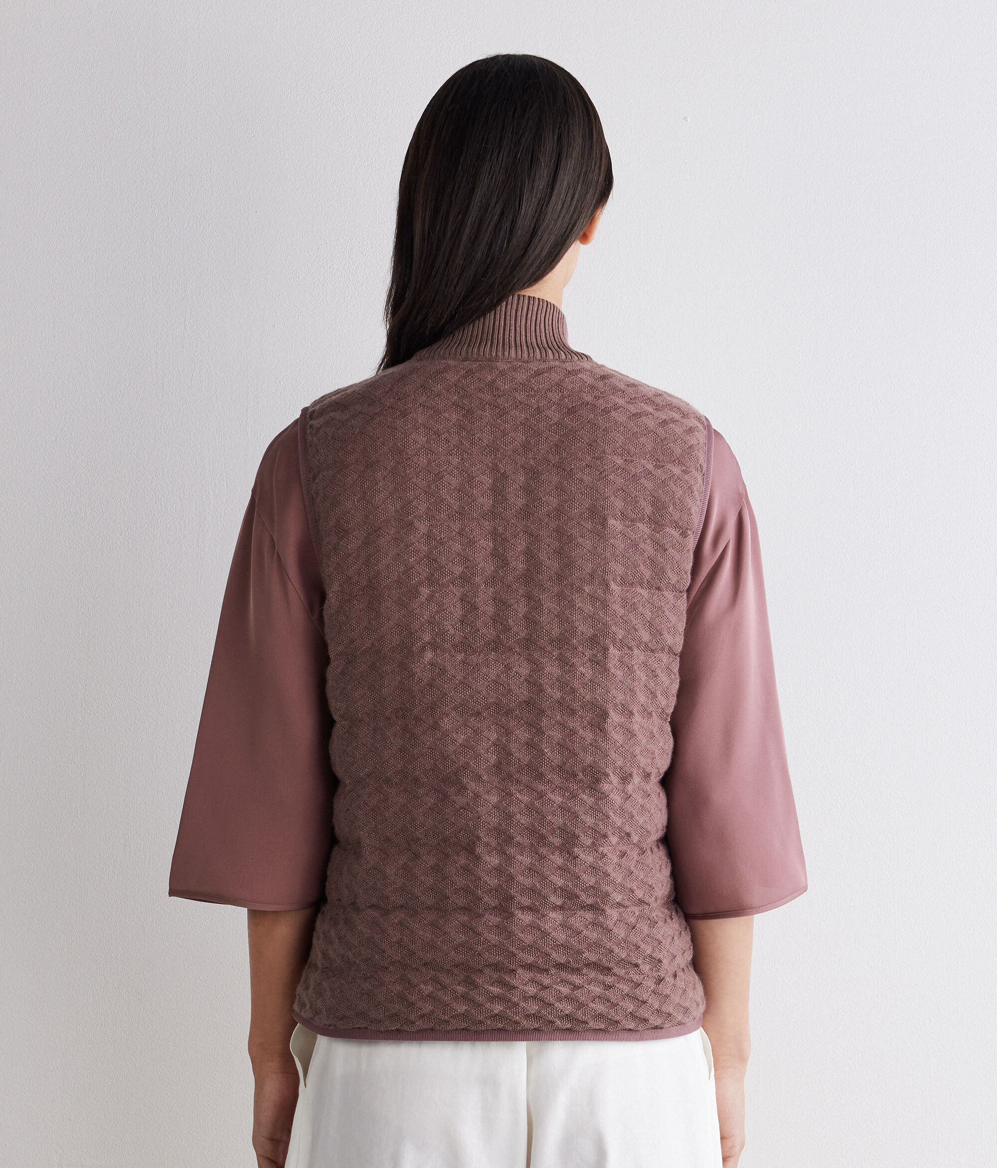 • ハイネックの襟には、ウルトラファインカシミヤのリブ編みのニット地を使用