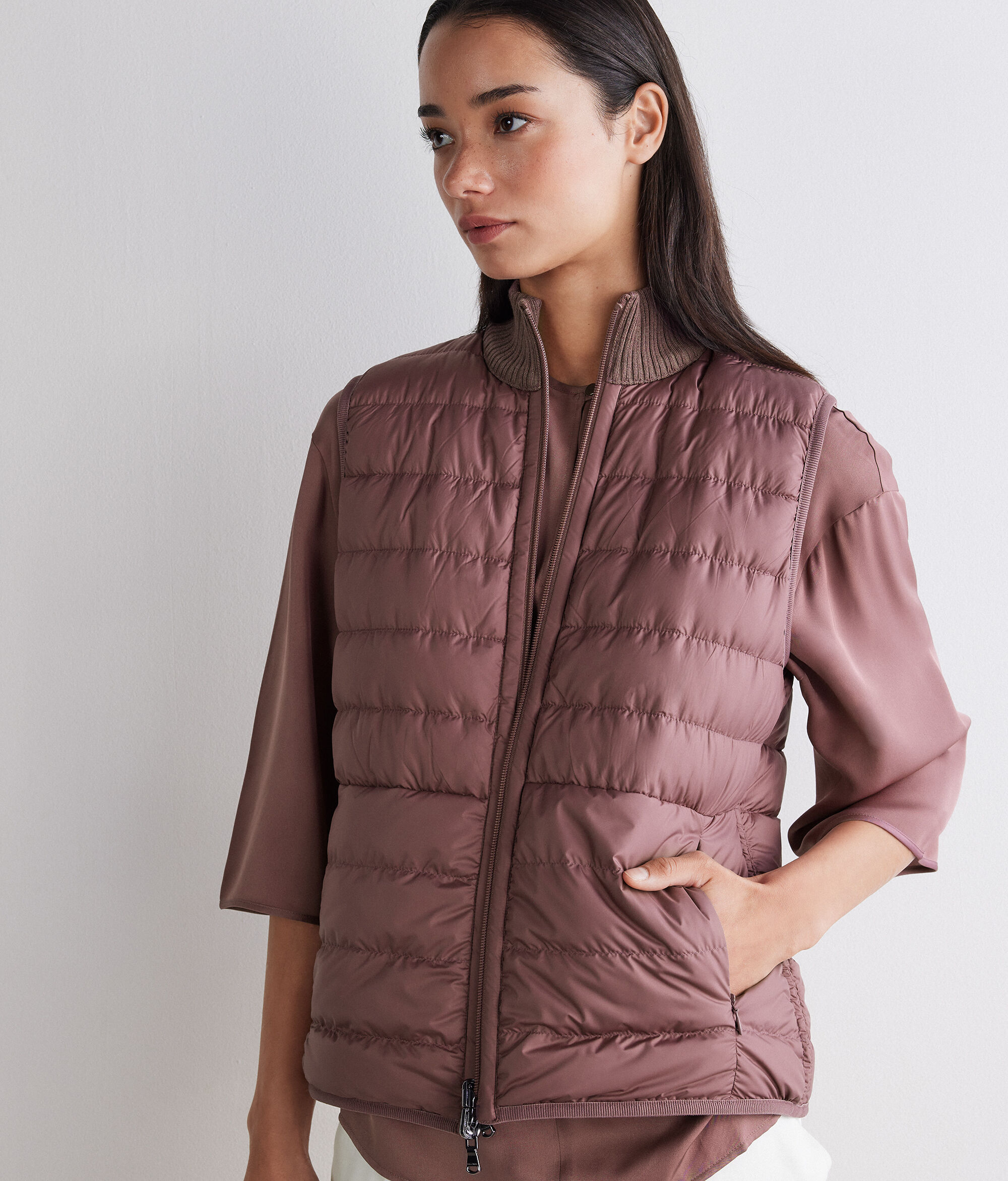 シンプルなデザインが洗練を感じさせるリバーシブル仕様のダウンベスト。片面にはマットなナイロン素材、もう片面には上質なウルトラファインカシミヤを使用したリバーシブルなので、場面に合わせて異なる雰囲気をお楽しみいただけます。スリムフィットのモデルで、ダブルファスナーや、表から見えないように配されたポケットなど細部にもこだわり、巧みな仕立ての技術を感じさせる一枚です。