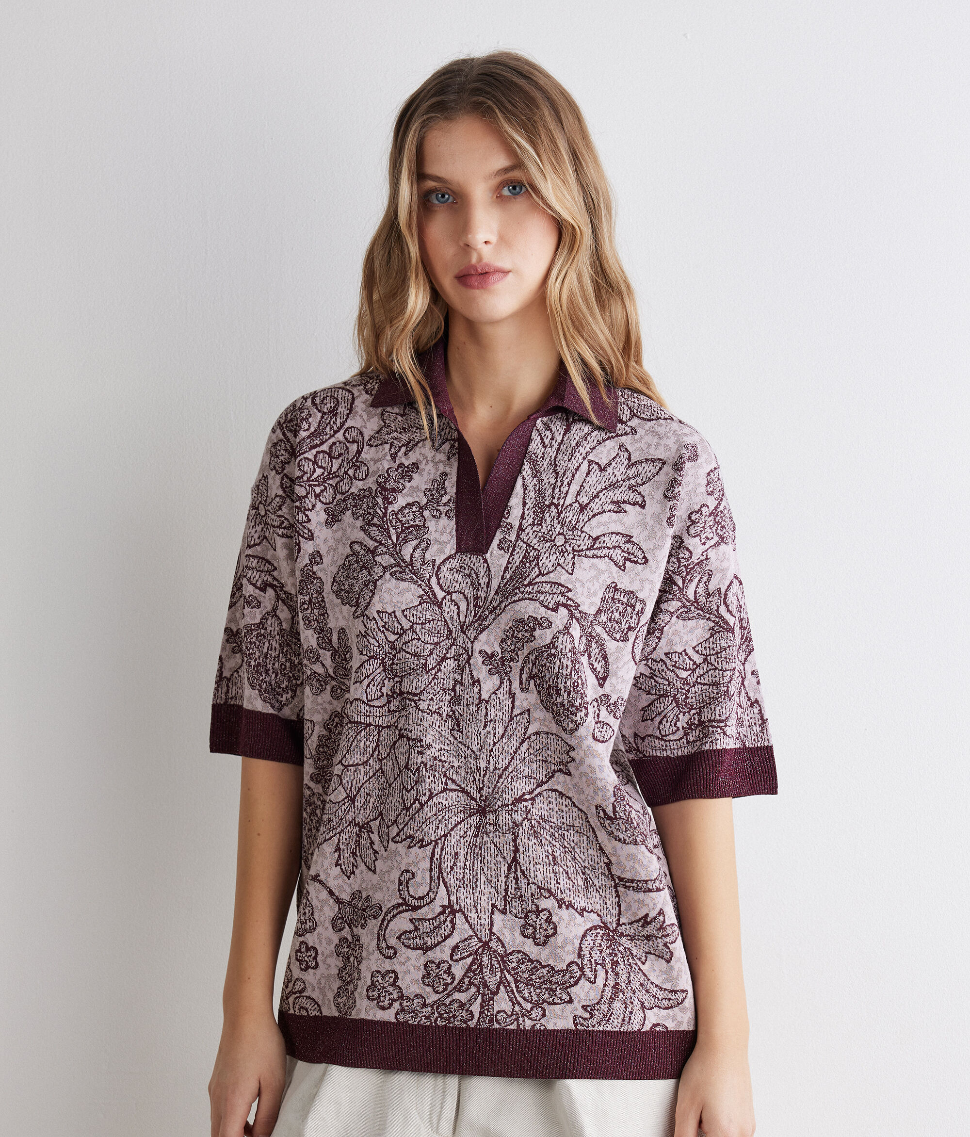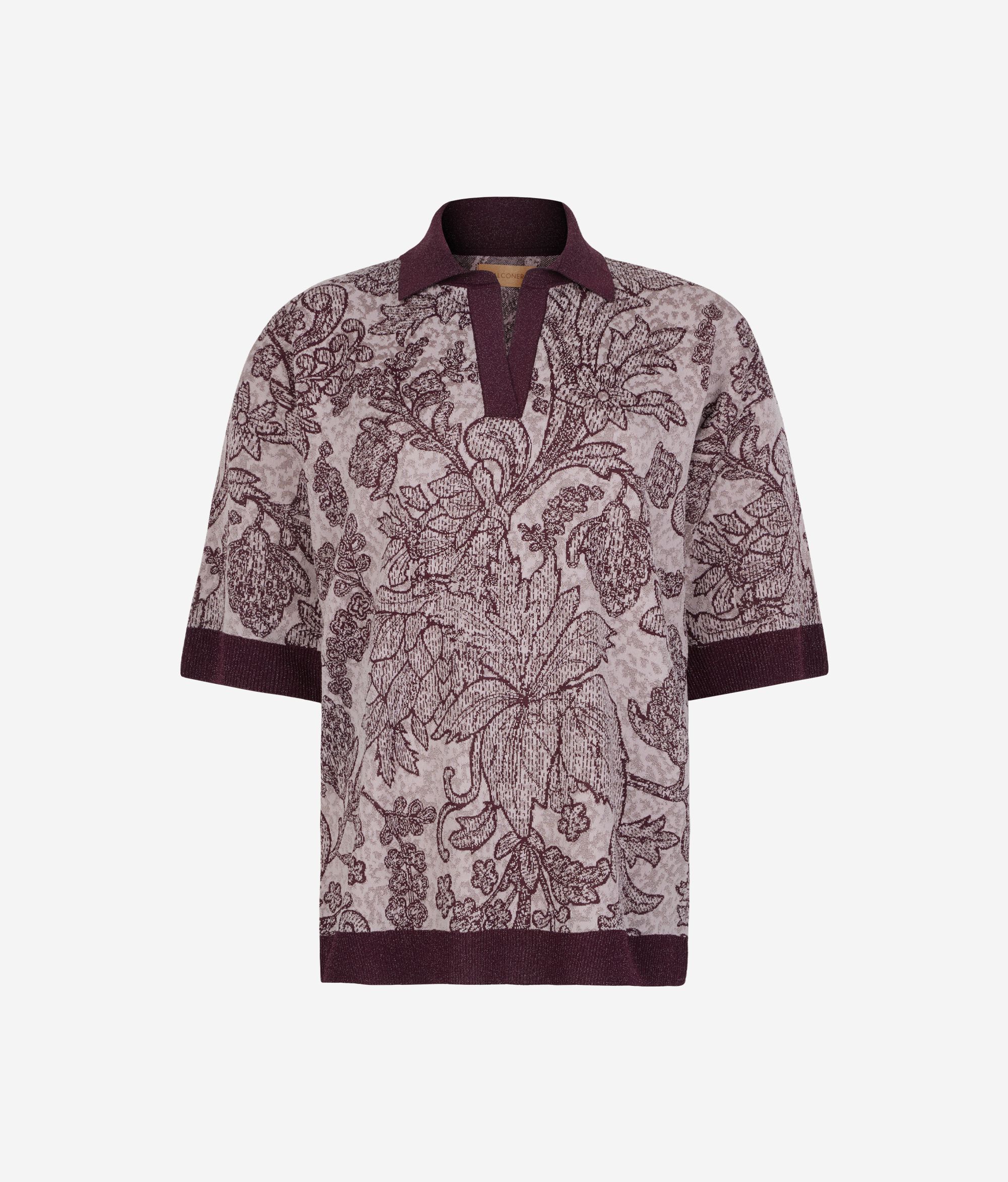 ラメ糸がほのかに輝く、ビスコースとコットンのジャカード編みのニットで作られた半袖ポロシャツ。植物をモチーフにした繊細な刺繍が施されています。襟はポロシャツ定番の首元が開いたデザインで、リラックス感を醸しながらもエレガントな印象の装いに。コントラストカラーのラメ糸でリブ編みにした裾がさりげなく輝きます。袖はドロップショルダーで、ゆったりと快適に着られるとリラックスフィットのモデル。現代らしい洗練された装いを演出する一枚です。