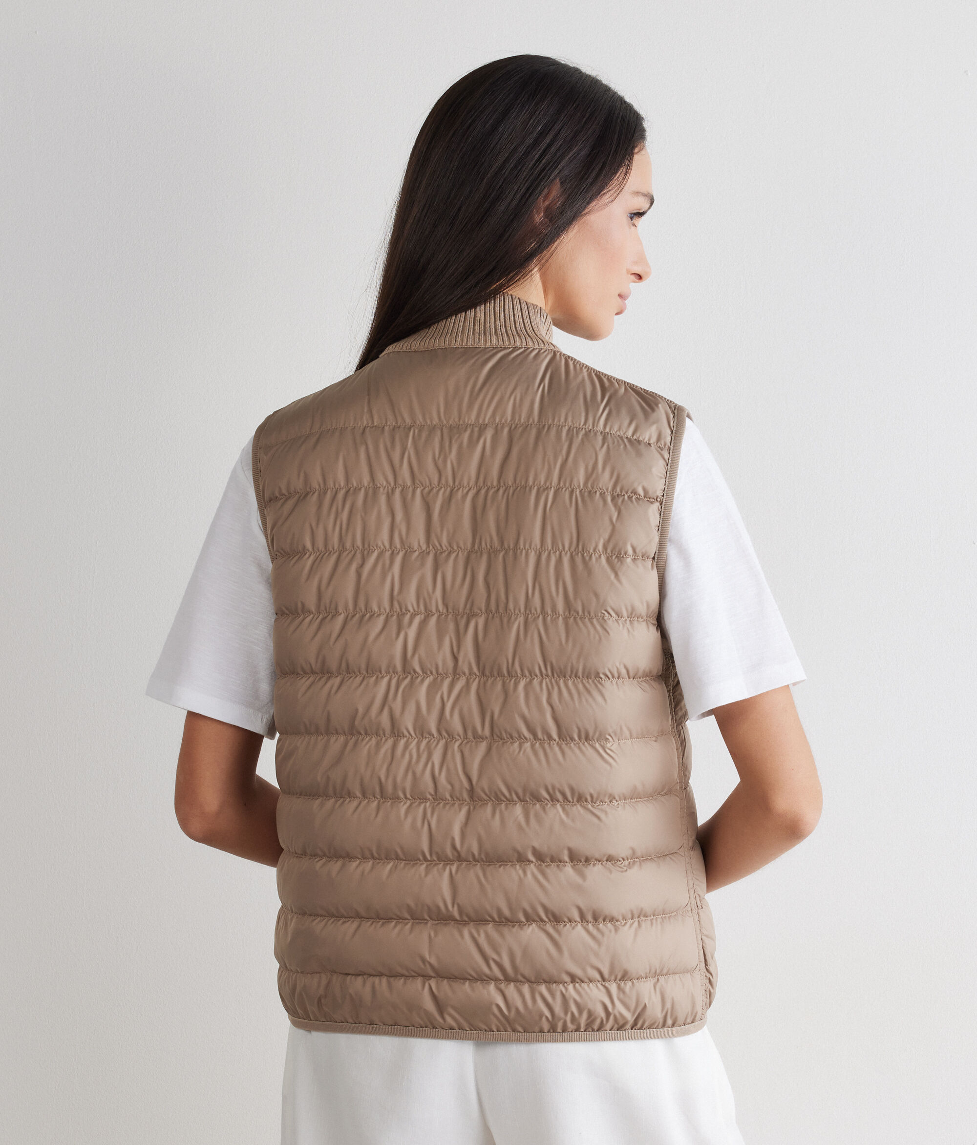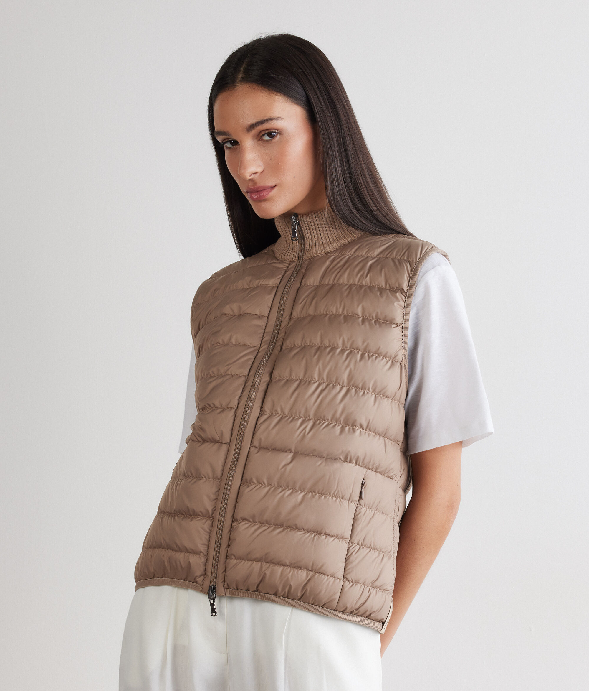 モダンで洗練された印象を放つ、リバーシブル仕様のダウンベスト。片面にはマットなナイロン素材、もう片面には上質なウルトラファインカシミヤを使用したリバーシブルなので、場面に合わせて異なる雰囲気をお楽しみいただけます。ハイネックの襟はリブ編みのニット地。開閉はダブルファスナー式で、実用性とスタイリッシュなデザインを兼ね備えた一枚です。ポケットは表から見えないように配し、ボディラインに自然に沿うスリムなシルエットを際立たせるよう縁をリブ編みで仕上げて伸縮性をもたせるなど、細部にもこだわりを効かせました。