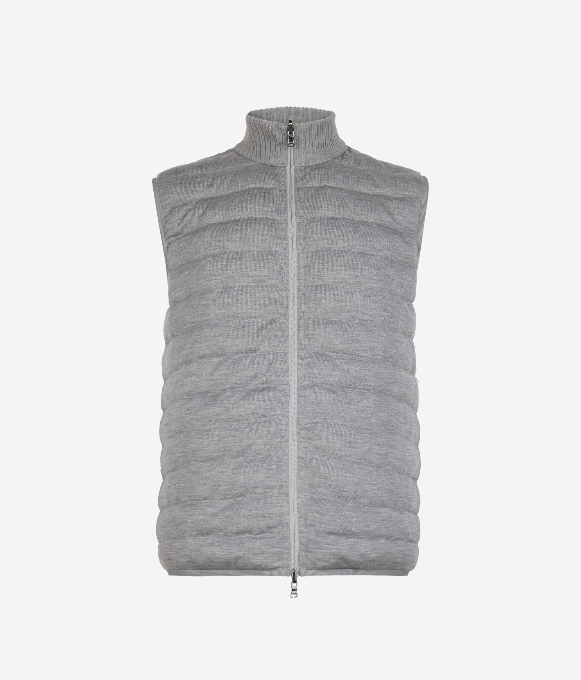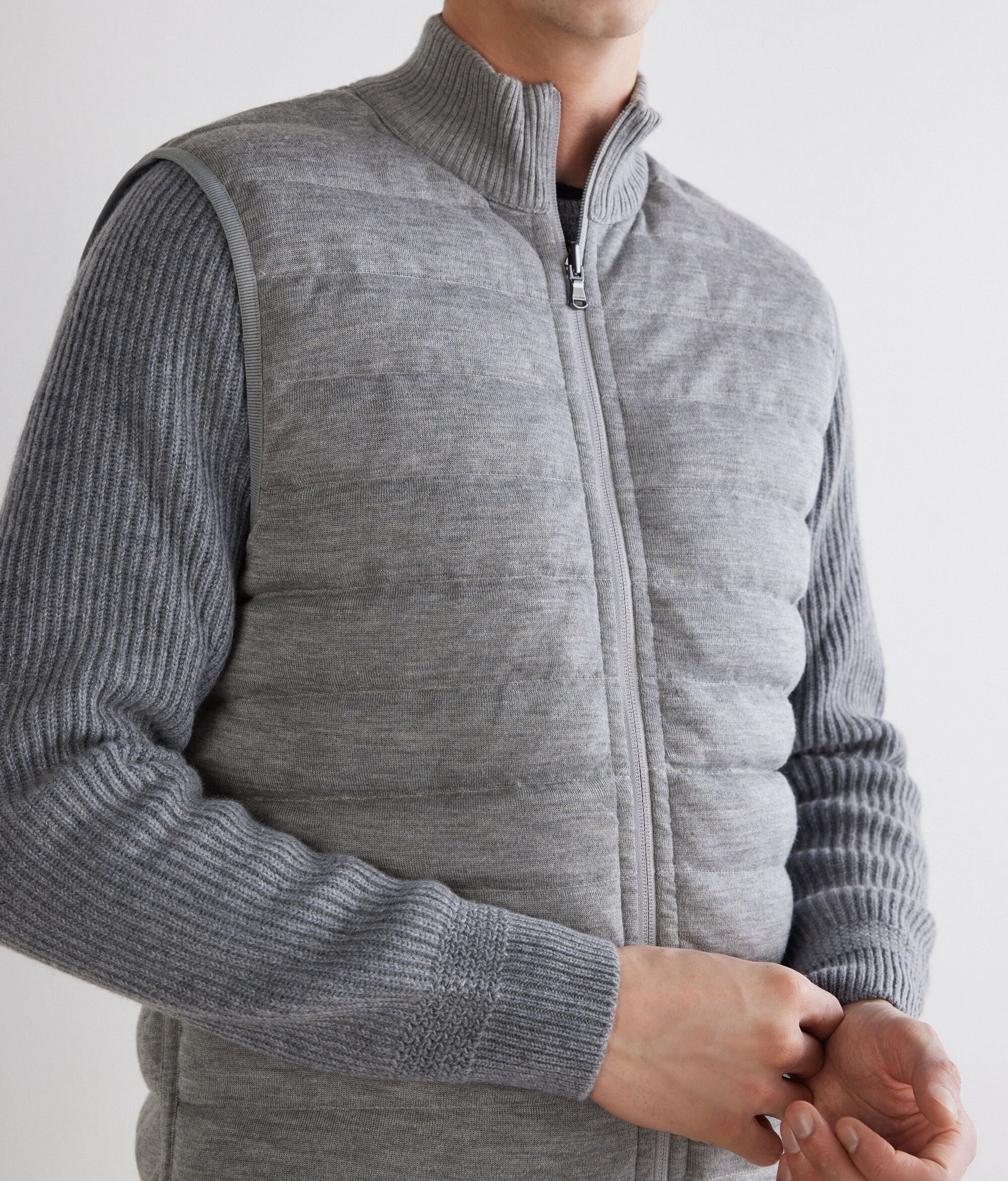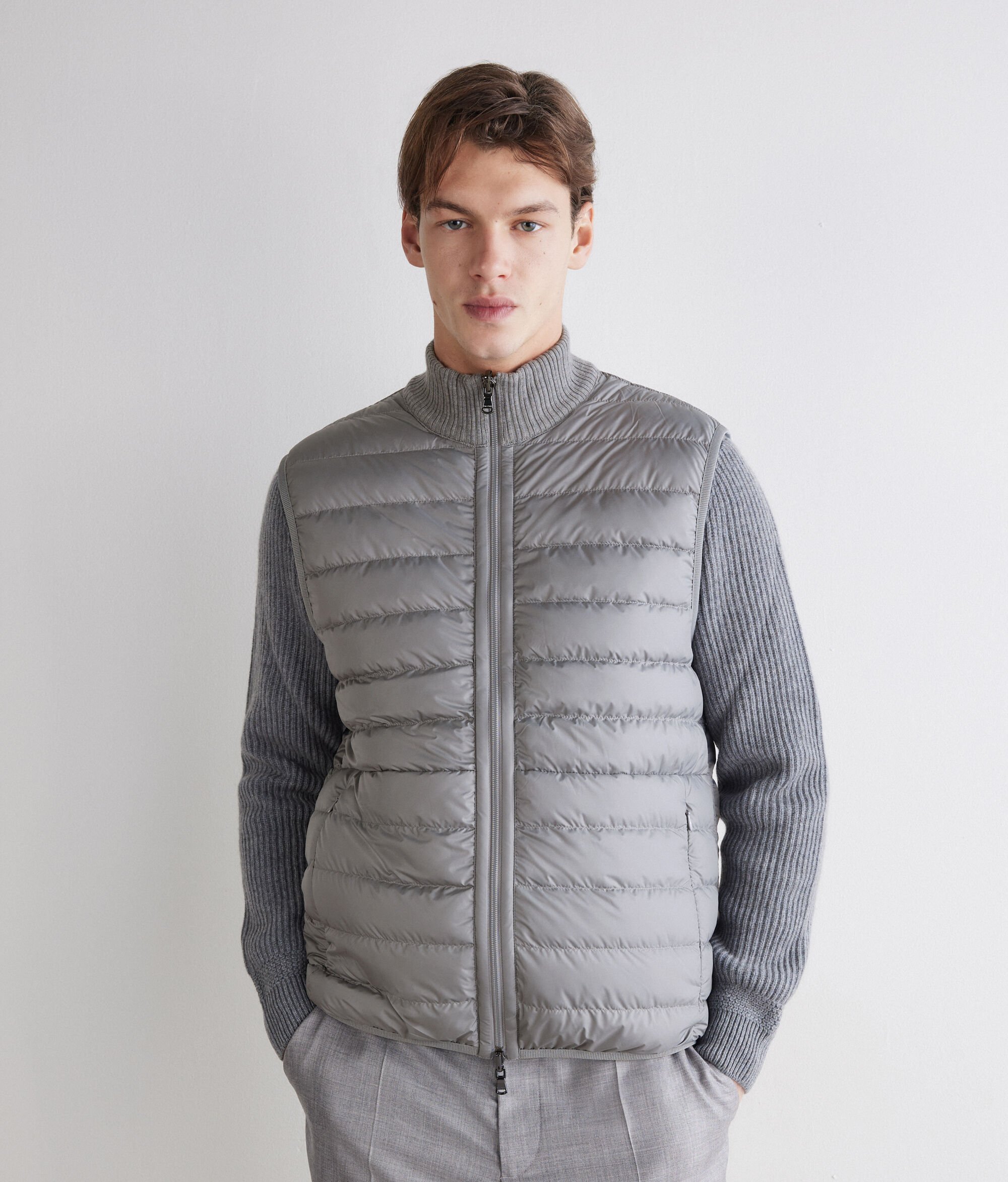モダンで洗練された印象を放つ、リバーシブル仕様のダウンベスト。片面にはマットなナイロン素材、もう片面には上質なウルトラファインカシミヤを使用したリバーシブルなので、場面に合わせて異なる雰囲気をお楽しみいただけます。ハイネックの襟はカシミヤのニット地を使用。スリムフィットのモデルで、ダブルファスナーや、目立たないように配されたポケットなど細部にもこだわった、巧みな仕立ての技術を感じさせる一枚です。