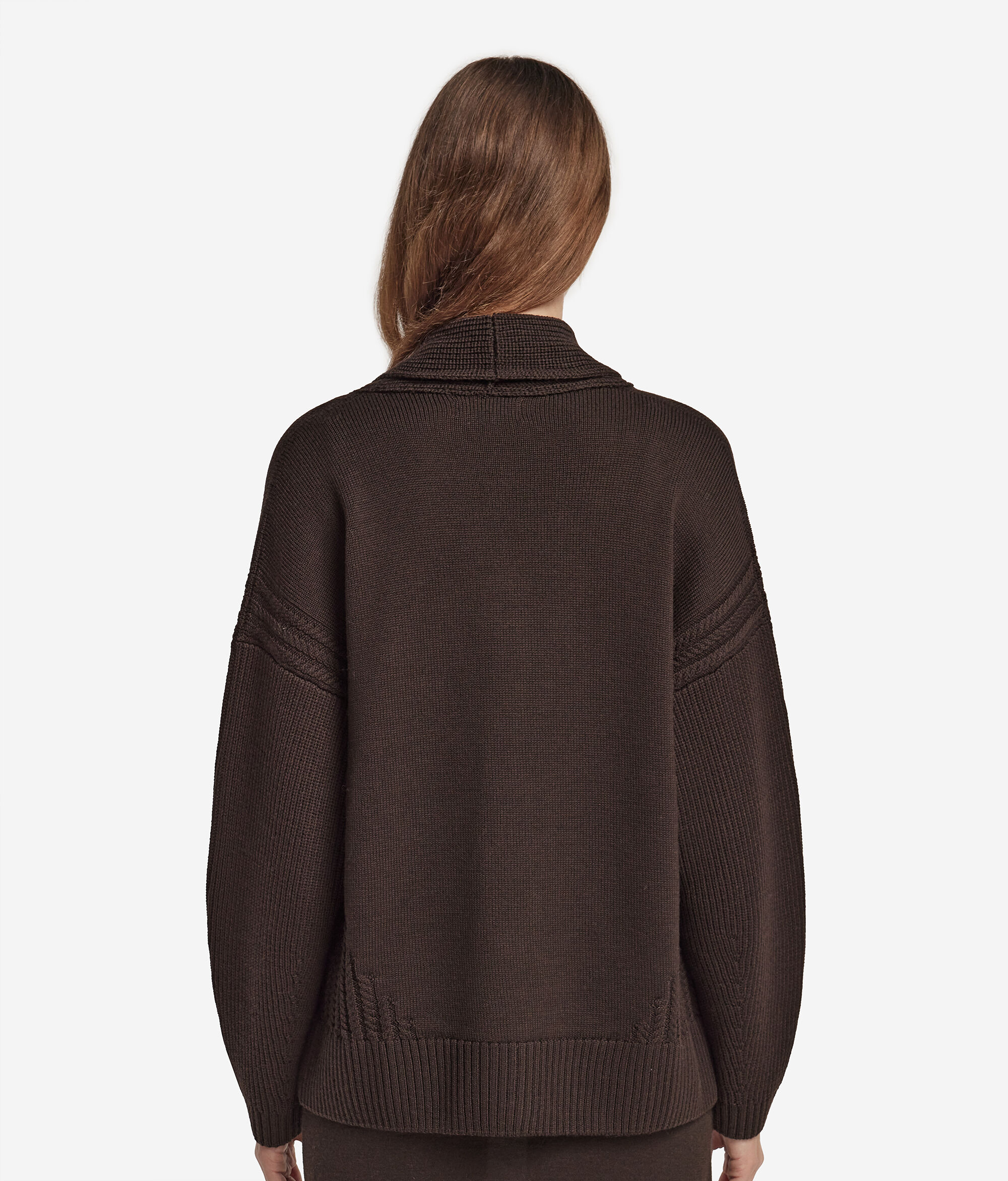 Son encolure rabattue et sa fermeture boutonnée lui donnent une allure élégante, tandis que ses épaules tombantes et sa coupe décontractée témoignent d'un style moderne et sans artifices. Le motif de côtes sur les manches et les torsades sur les côtés transforment chaque détail en un véritable chef-d'œuvre d'artisanat rehaussé par des poignets et un bas bords-côtes.