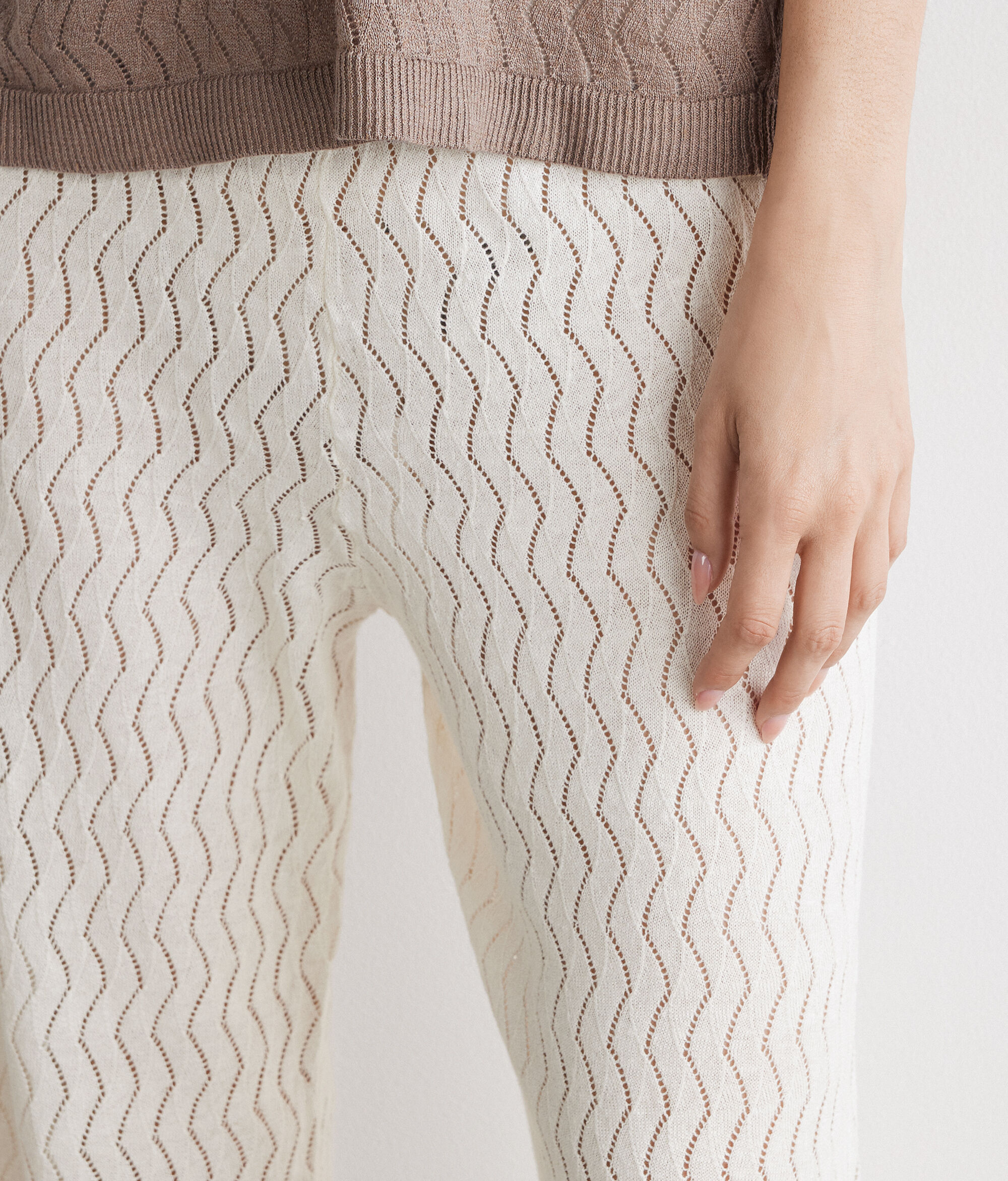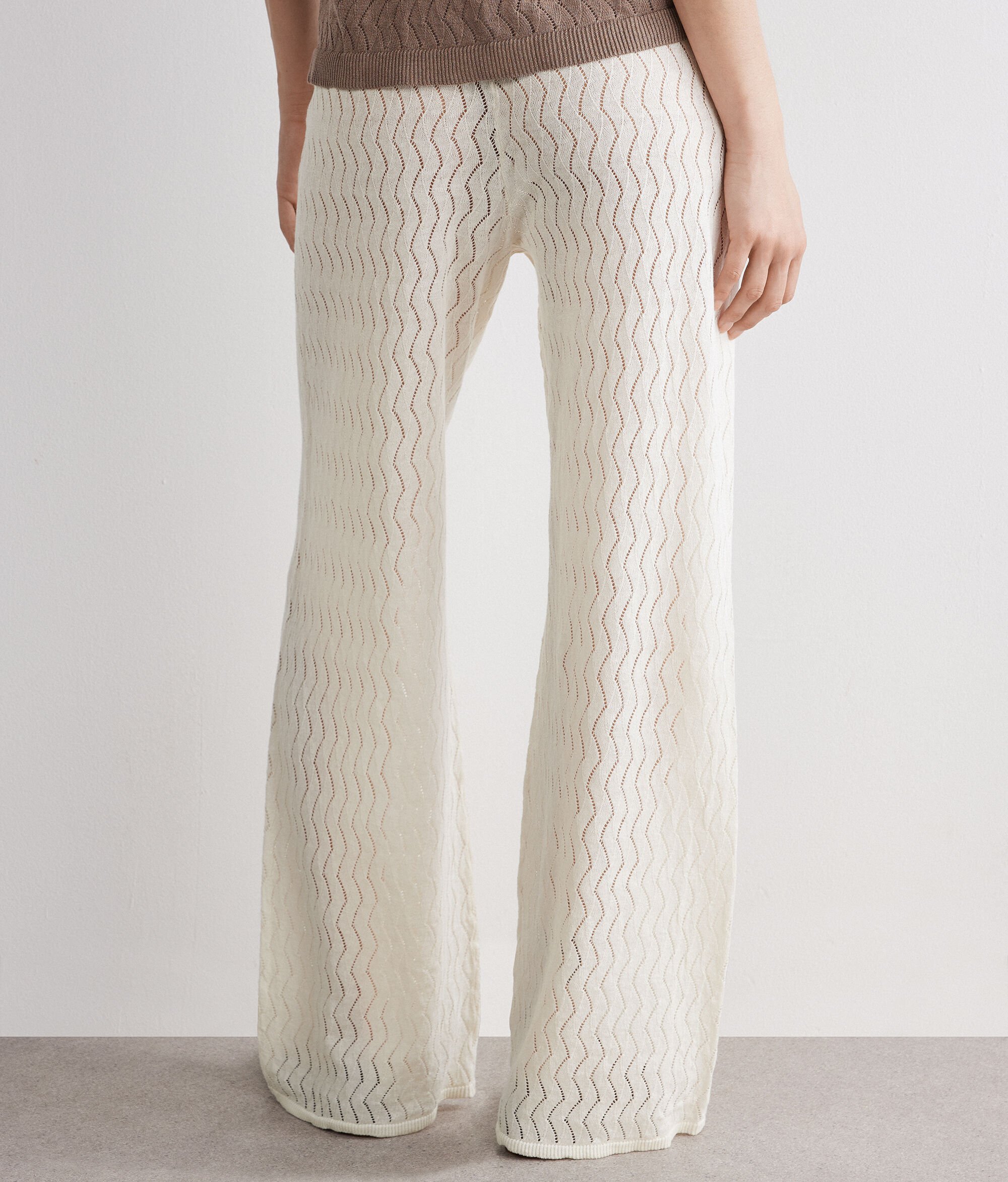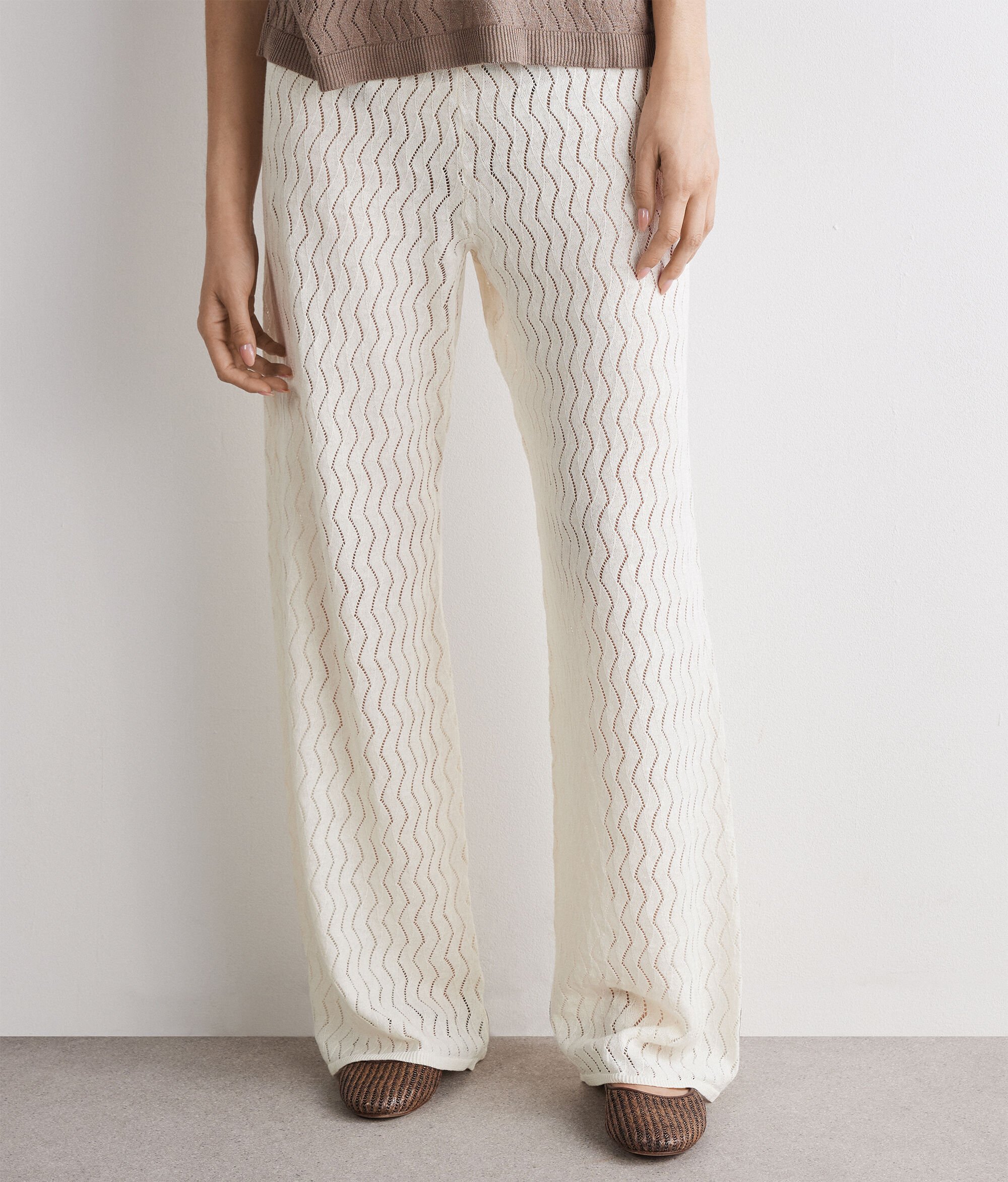 Pantalon en maille tricoté au point de vagues en lin et coton (63 % lin, 37 % coton). Ce modèle à coupe droite présente une taille élastique et une finition côtelée sur le bas. Il présente une coupe standard.