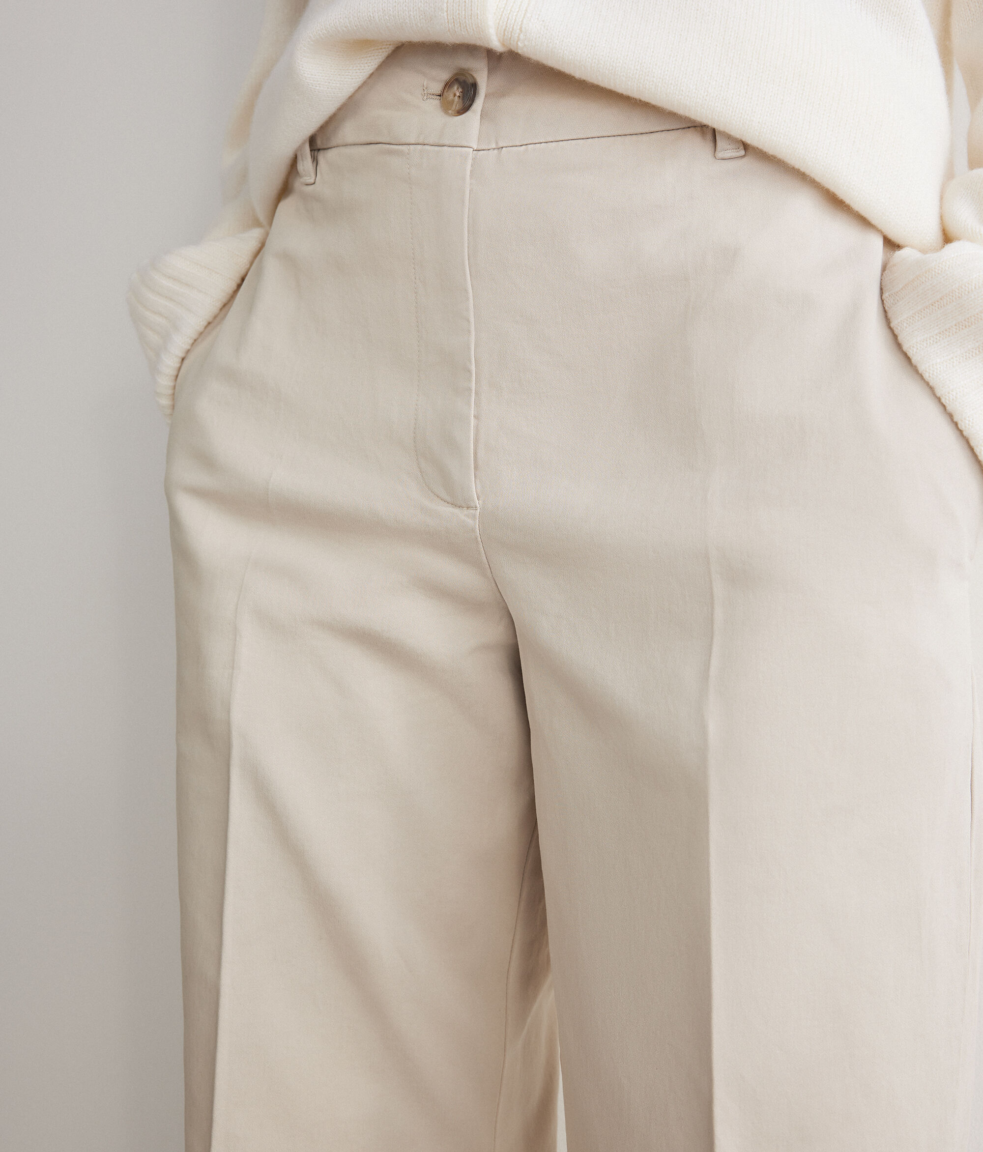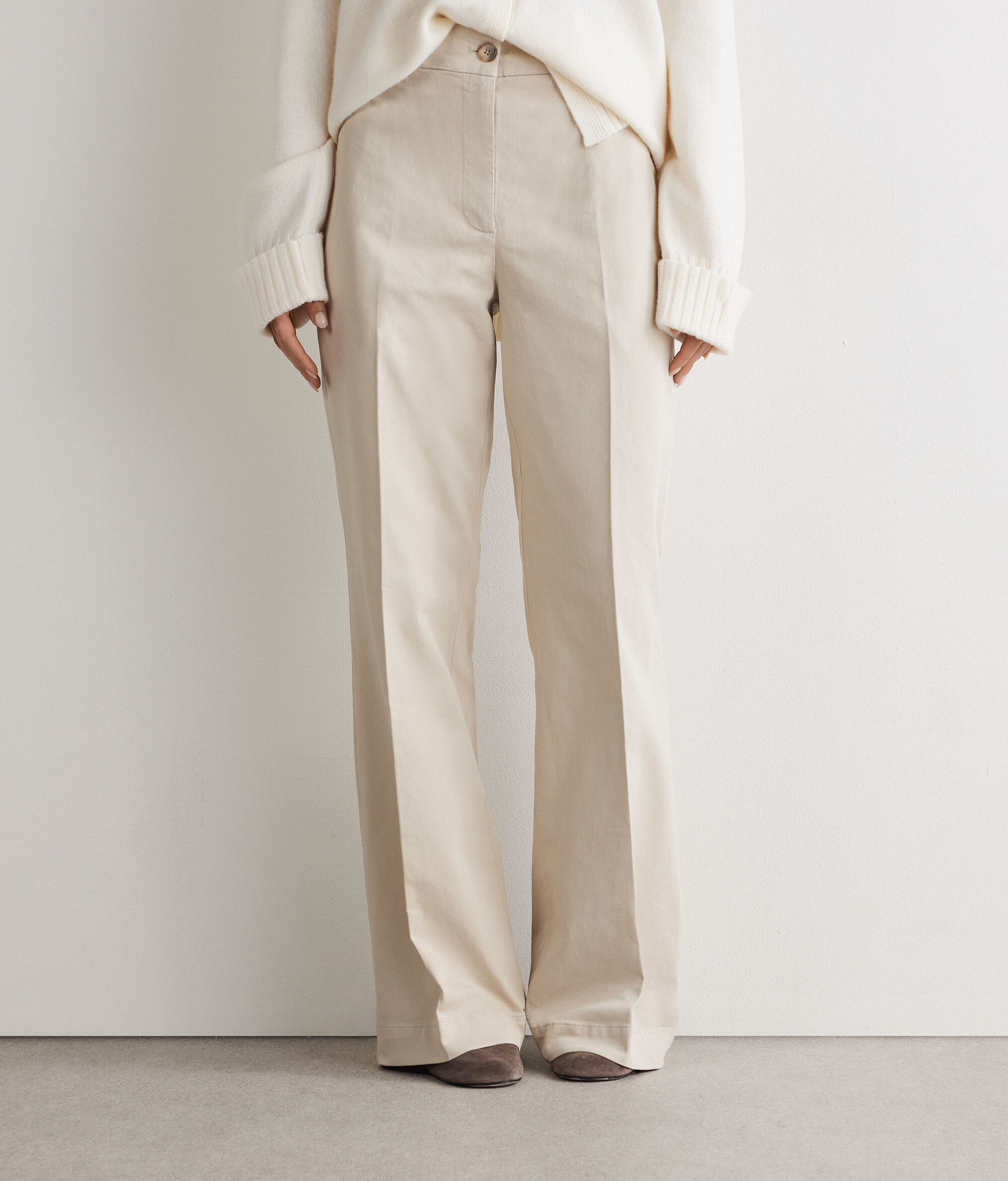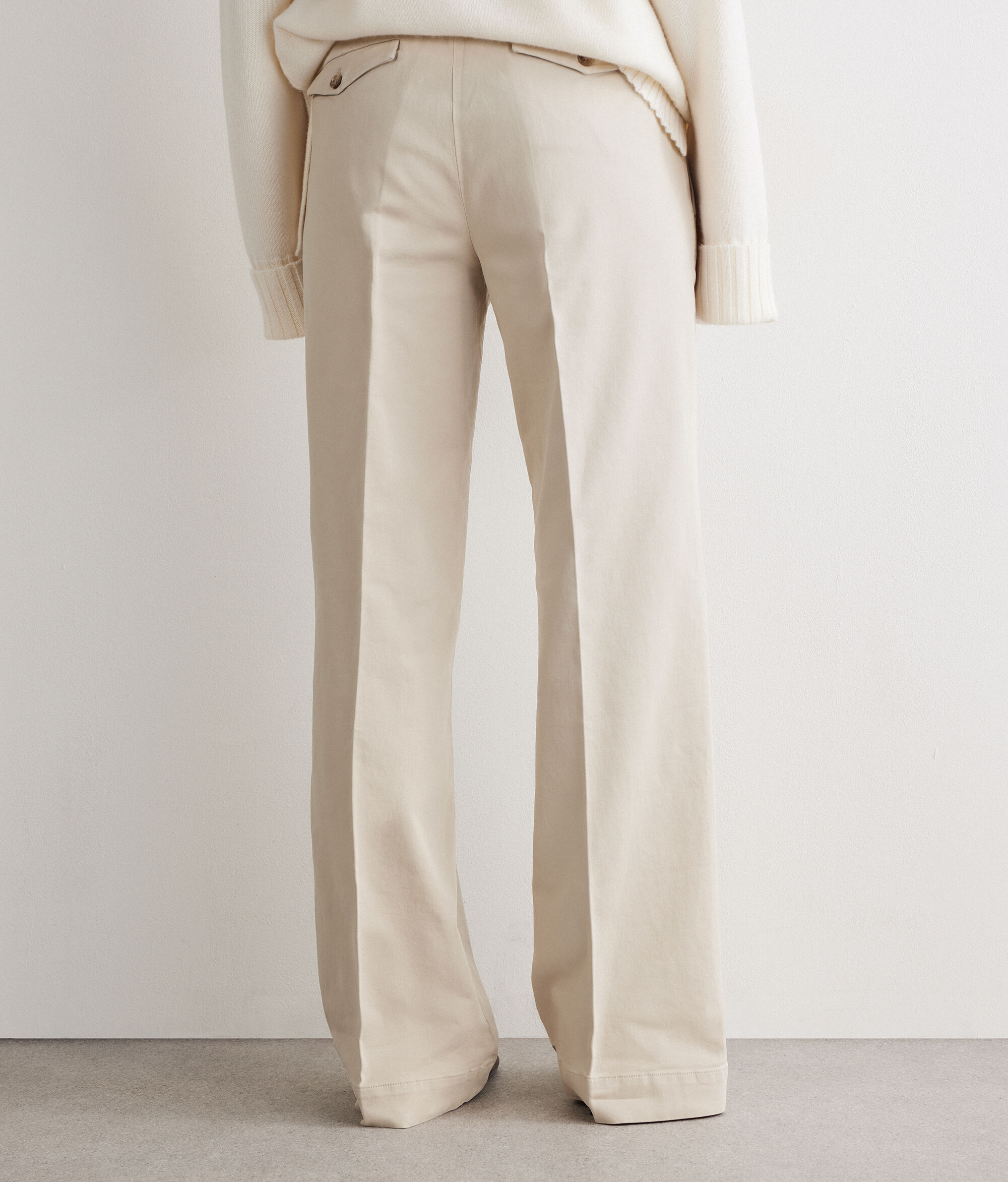 Ce pantalon large pur coton allie des lignes décontractées à des détails classiques. Sa fermeture éclair avec bouton sur le devant et ses poches latérales pratiques lui apposent une touche sportive et réunissent ses lignes, qui descendent tout droit le long des jambes. Sa coupe standard et sa longueur au ras-du-sol conjuguent confort et élégance intemporelle.