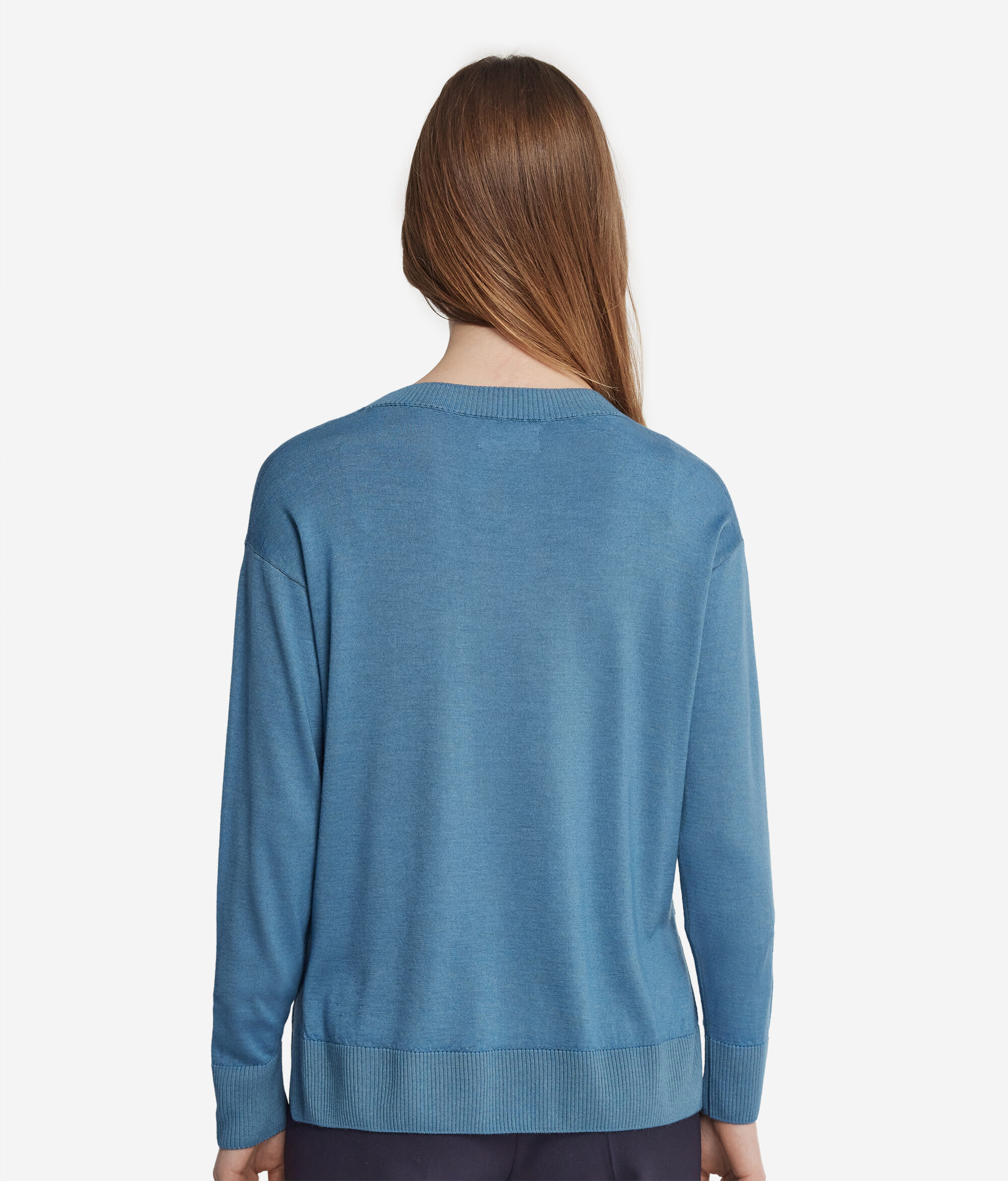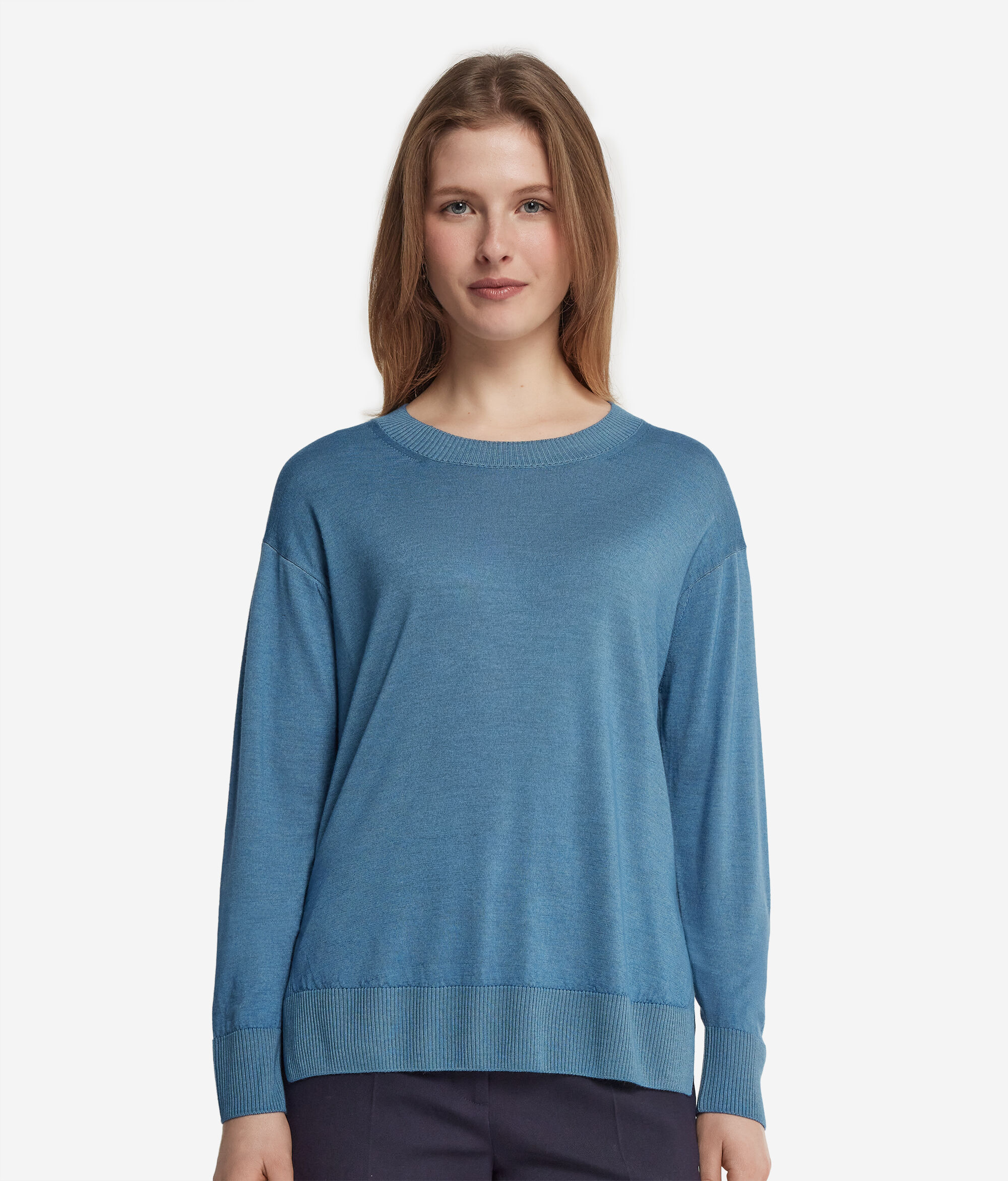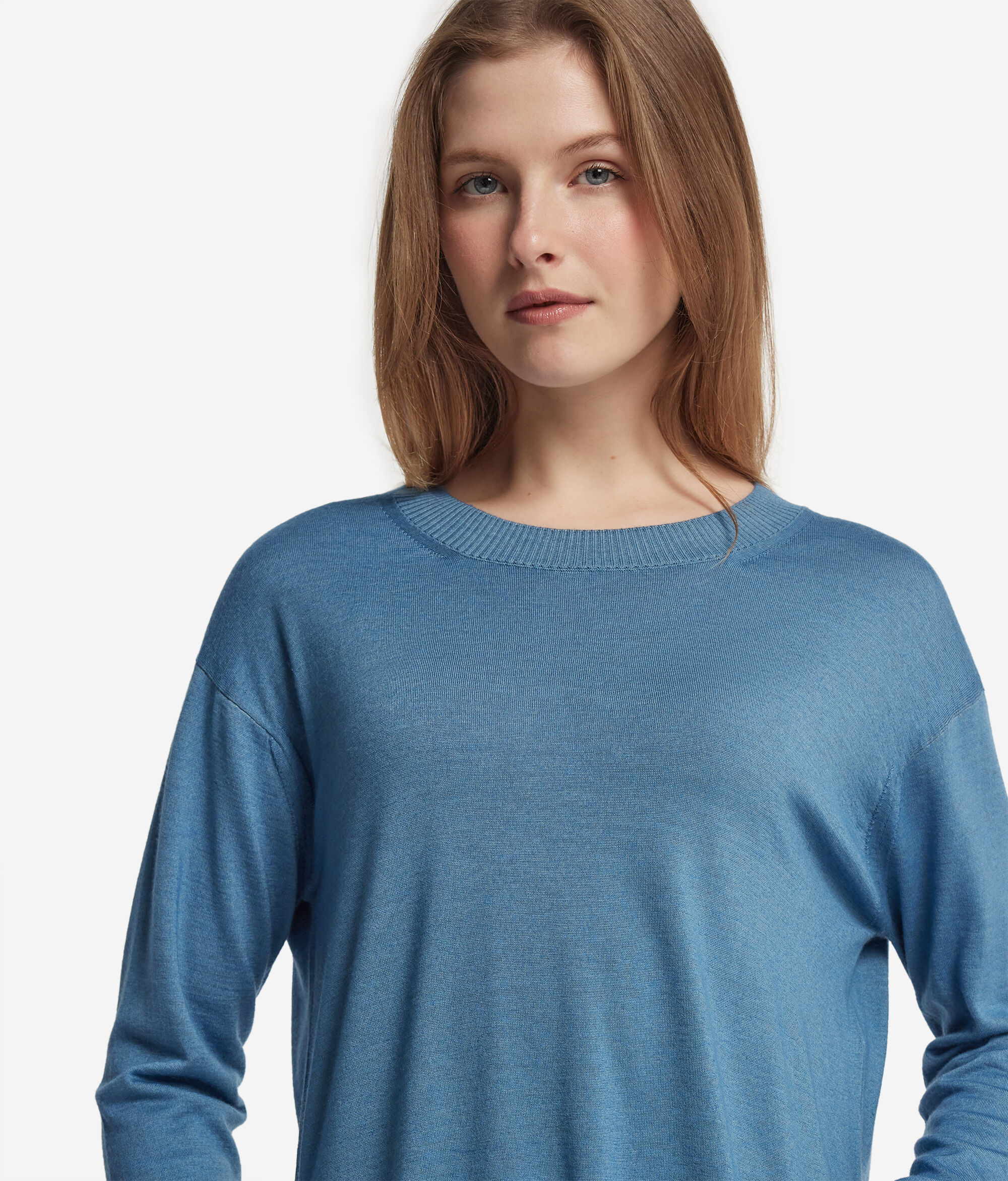 Ce pull à col rond en cachemire ultra-fin est un modèle à manches longues caractérisé par une finition côtelée sur l'encolure, les poignets et le bas. Il se démarque par des fentes latérales. Il présente des emmanchures légèrement abaissées et une coupe fluide.