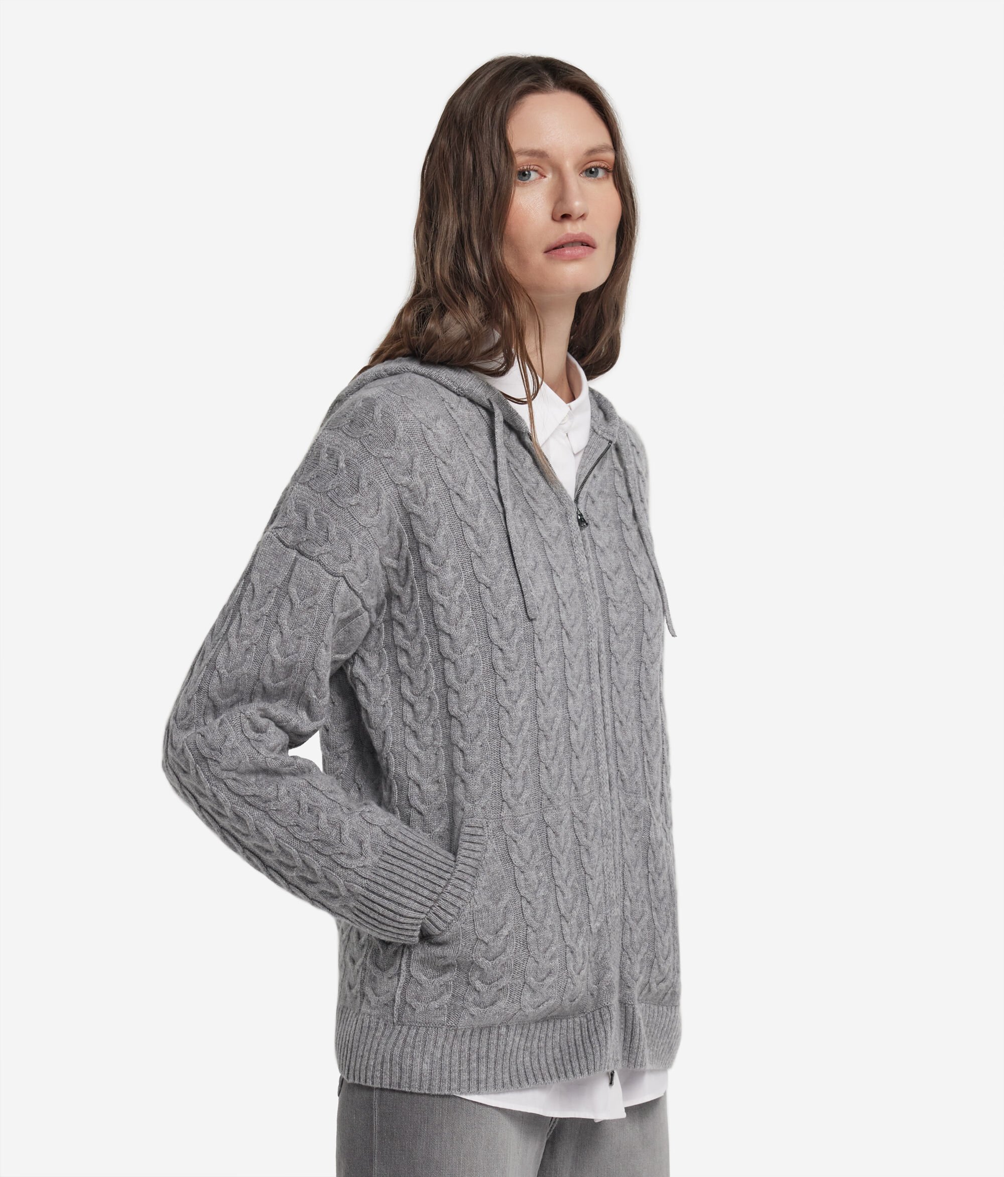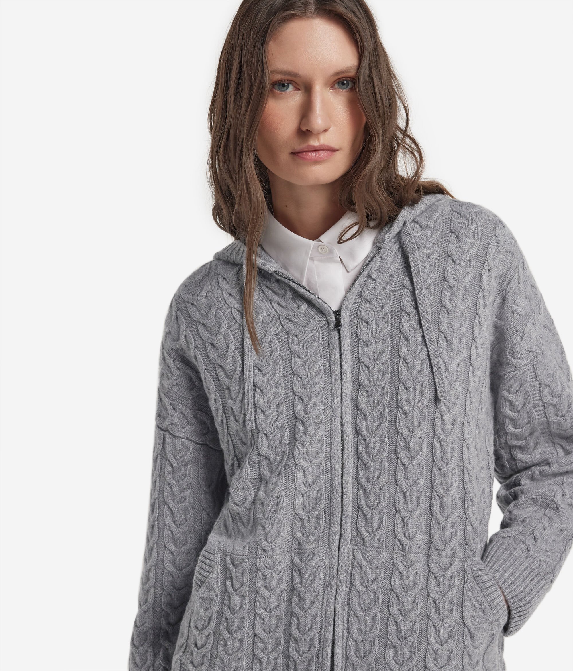 Ce sweatshirt décontracté-chic allie la douceur du cachemire ultra-doux à des lignes contemporaines. Une maille à torsades sublime la texture du vêtement, qui est rehaussé d'une capuche à cordon et d'une fermeture éclair. Les emmanchures légèrement abaissées et la coupe fluide offrent confort et style décontracté, tandis que des finitions côtelées sur l'ourlet et les poignets apportent une touche structurée. Arrivant au niveau des hanches, c'est un vêtement qui allie praticité et luxe discret. Idéal pour un style élégant mais détendu.