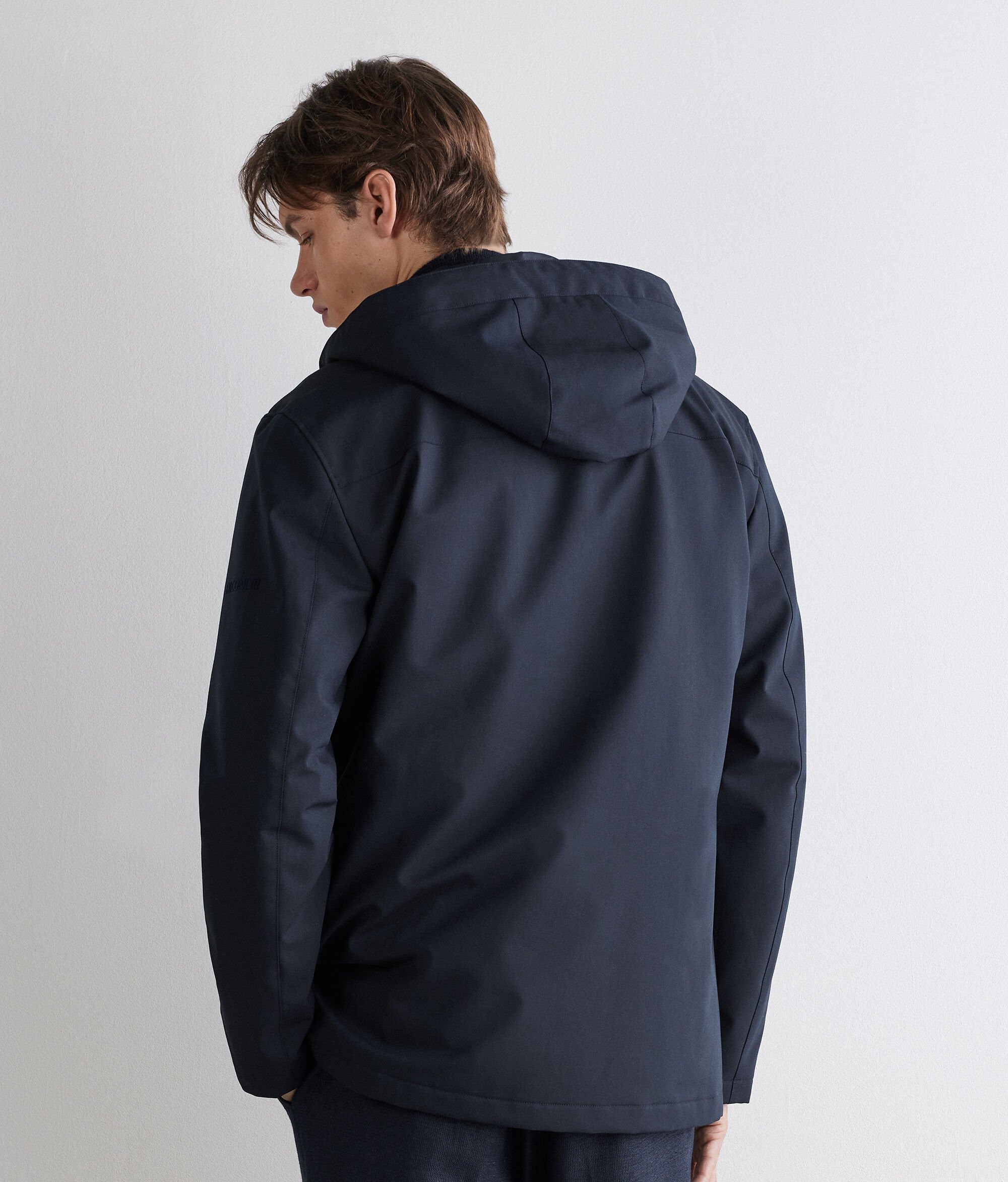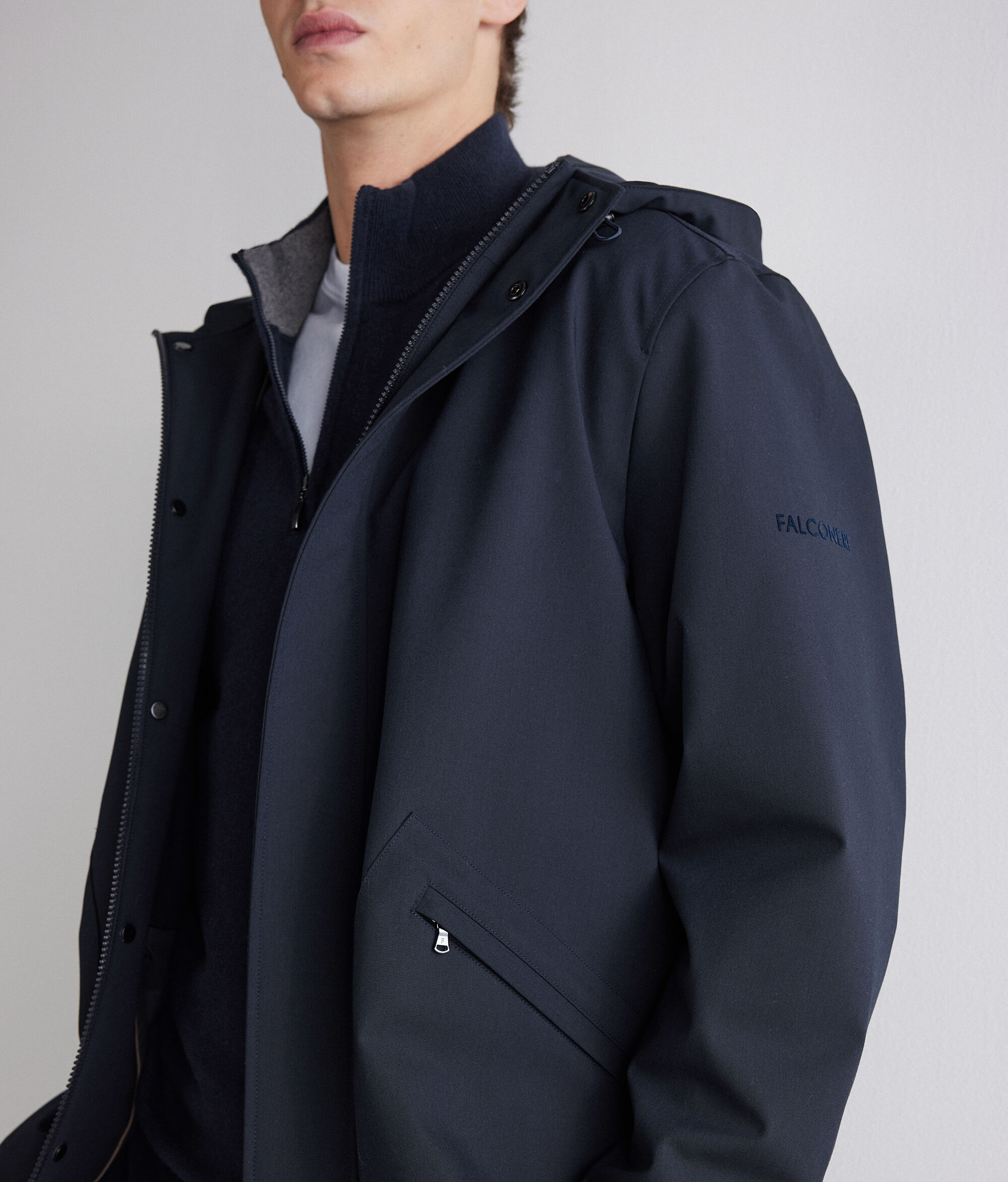 Veste à capuche en tissu technique déperlant offrant la combinaison parfaite de protection et de confort. La doublure en cachemire ultra-fin de la partie supérieure garantit une chaleur douillette, équilibrée par le tissu technique des manches et de la partie inférieure. La fermeture éclair à double curseur et les boutons-pression dessinent une silhouette épurée, tandis que les poches intérieures et extérieures complètent ce modèle avec fonctionnalité et polyvalence.