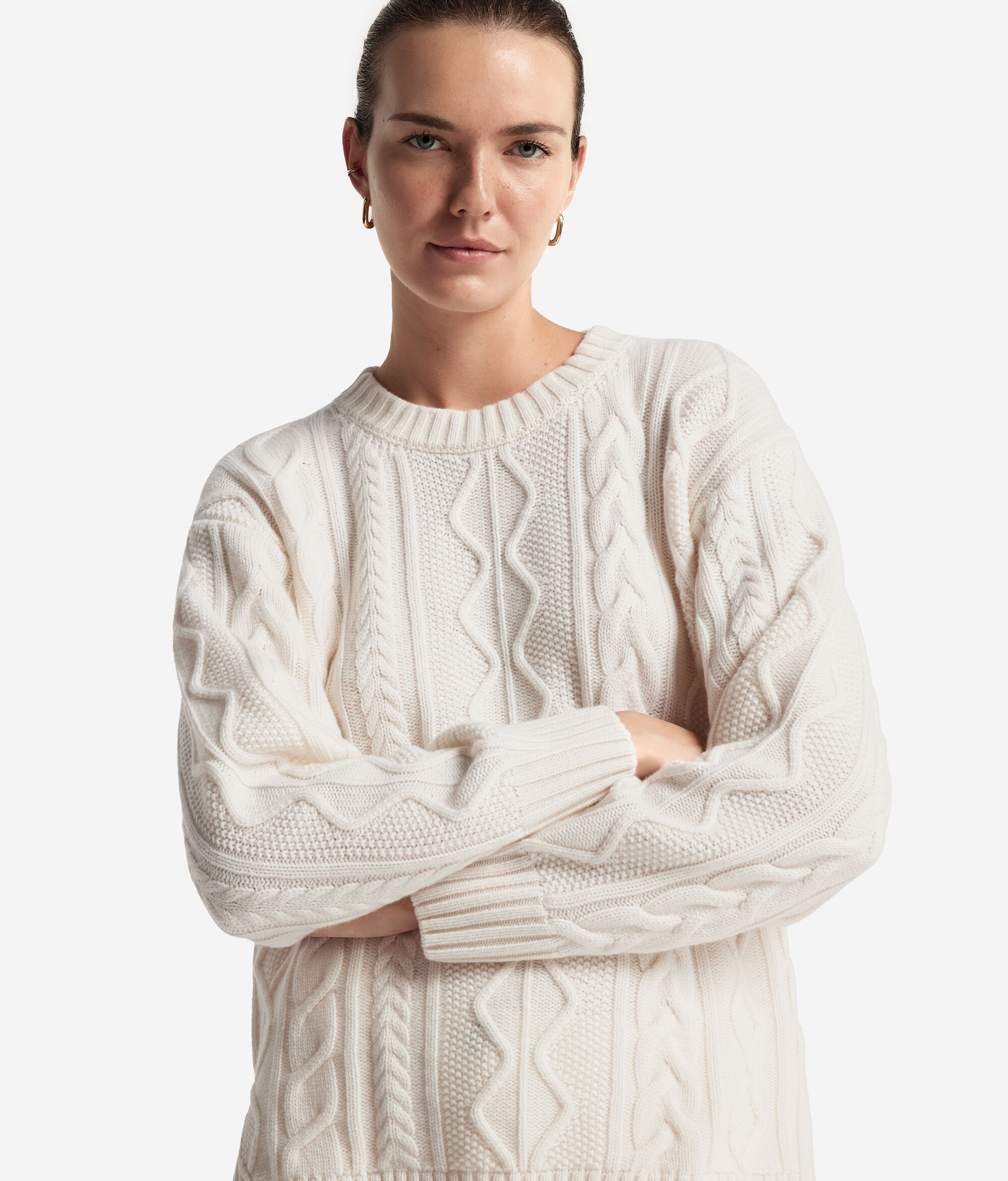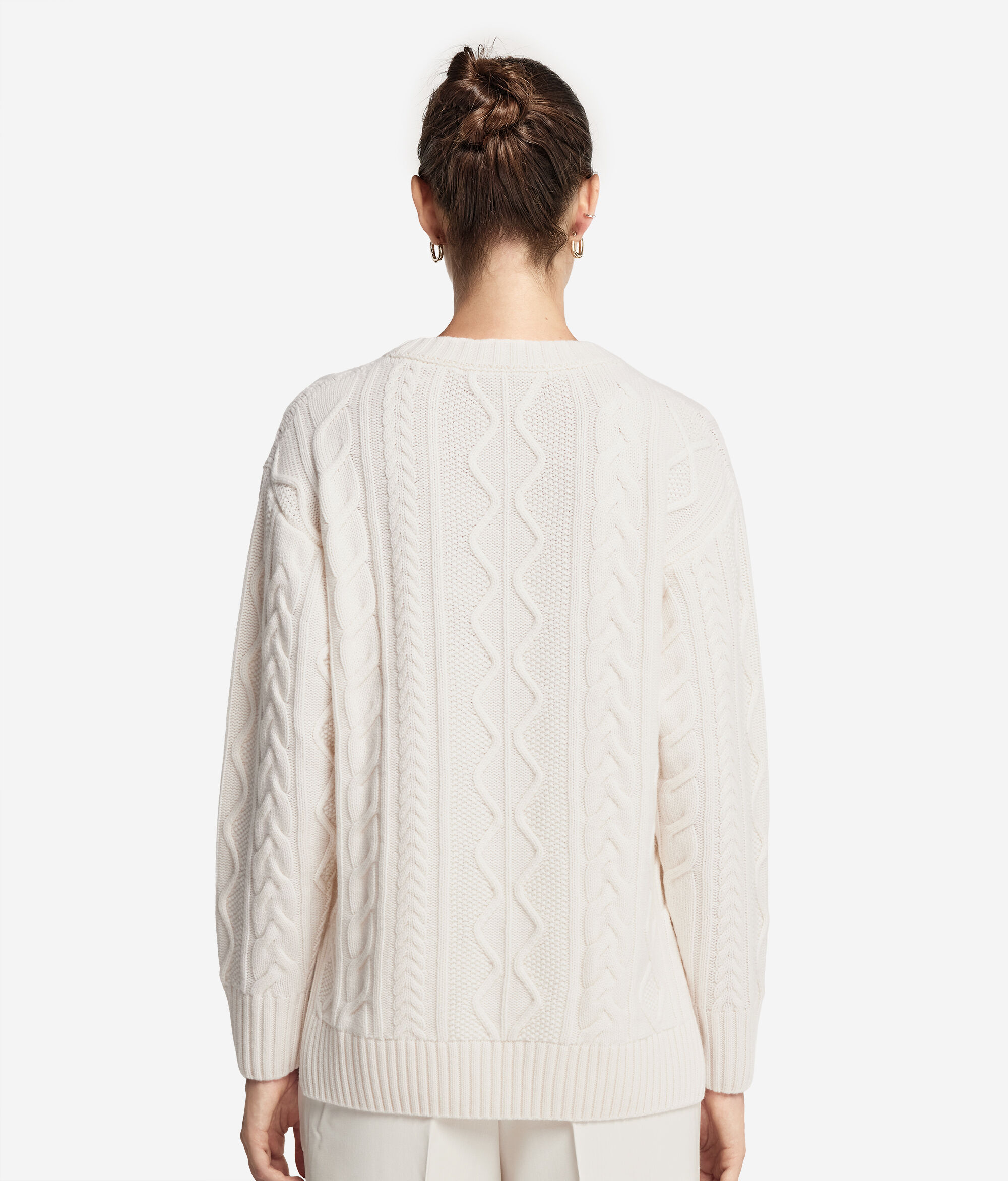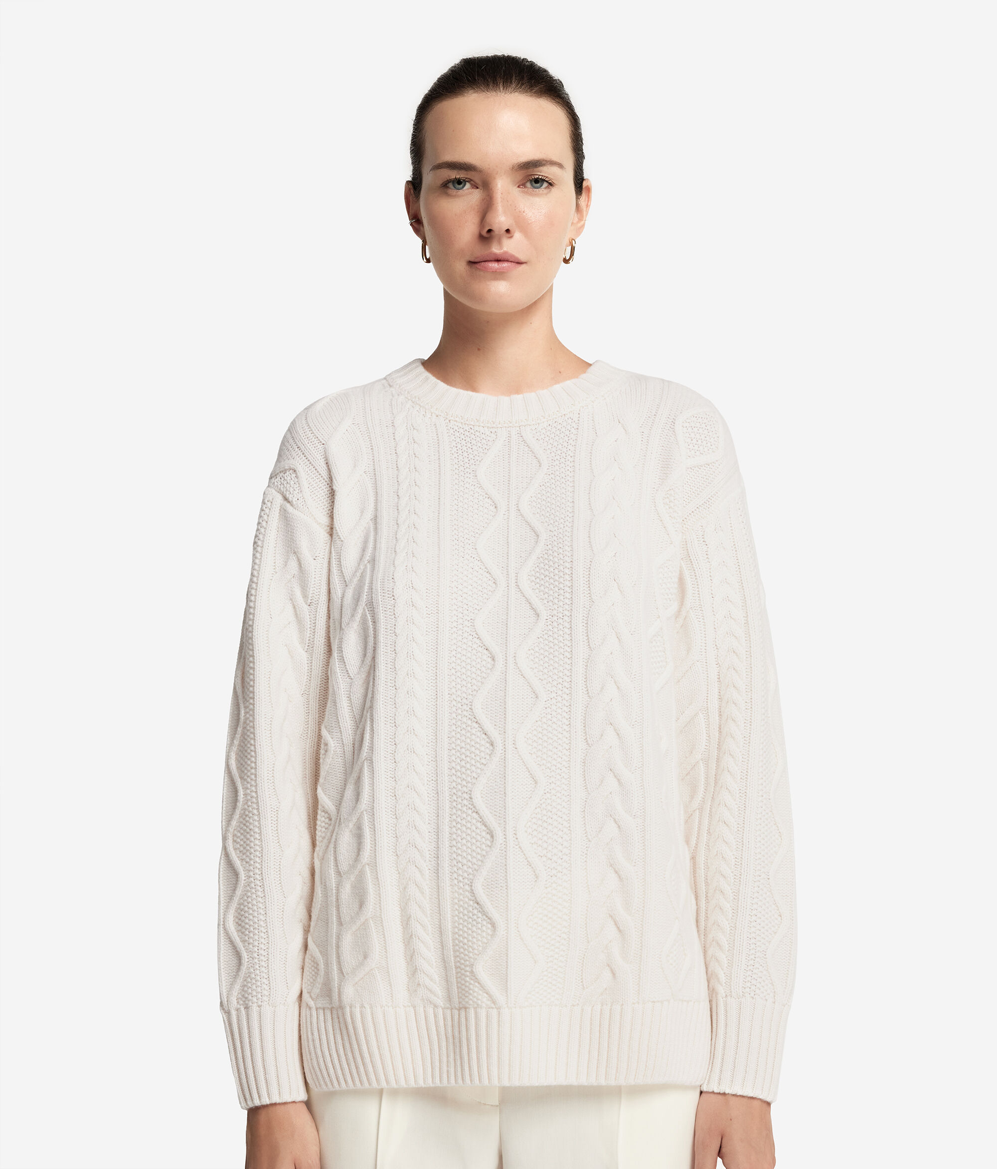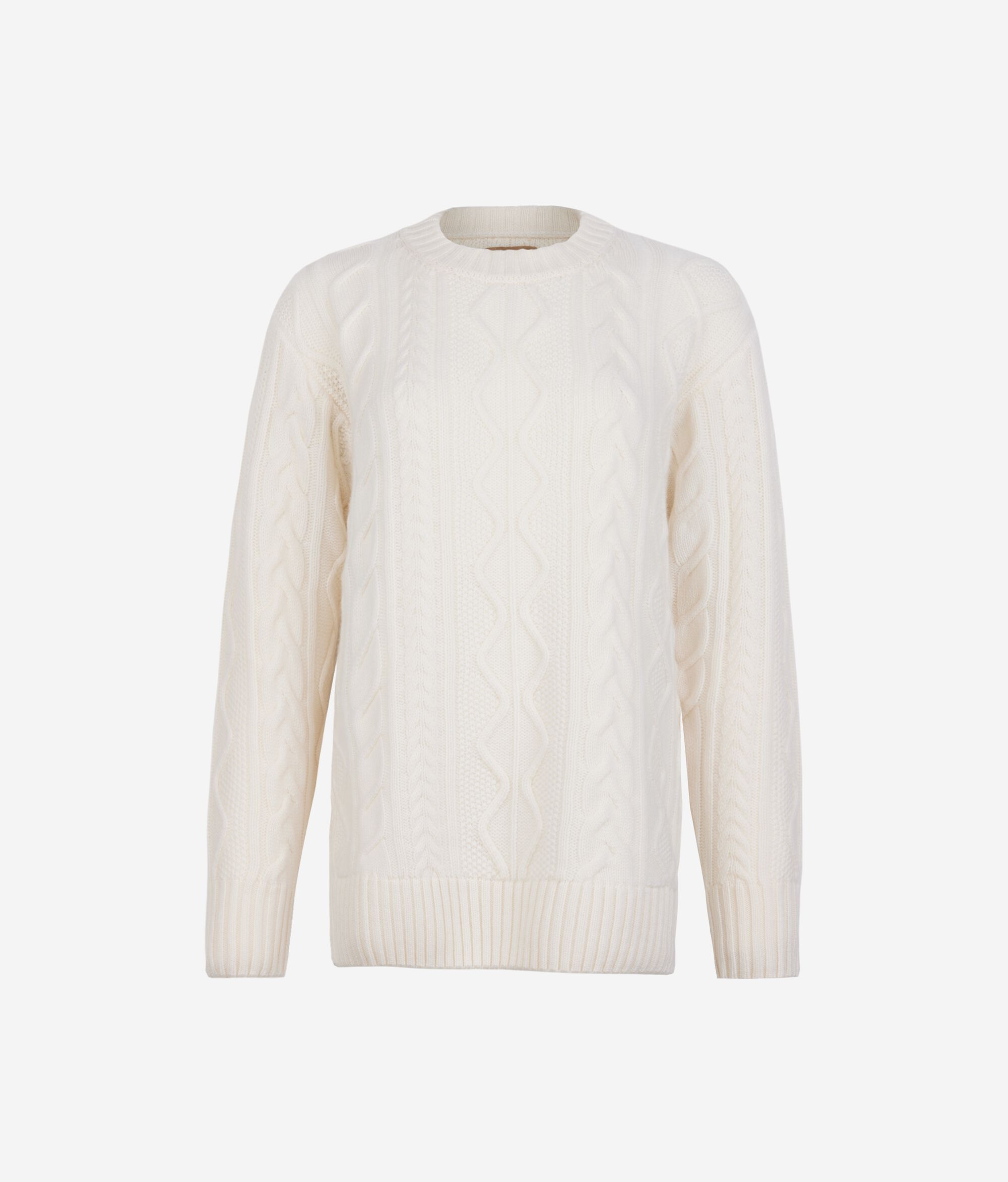 Created in fine Ultrasoft Cashmere, this round-neck jumper is the perfect combination of sophistication and softness. Its sophisticated cable pattern design adds a rich dimension to the touch and a ribbed finish on neckline, cuffs and hem. The dropped shoulders and loose wearability create a relaxed and modern air, making this garment ideal for facing those cooler days in style.