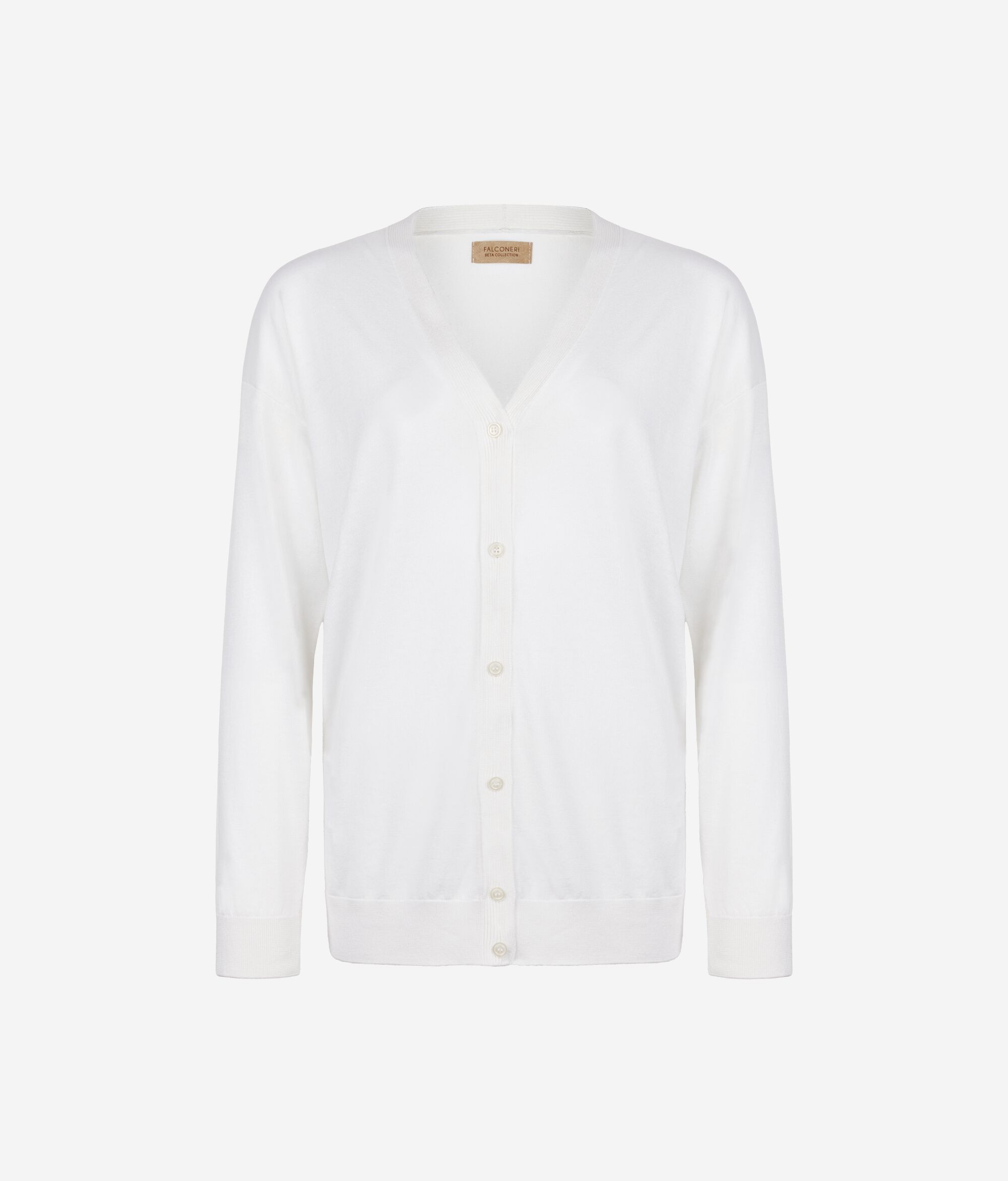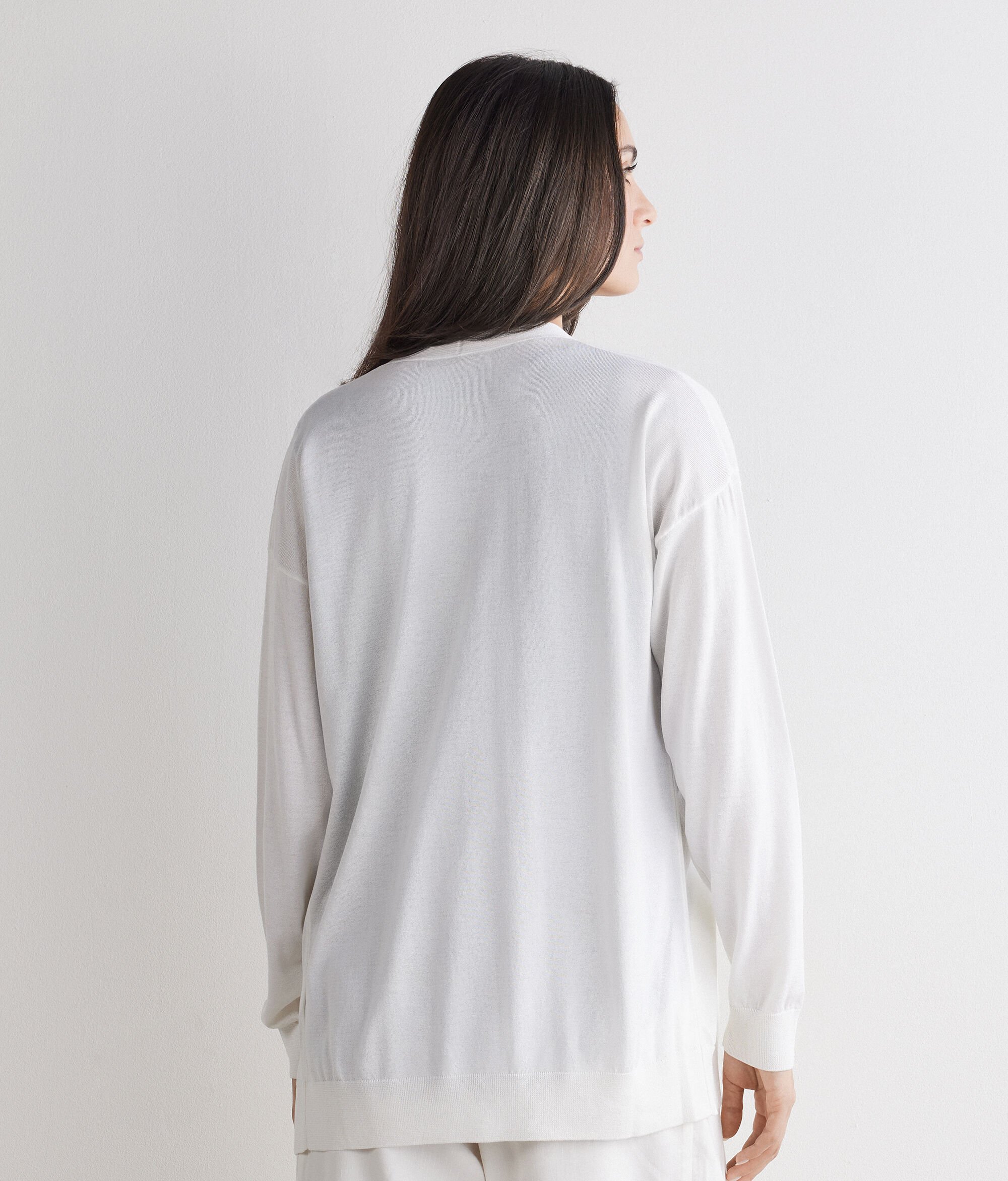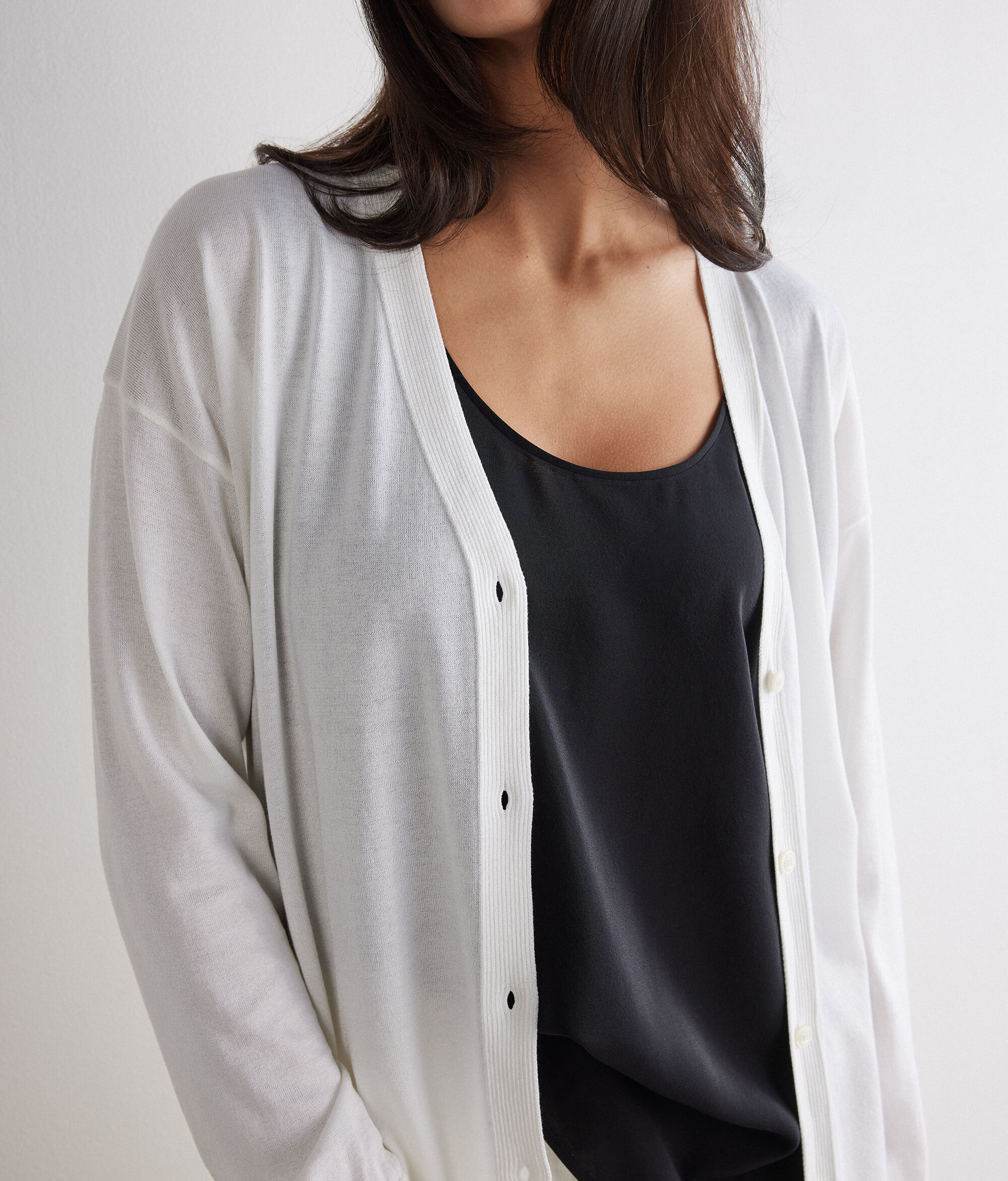 Styled in a fine blend of silk and cotton, this cardigan is the perfect balance of softness and lightness. The ribbed trim on the neckline, shoulders and hem enhances the enveloping nature of the yarn, giving the simple design of the garment both texture and a touch of elegance.