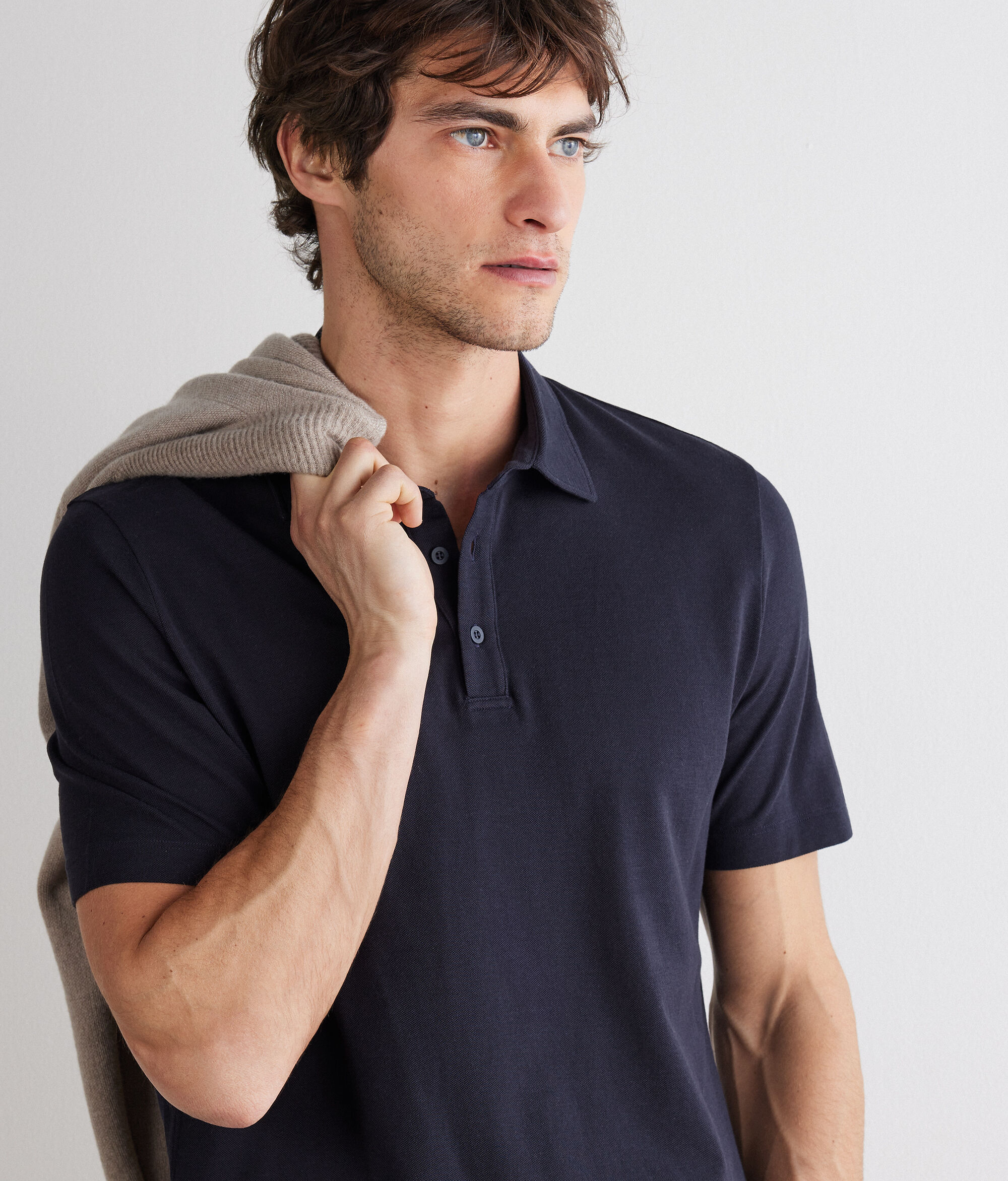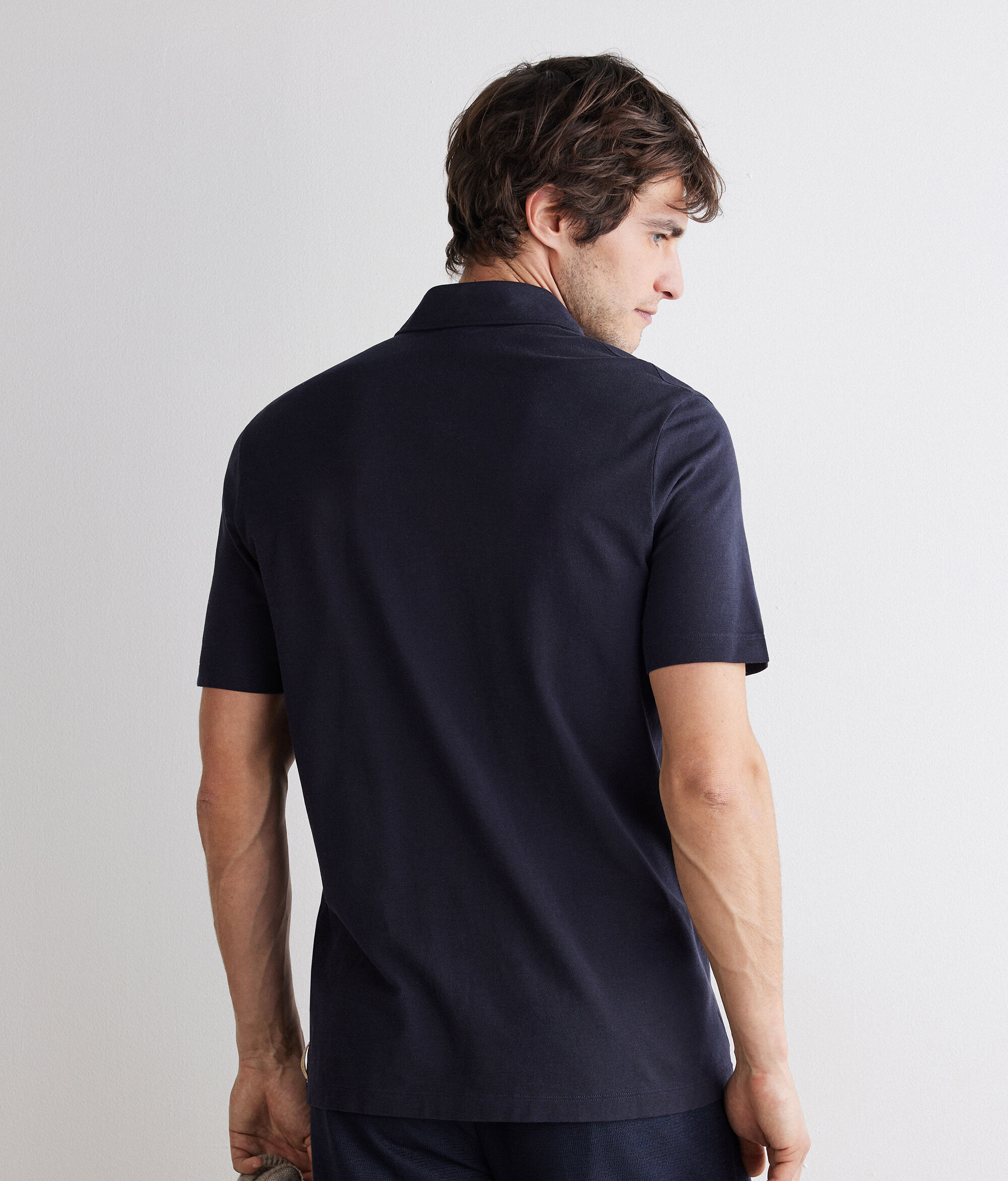 Questa polo è realizzata in jersey piquet di cotone e seta (83% cotone, 17% seta). Il capo presenta spacchi laterali e un’etichetta con logo in microfibra effetto suede.