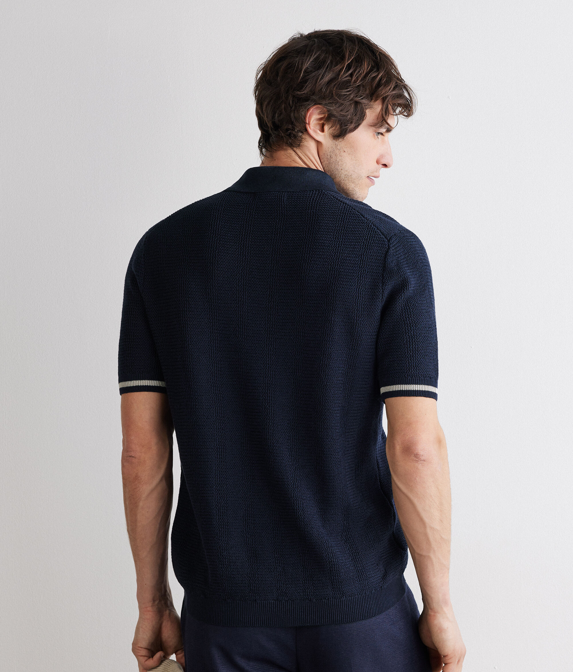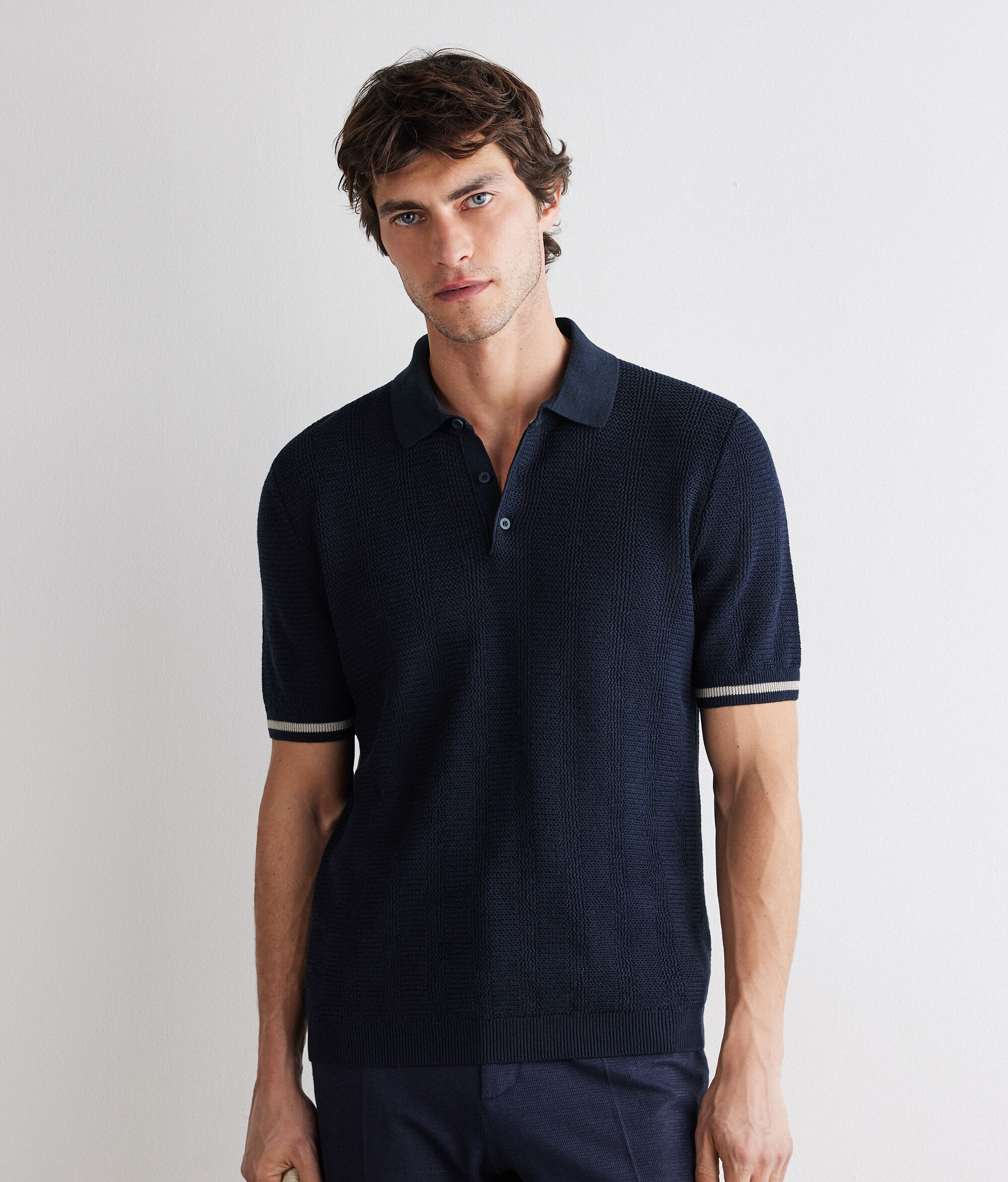 La lavorazione a righe verticali mosse caratterizza questa polo realizzata in cotone e lino (61% cotone, 39% lino). Il motivo a contrasto colore sulle maniche valorizza l’estetica del capo.