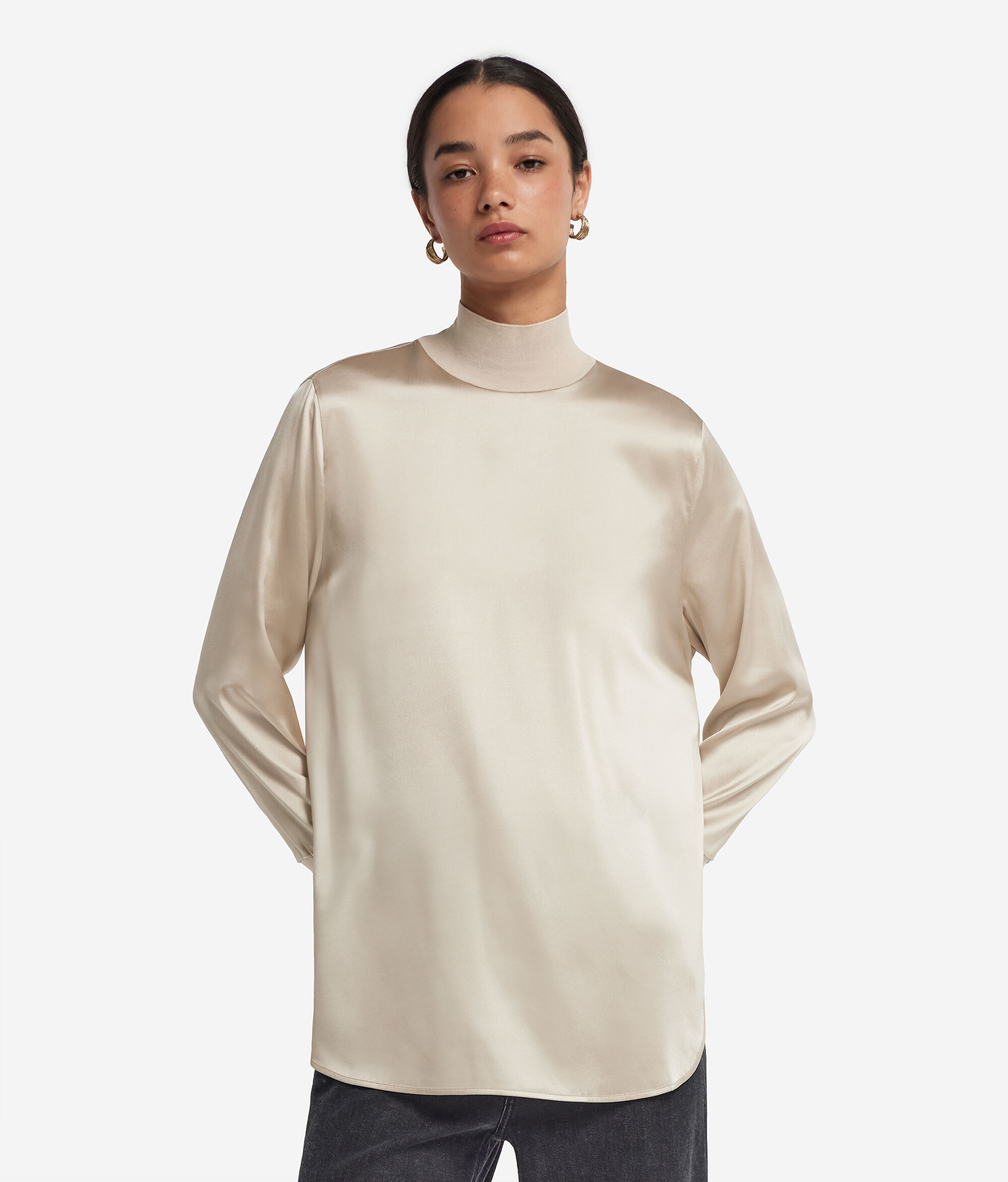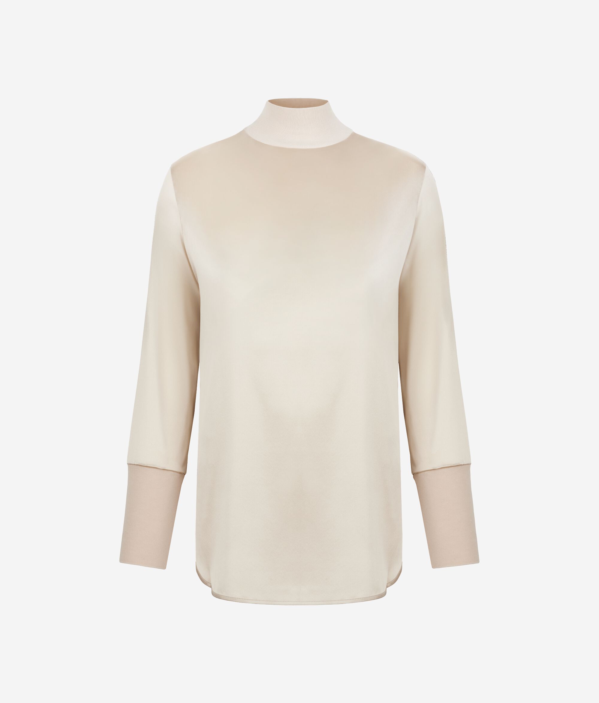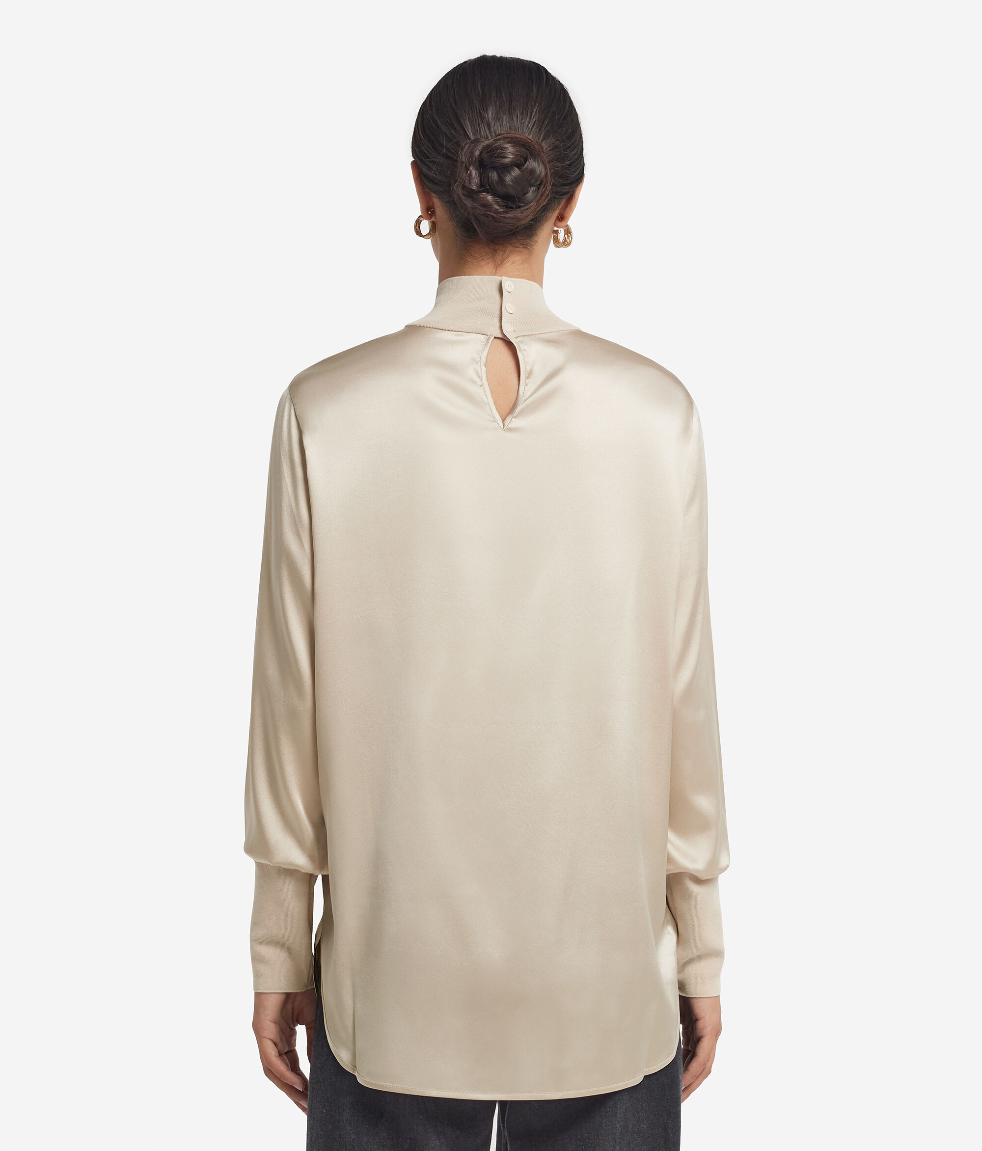 Soft volumes and fine fabrics come together in a blouse with essential elegance. Made of silk satin, it features a high-neck collar and jersey cuffs that delicately define the soft sleeves. The rounded hem with slits gives lightness, while the teardrop opening on the back adds a feminine and functional touch.