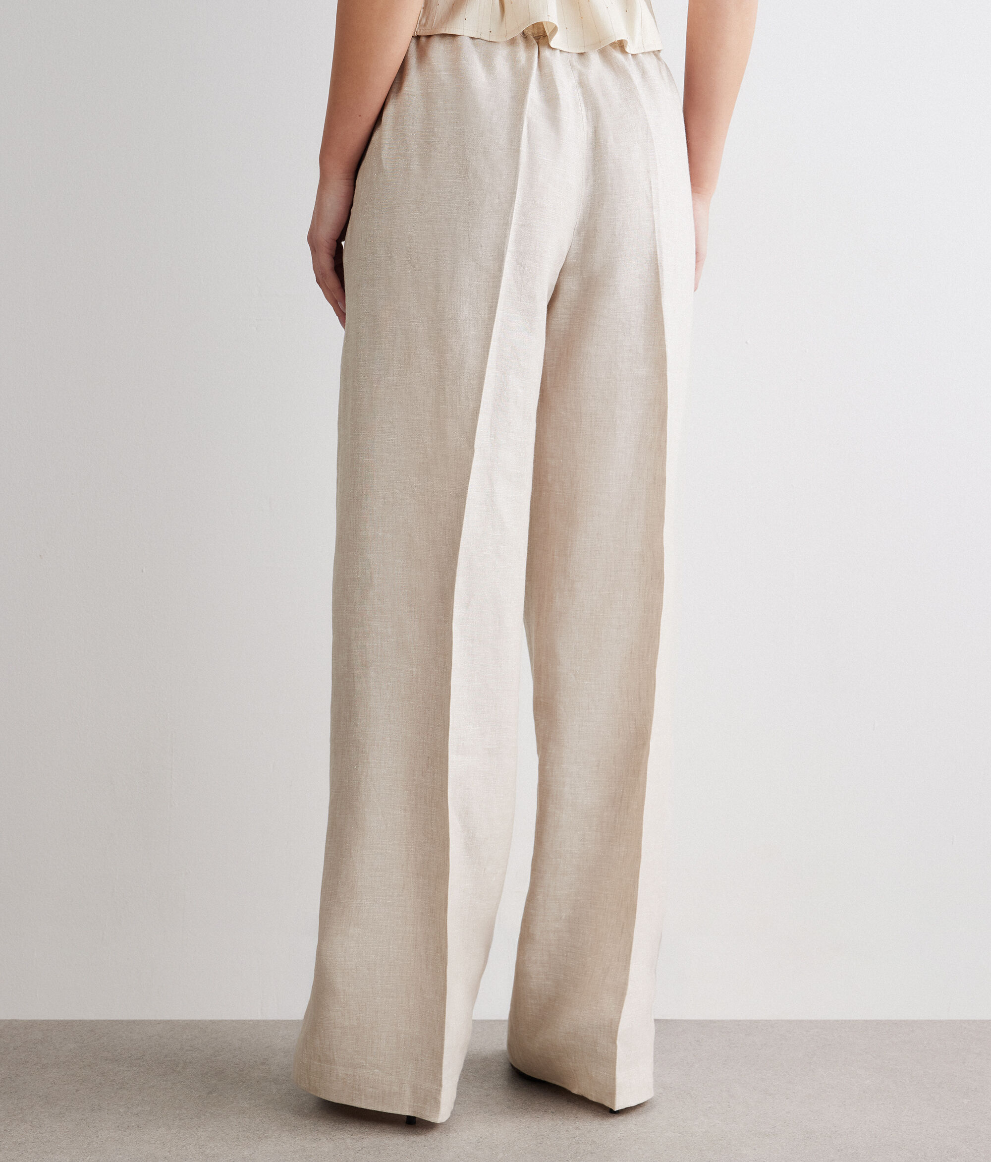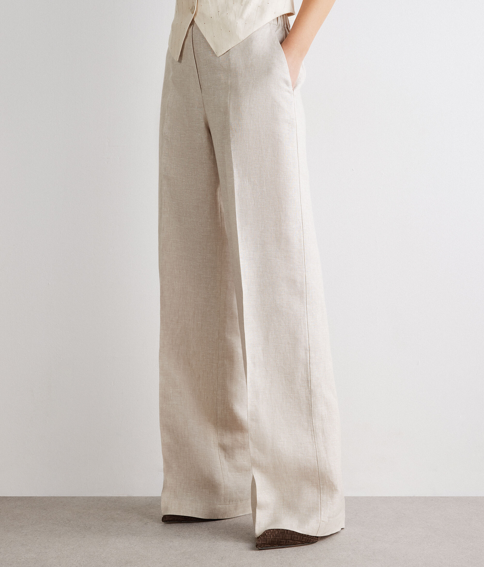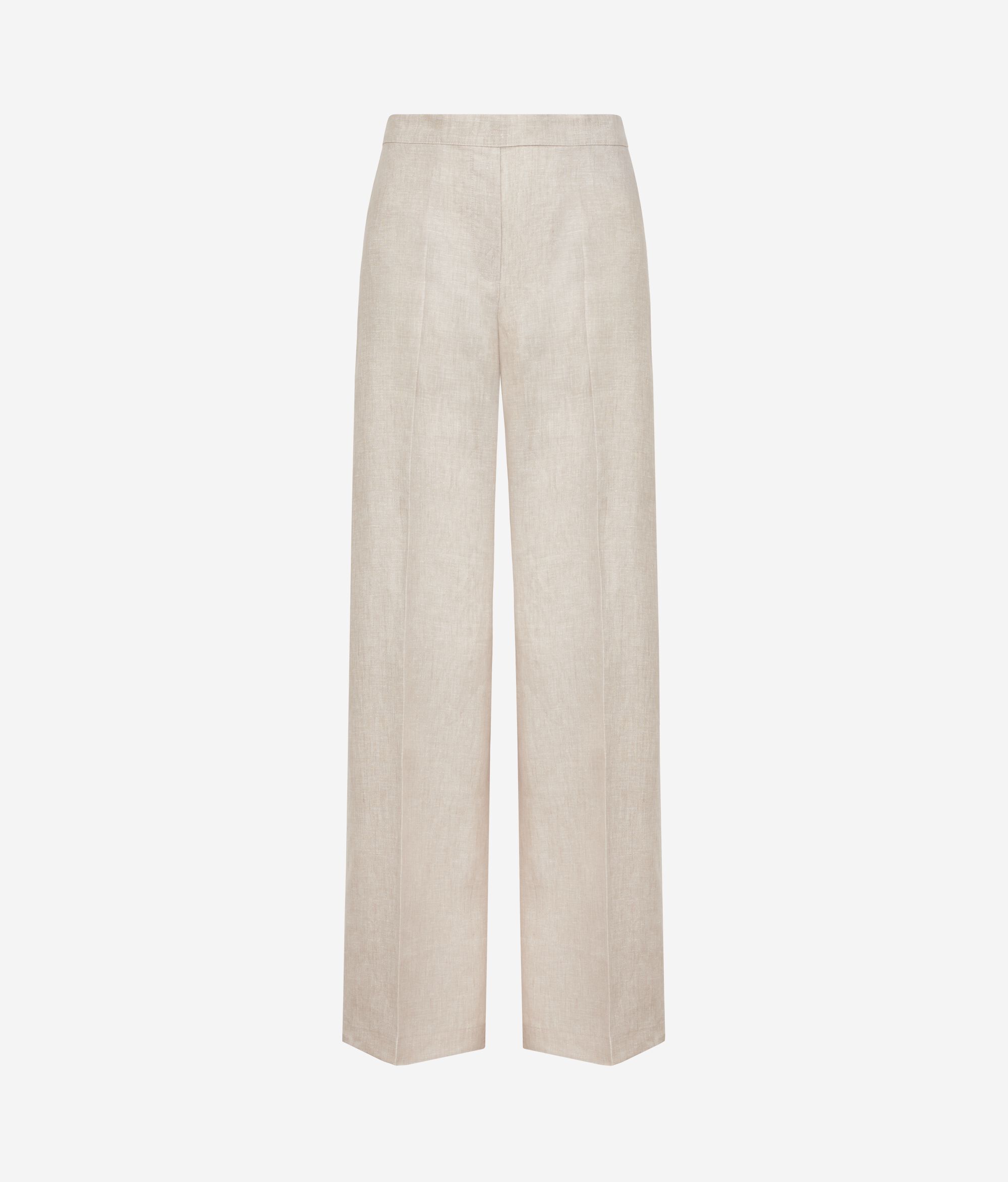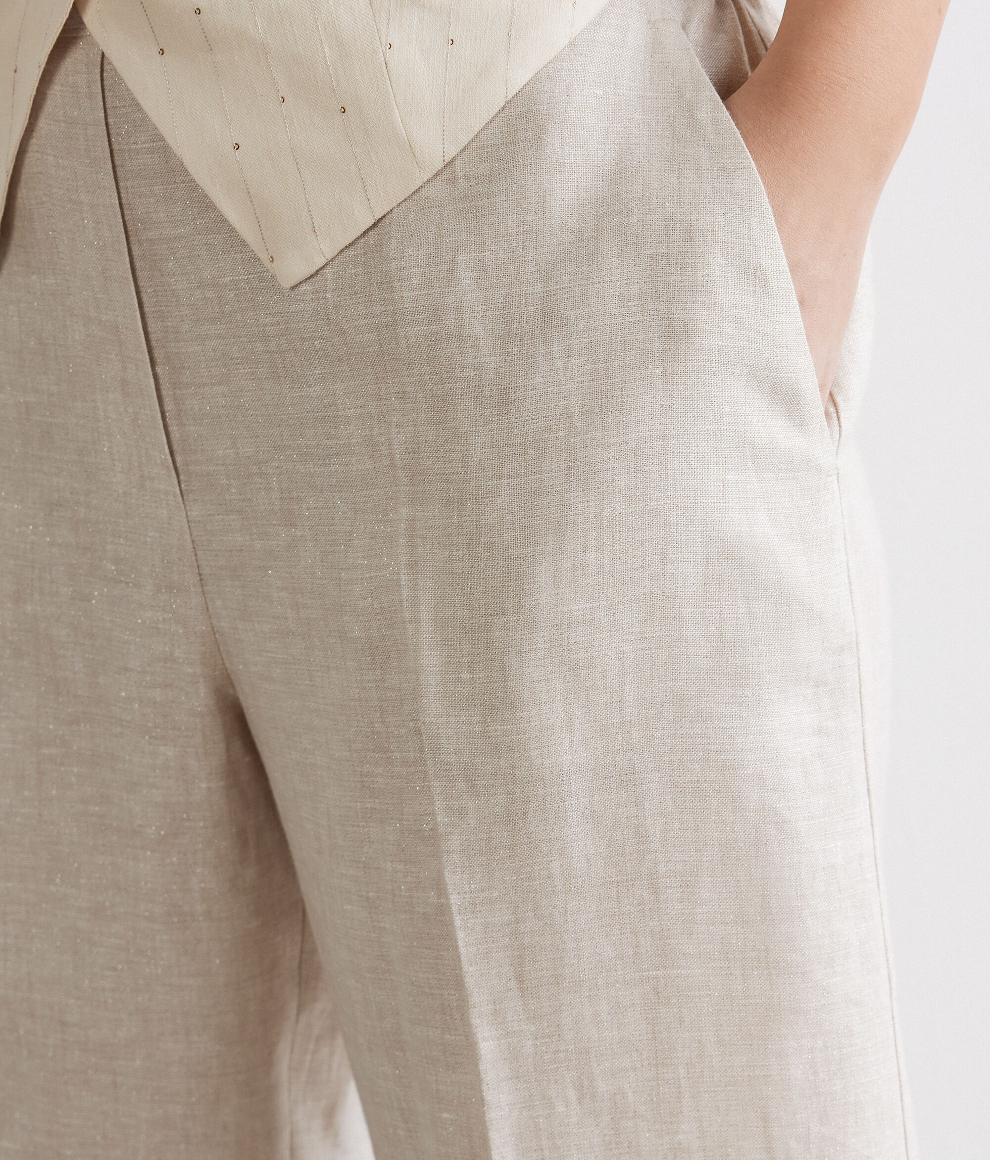 Pantalone realizzato in tela di lino impreziosito da filato lamé. Il taglio dritto e lo stiro piega centrale caratterizzano il modello d'ispirazione sartoriale.