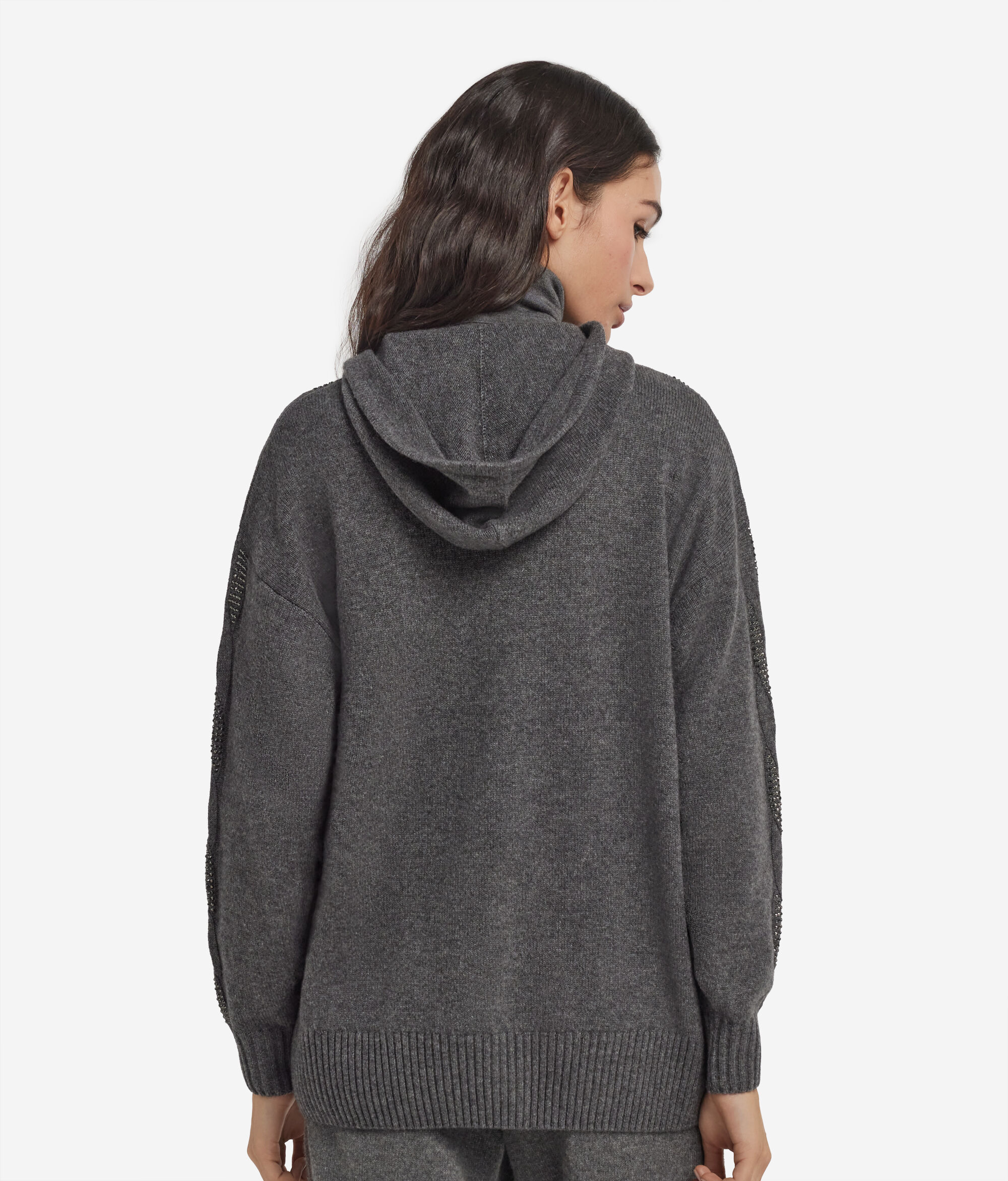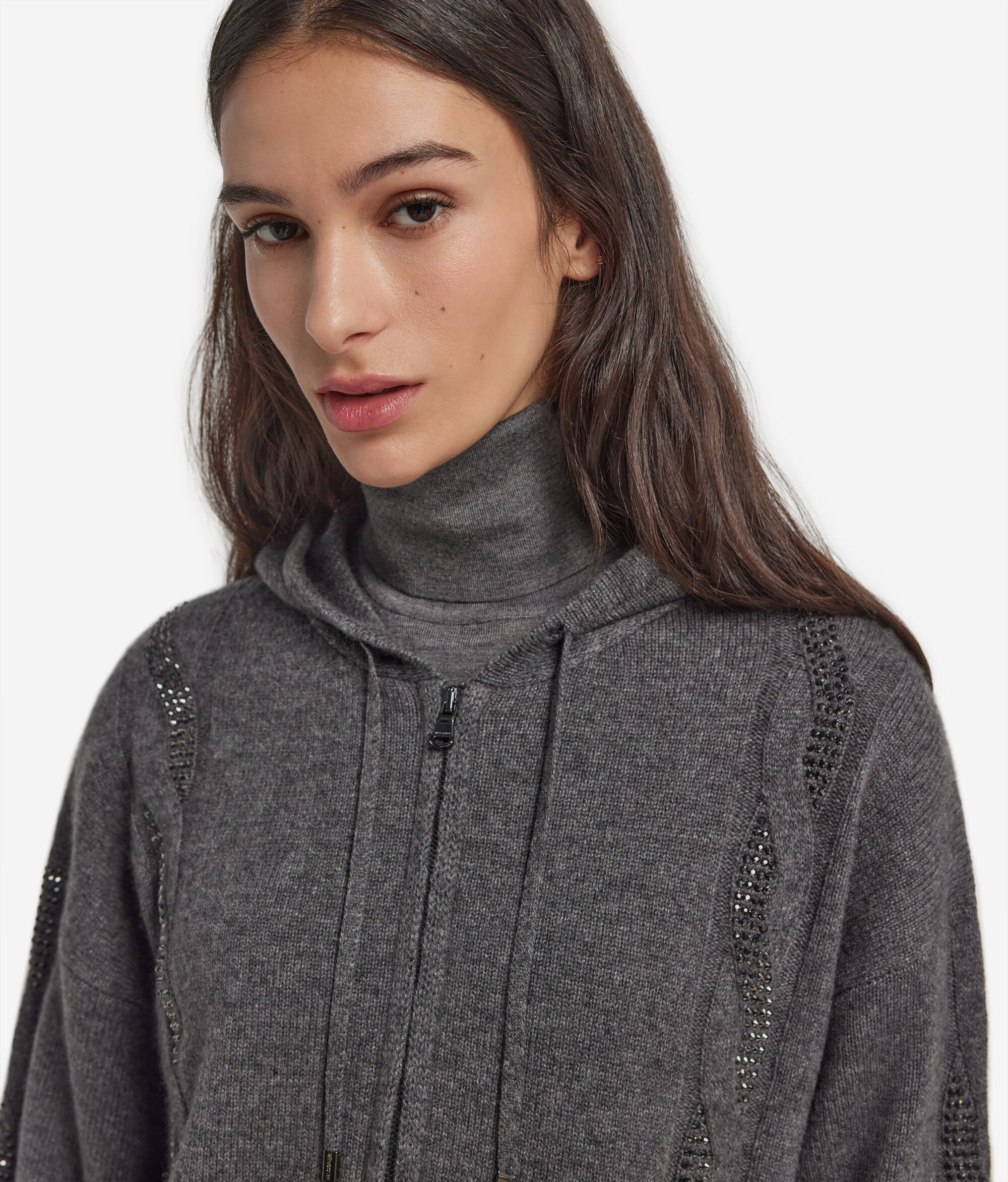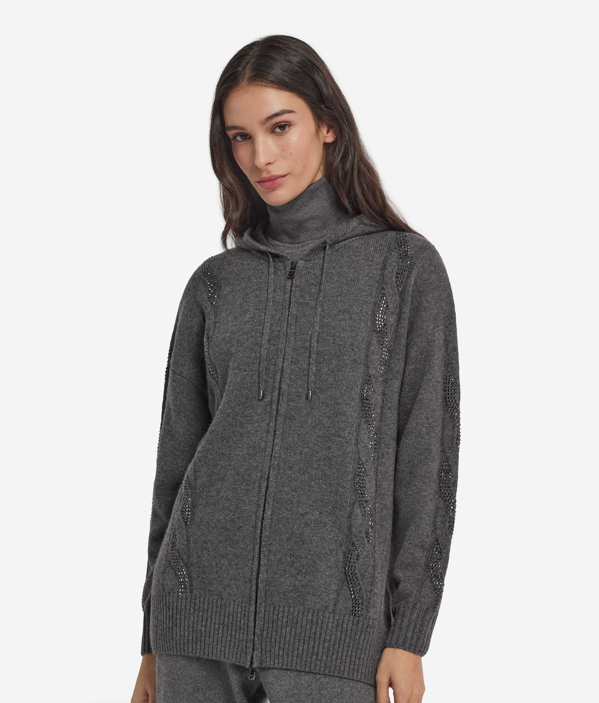 Soft and enveloping, this sweatshirt, crafted from precious Ultrasoft Cashmere, is the perfect example of everyday luxury. The cable knit on the front, embellished with delicate rhinestones, elegantly catches the light, transforming a casual garment into a unique piece. The drawstring hood and metal zip opening add a modern, urban touch, while the ribbed cuffs and hem complete the design.