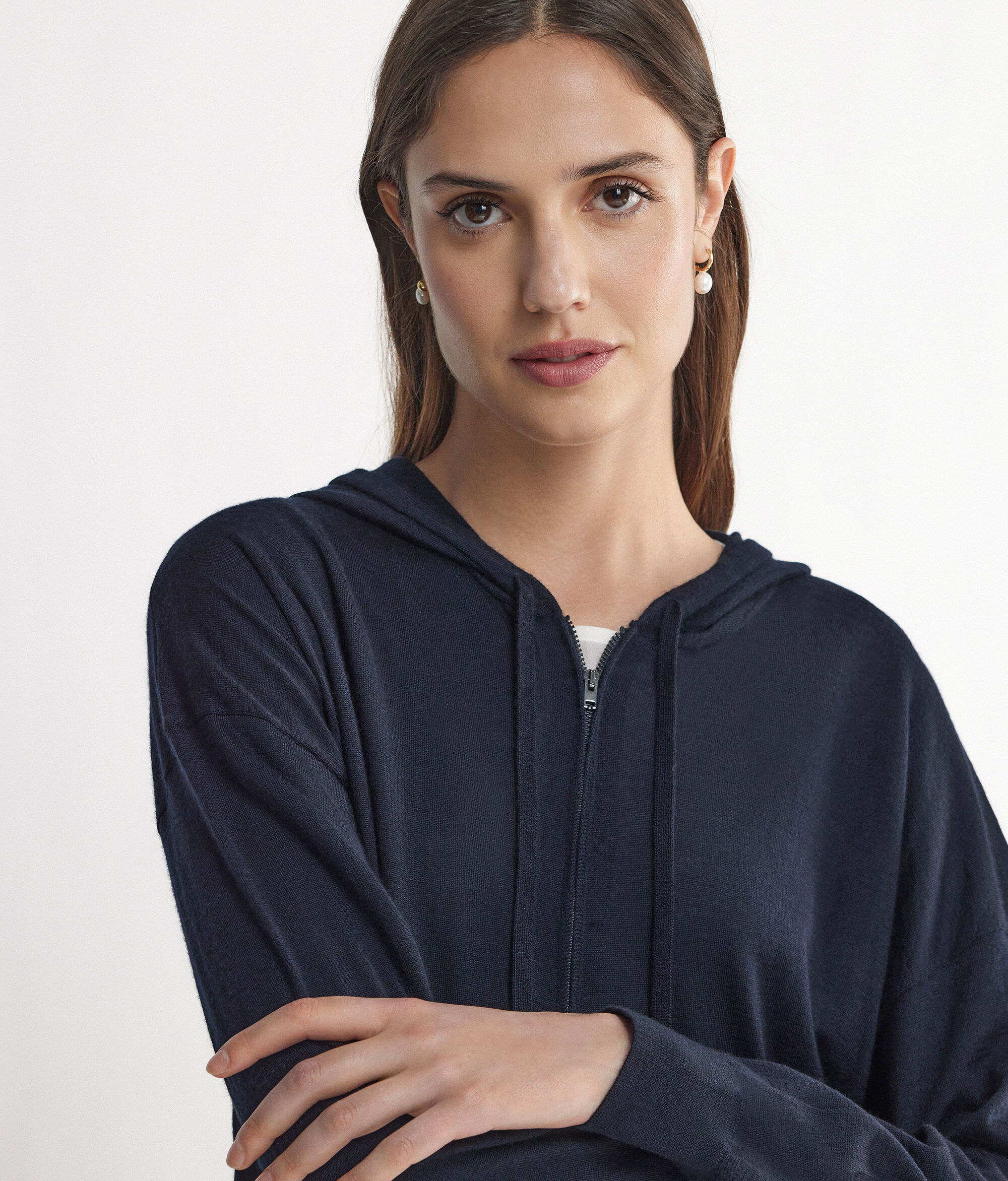 Bluza wykonana z kaszmiru Ultrafine z kapturem. Rozpinana na zamek błyskawiczny na całej długości, posiada otwarte boczne kieszenie i lekko obniżoną linię ramion. Model o luźnym kroju.