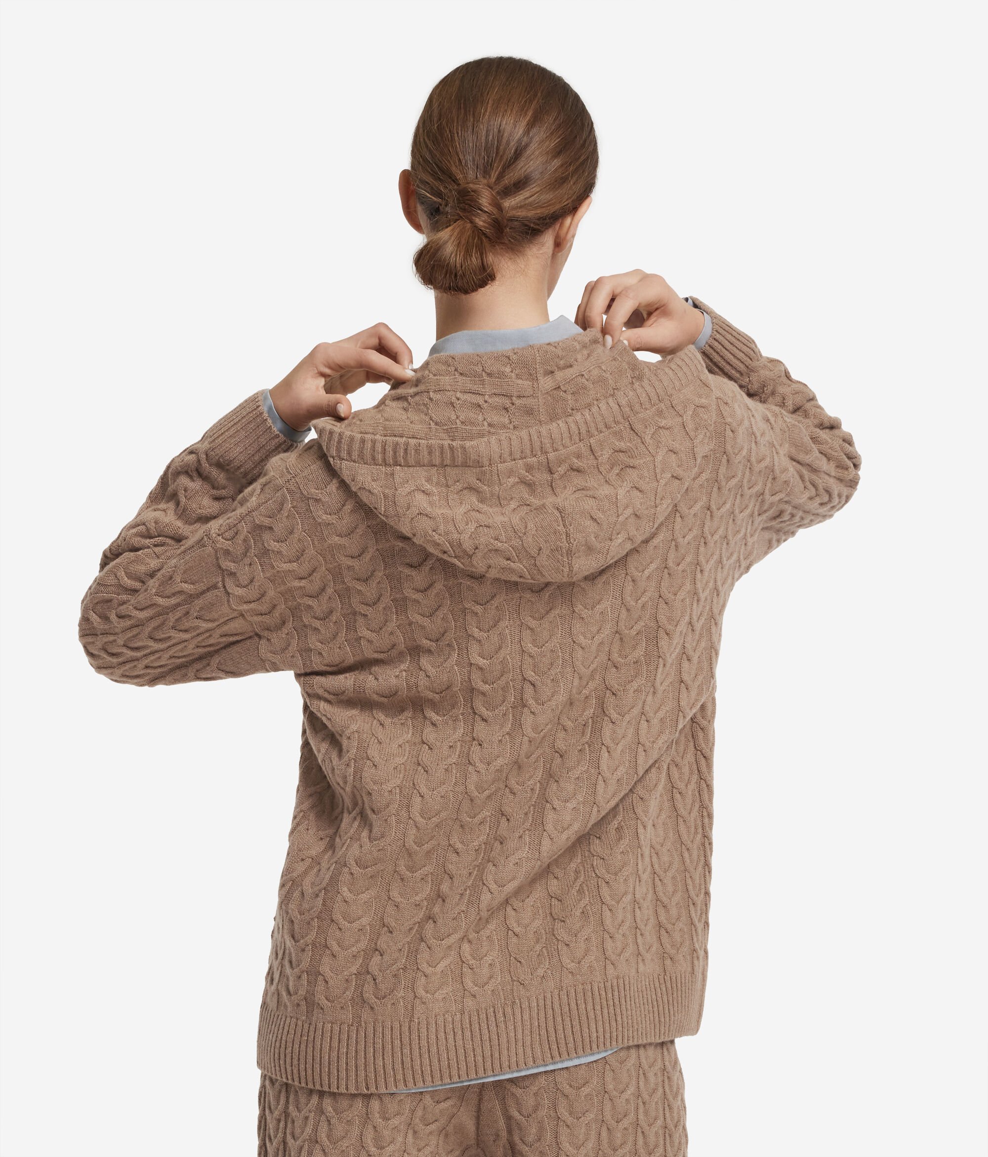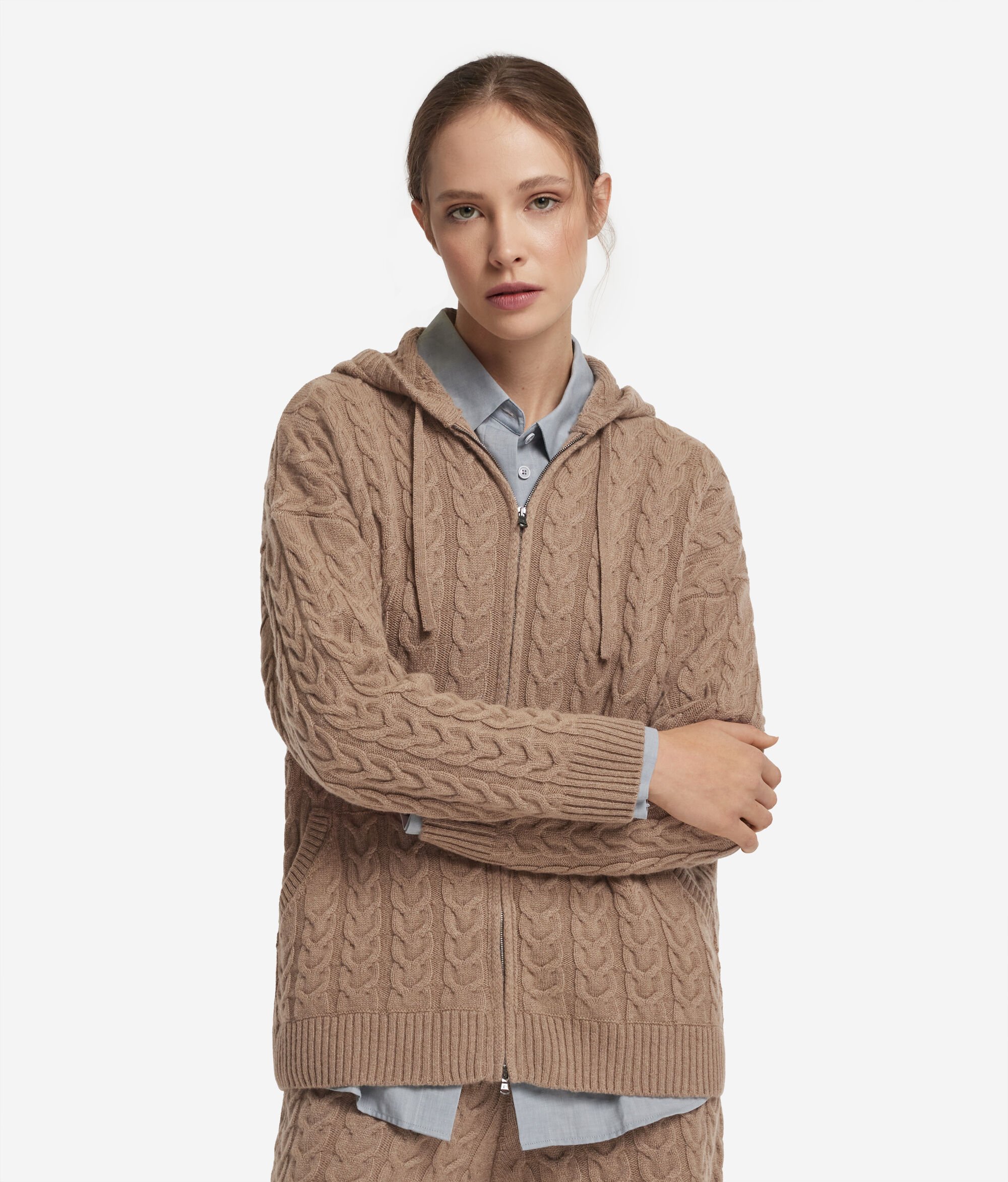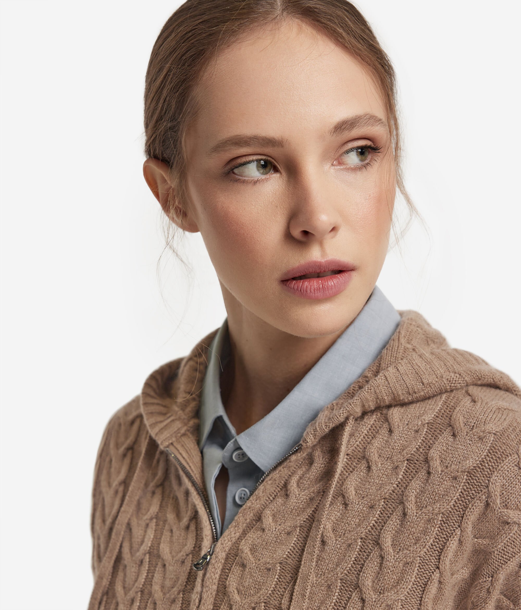Bluza z kaszmiru Ultrasoft jest swobodna i elegancka, łączy w sobie miękkość włókna ze współczesnym wzornictwem. Splot warkoczowy podkreśla fakturę modelu, uzupełnionego kapturem ze ściąganym troczkiem i zapięciem na suwak. Lekko obniżona linia ramion i luźny krój zapewniają swobodną wygodę, a ściągacze u dołu i przy mankietach podkreślają linię. Sięga do bioder, łączy w sobie praktyczność i dyskretny luksus, idealna do eleganckich, a zarazem nieformalnych stylizacji.