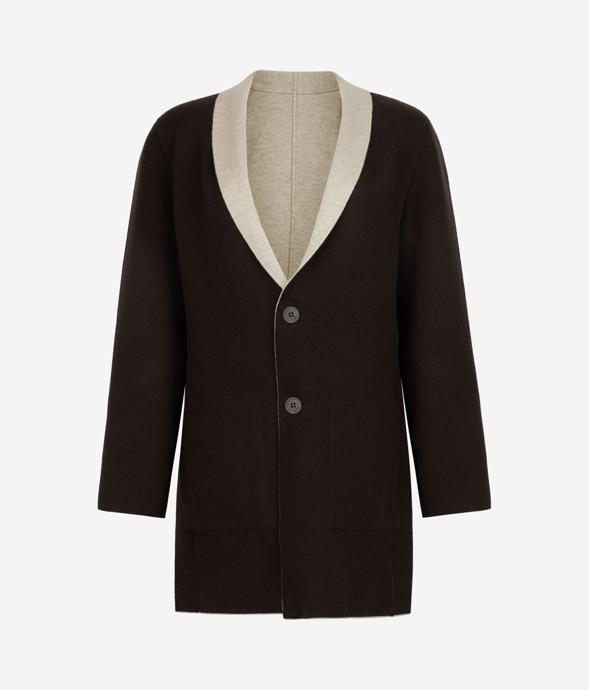Dwustronny płaszcz łączący w sobie dwie różne odsłony. Wykonany z miękkiej w dotyku dzianiny ściągaczowej z kaszmiru Ultrasoft o dwukolorowym wykończeniu zapewniającym wyrafinowaną grę kontrastów. Szalowy kołnierz i zapięcie na dwa guziki podkreślają elegancką linię, a kieszenie po obu stronach zwiększają uniwersalność tego modelu. Dzięki regularnemu krojowi i płynnym liniom doskonale odnajduje się w przejściowej porze roku, zapewniając codzienną elegancję.