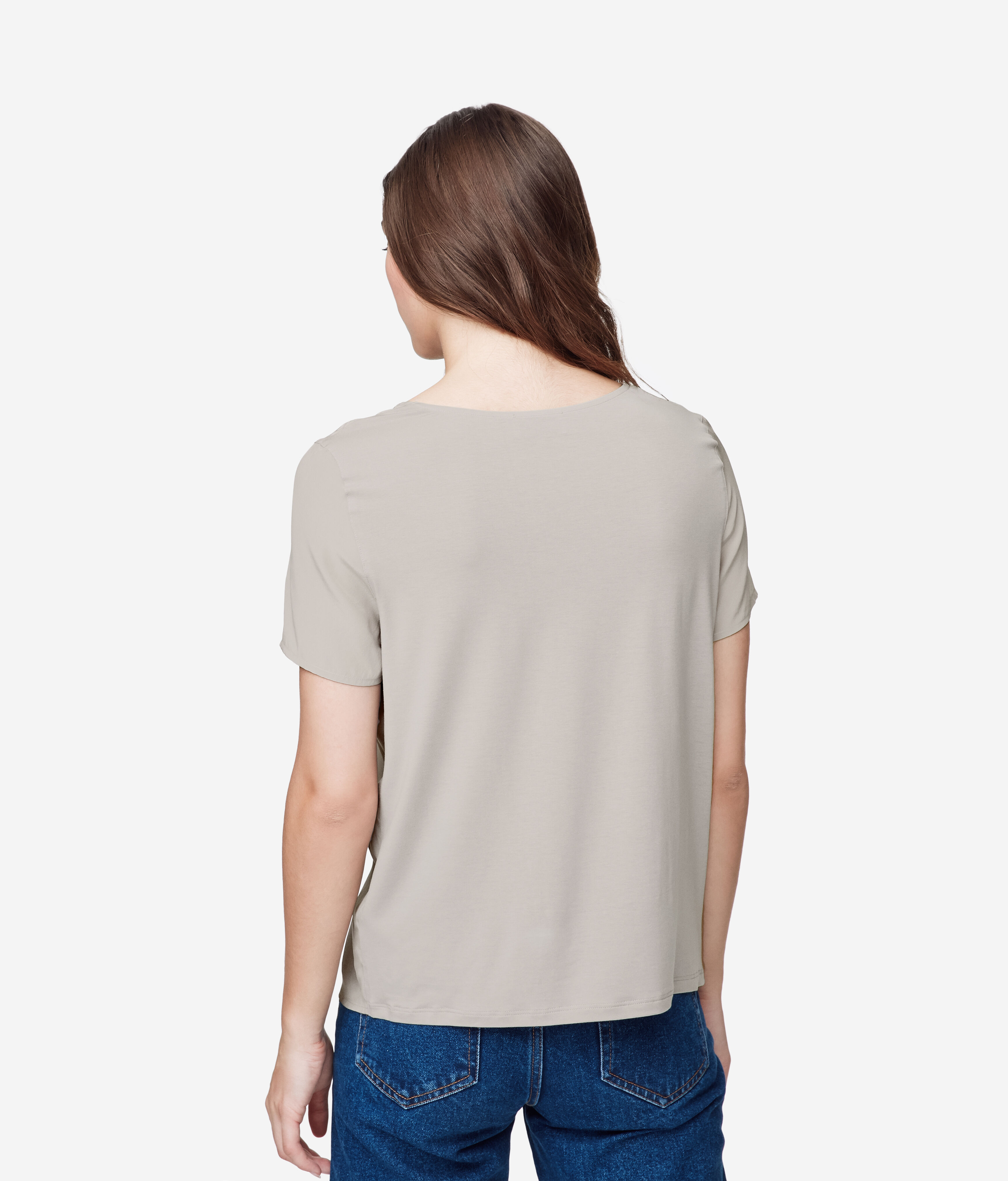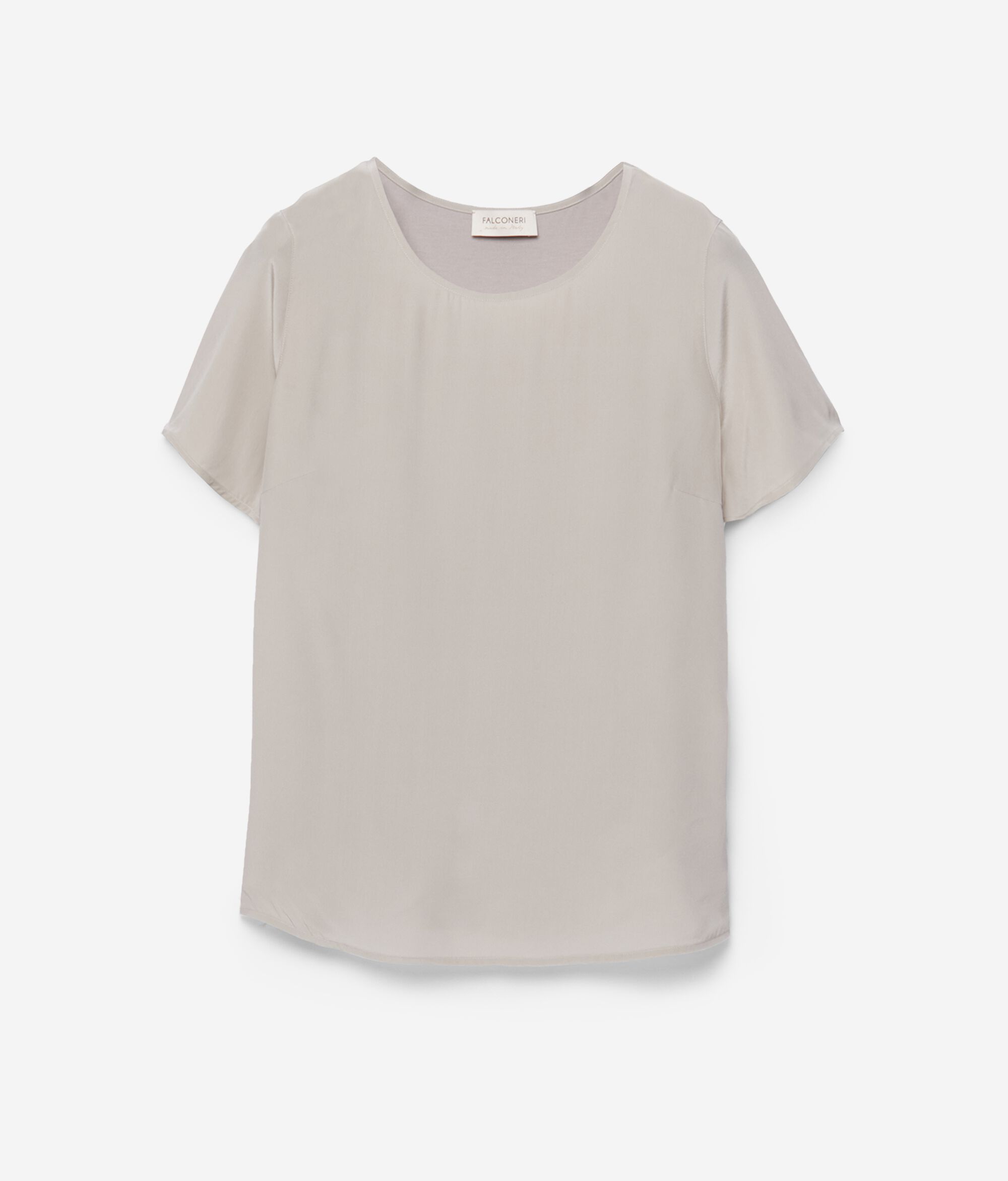 Finezyjna faktura krepdeszynu z czystego jedwabiu podkreśla proporcje tego t-shirtu z okrągłym dekoltem. Tył wykonany z modalu tworzy wyrafinowany kontrast tkanin, zapewniając praktyczność i przyjemne uczucie w kontakcie ze skórą. Płynny krój otula sylwetkę, kusząc prześwitującą fakturą. Prosty krój sprawia, że doskonale nadaje się pod marynarkę, dodając dyskretnej i ponadczasowej elegancji każdej stylizacji.