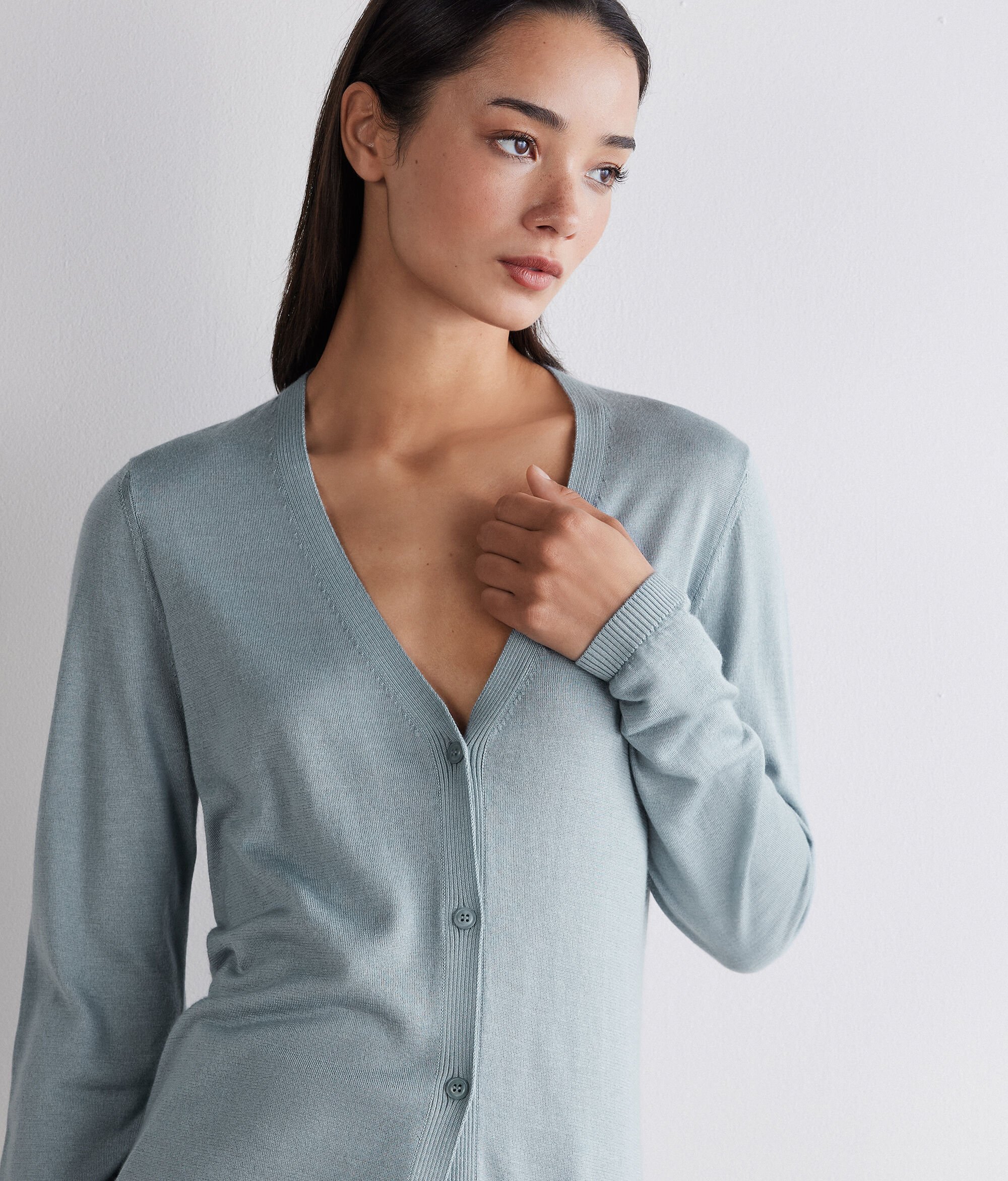 Miękkość kaszmiru łączy się z połyskiem jedwabiu, tworząc sweter o ponadczasowym charakterze. Idealny do warstwowych stylizacji, z dekoltem w serek, zapięciem na guziki z przodu i ściągaczami. Regularny krój zapewnia wygodę i harmonijną sylwetkę.