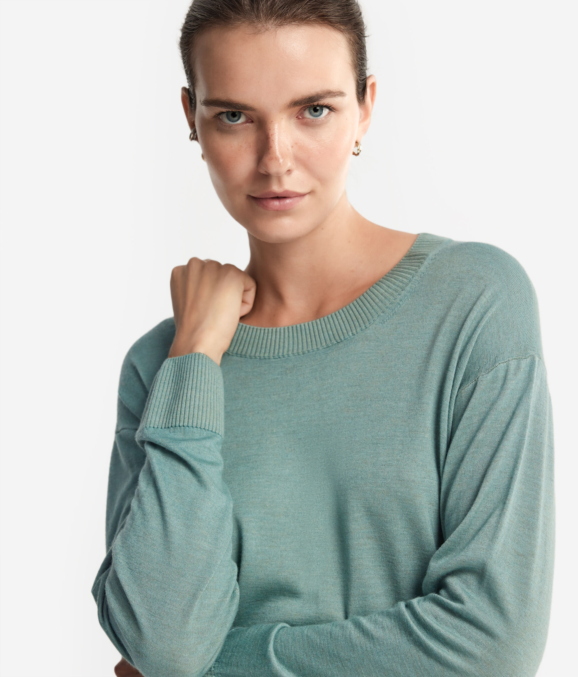 Sweter z okrągłym dekoltem wykonany z kaszmiru Ultrafine to model z długim rękawem, który charakteryzuje się prążkowanym wykończeniem dekoltu, mankietów i dołu. Wyróżnia się bocznymi rozcięciami. Posiada lekko obniżone ramiona i luźny krój.