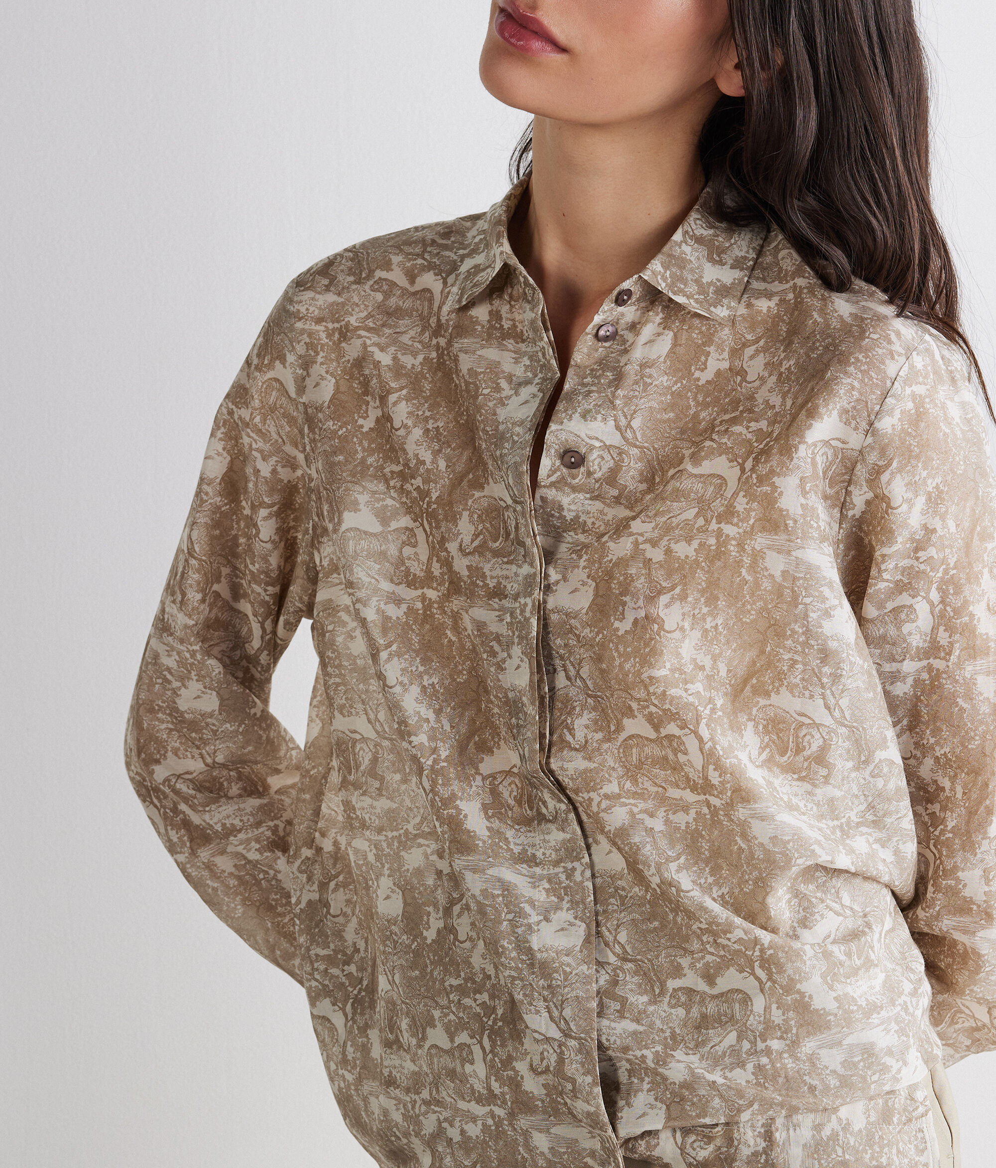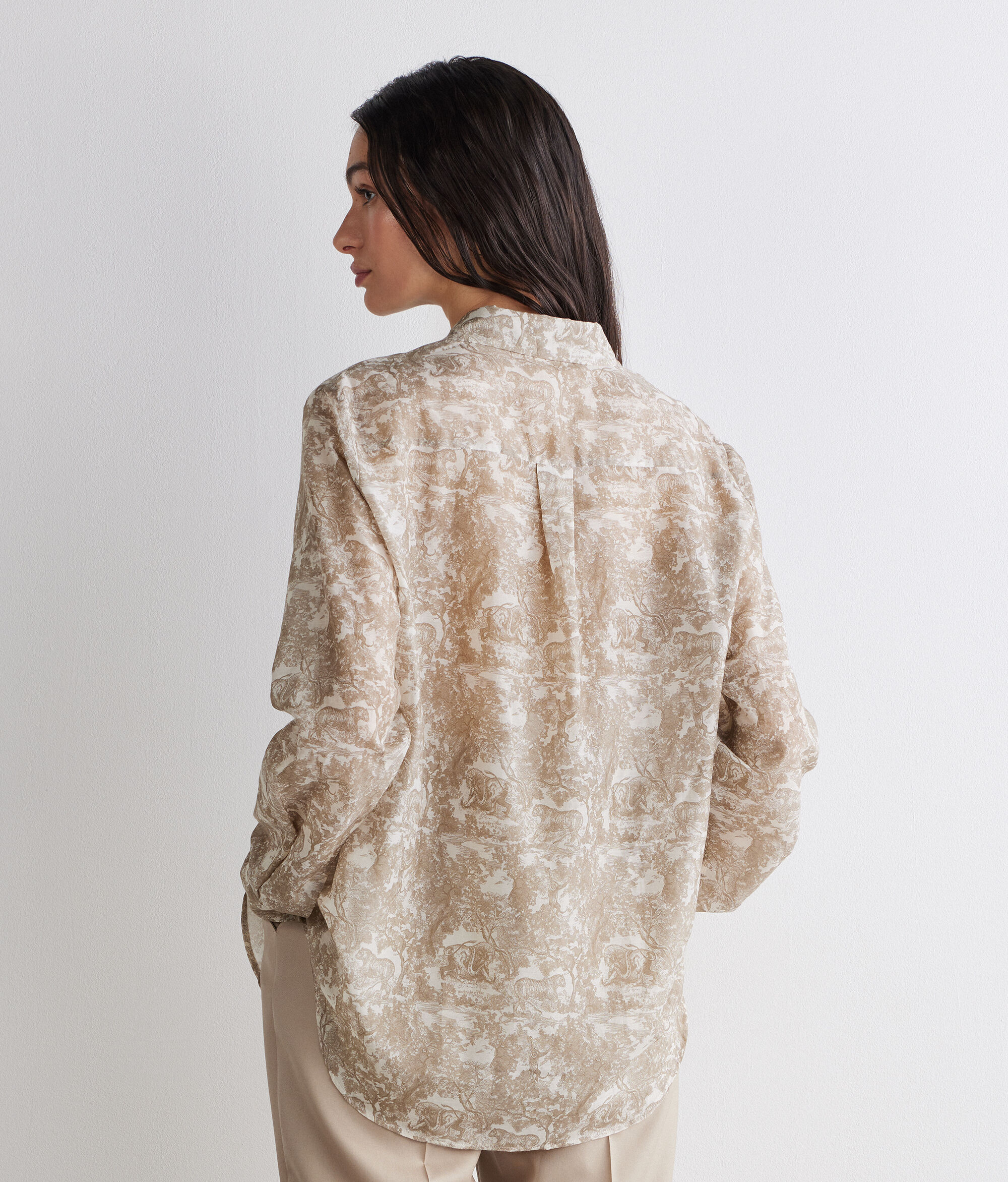 Lekkość bawełny i wzorzystego jedwabiu podkreślają elegancki i wyrafinowany charakter tej koszuli. Zakryte zapięcie z przodu podkreśla minimalistyczny charakter modelu, a zaokrąglony dół nadaje mu płynności i wyrazistości. Luźny krój i długość do bioder sprawiają, że jest to idealny element garderoby do tworzenia wyszukanych i wszechstronnych stylizacji, idealnych na każdą okazję.