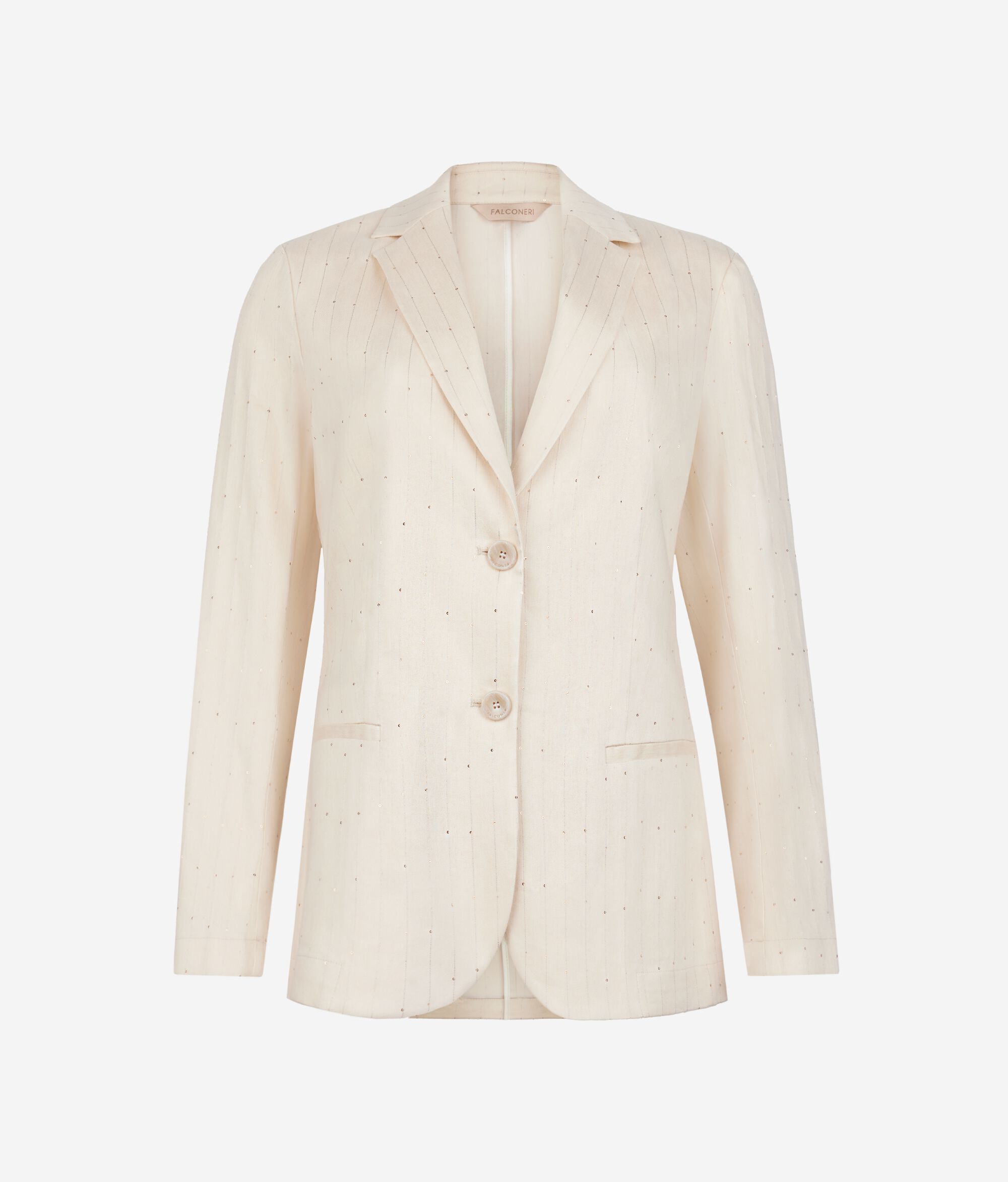 Elegancka marynarka z lnu i wiskozy ozdobiona kontrastowymi cekinowymi prążkami. Klasyczny krój z wykładanymi klapami i jednorzędowym zapięciem uzupełniają kieszenie wpuszczane z przodu i rozcięcie z tyłu na środku.