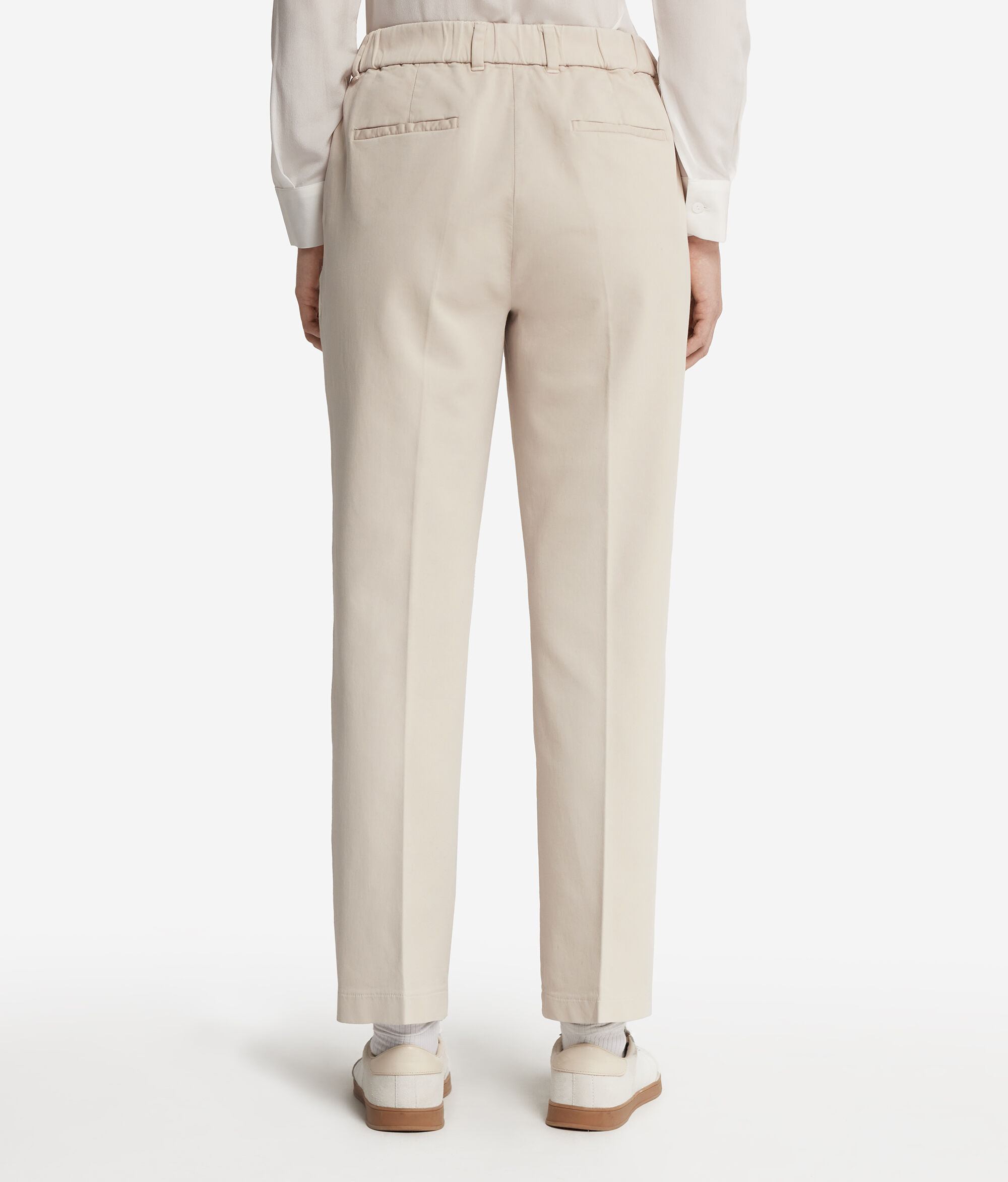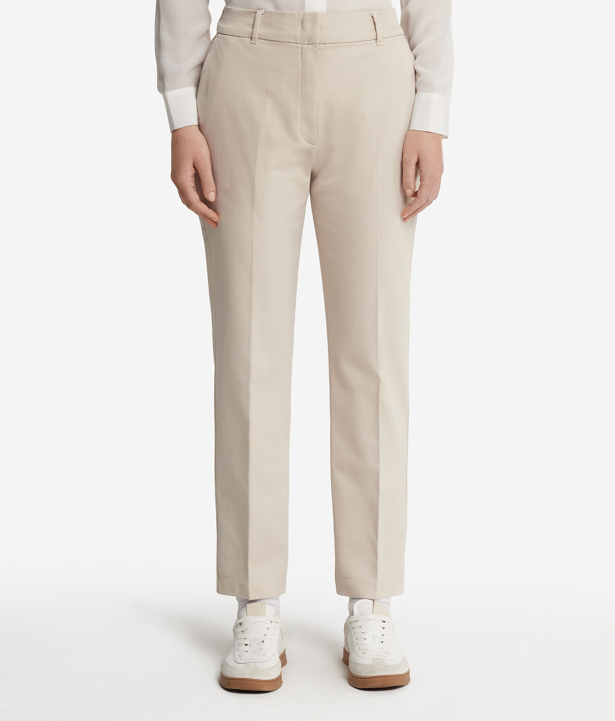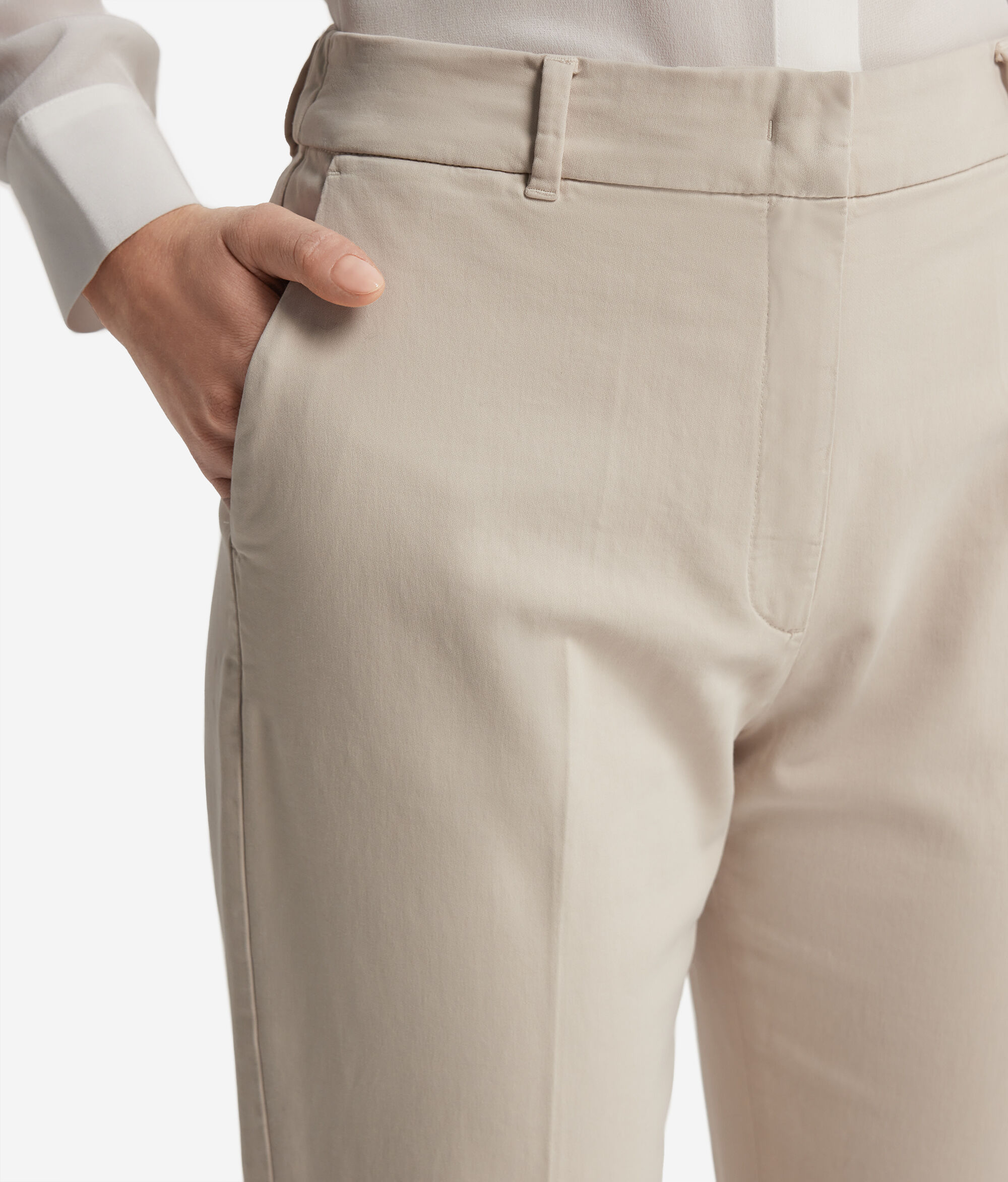 Spodnie cygaretki są kwintesencją ponadczasowej elegancji i dyskretnego stylu. Minimalistyczny model z elastycznym pasem z tyłu oraz zapięciem na suwak i haftkę z przodu. Kieszenie umieszczone po bokach stanowią wyrafinowany i niepowtarzalny detal. Lekko dopasowany, regularny krój zapewnia kobiecy wygląd.