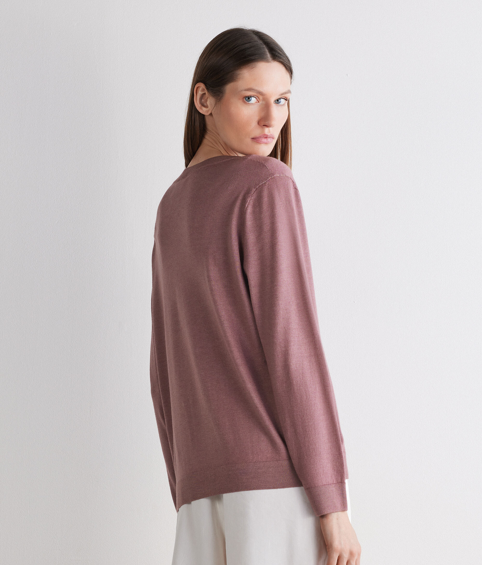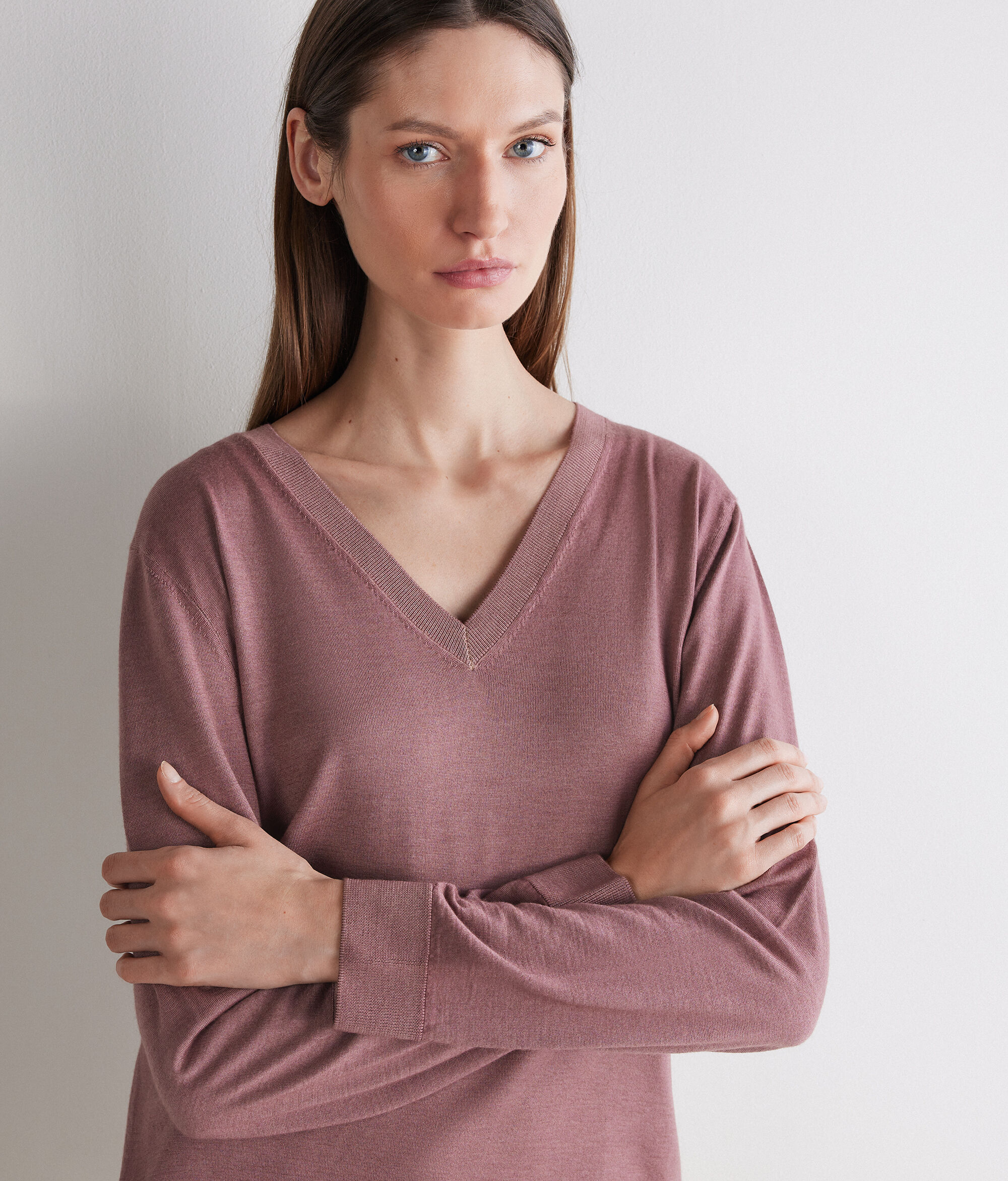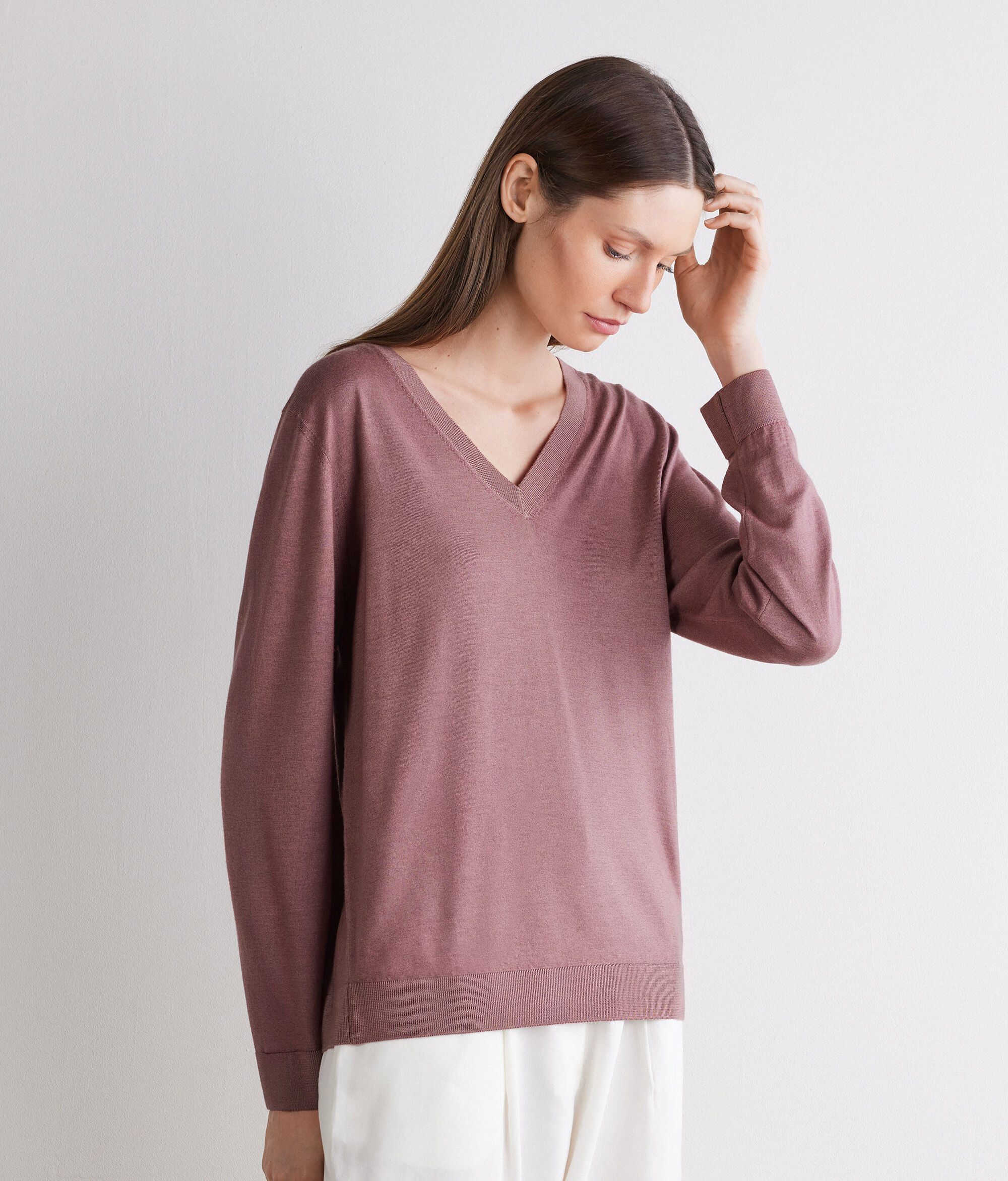 Wygodny sweter z dekoltem w serek wykonany z trykotowego kaszmiru Ultrafine wprowadzi powiew luksusu do Twojej garderoby. Model o minimalistycznym fasonie z prążkowanym wykończeniem na dekolcie, mankietach i dole, które dodaje mu klasycznego charakteru. Ten sweter o luźnym kroju napełni każdą garderobę nutą dyskretnego luksusu i ponadczasowego charakteru poprzez idealne połączenie klasyki i nowoczesności.