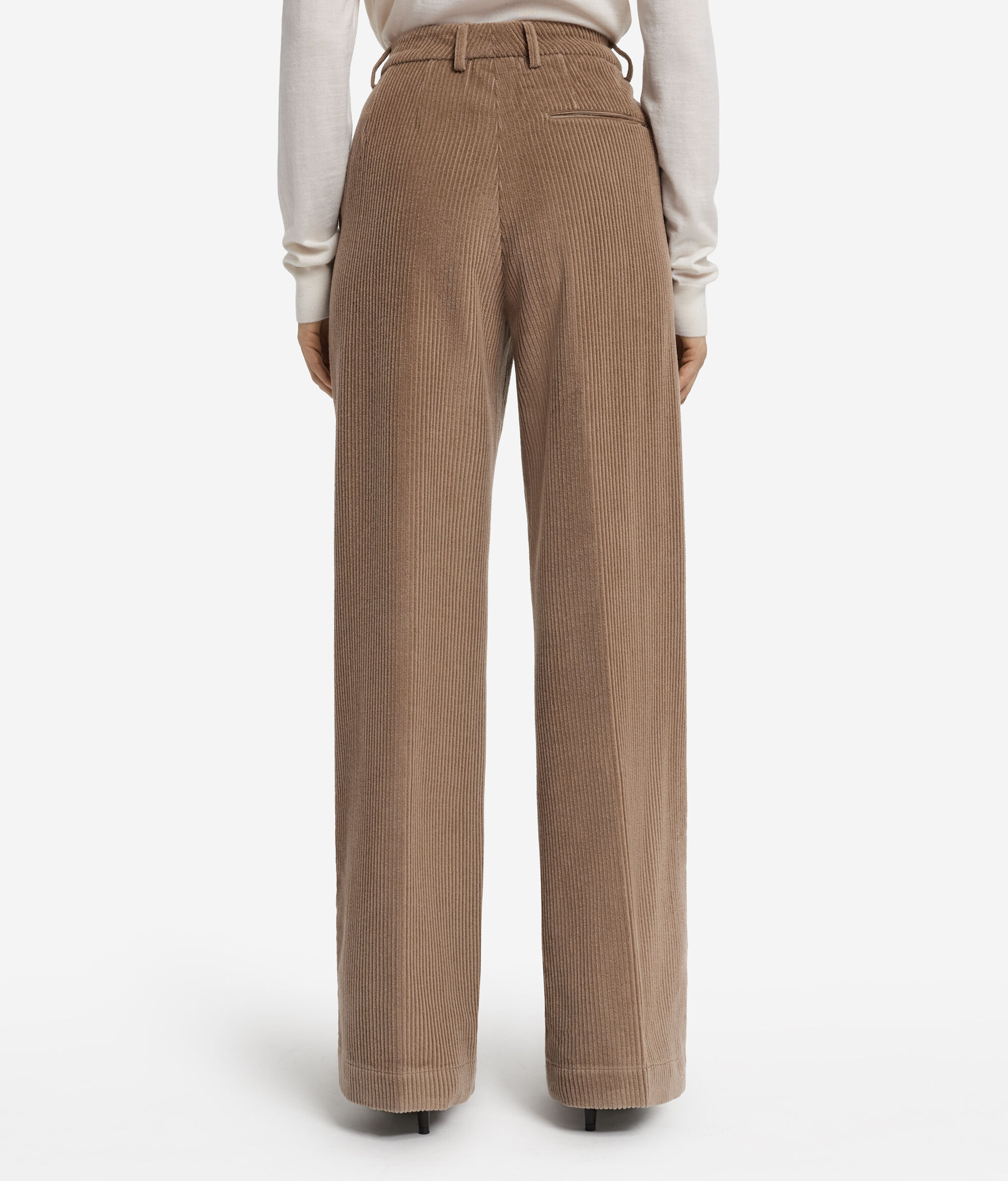 Naturalnie opływająca elegancja. Uszyte z kaszmirowo-wełnianego aksamitu spodnie łączą w sobie miękkość i subtelny połysk, tworząc szlachetną fakturę. Wpuszczane kieszenie oraz zapięcie na suwak i guzik nawiązują do krawieckiej staranności, podczas gdy miękki krój i długość do ziemi tworzą płynną i nieskazitelną linię, zaprojektowaną dla kobiet, które lubią wyróżniać się dyskretnie i z klasą.