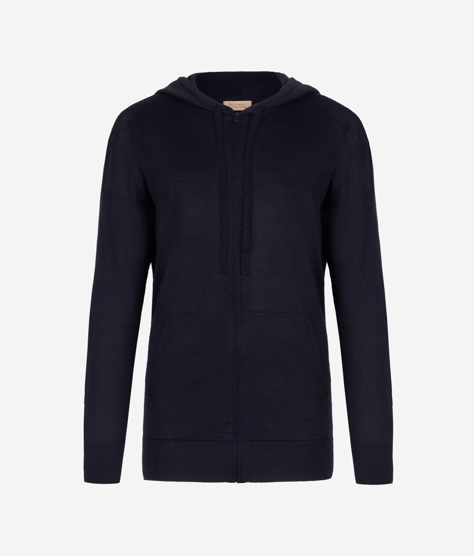 Felpa realizzata in Cashmere Ultrafine con cappuccio. Il capo presenta un'apertura con zip fino al fondo, tasche laterali aperte e spalle leggermente scese. La vestibilità è morbida.
