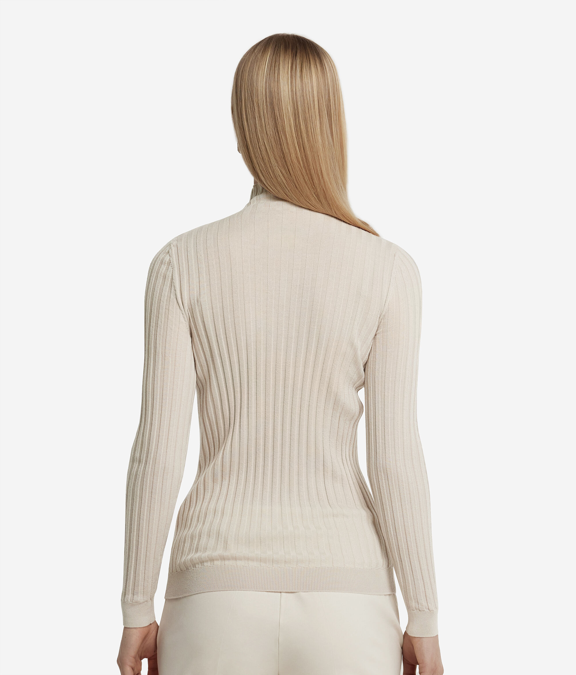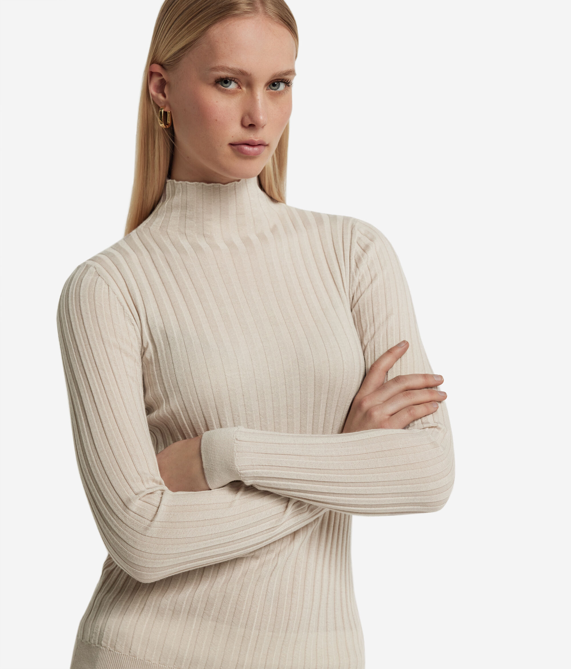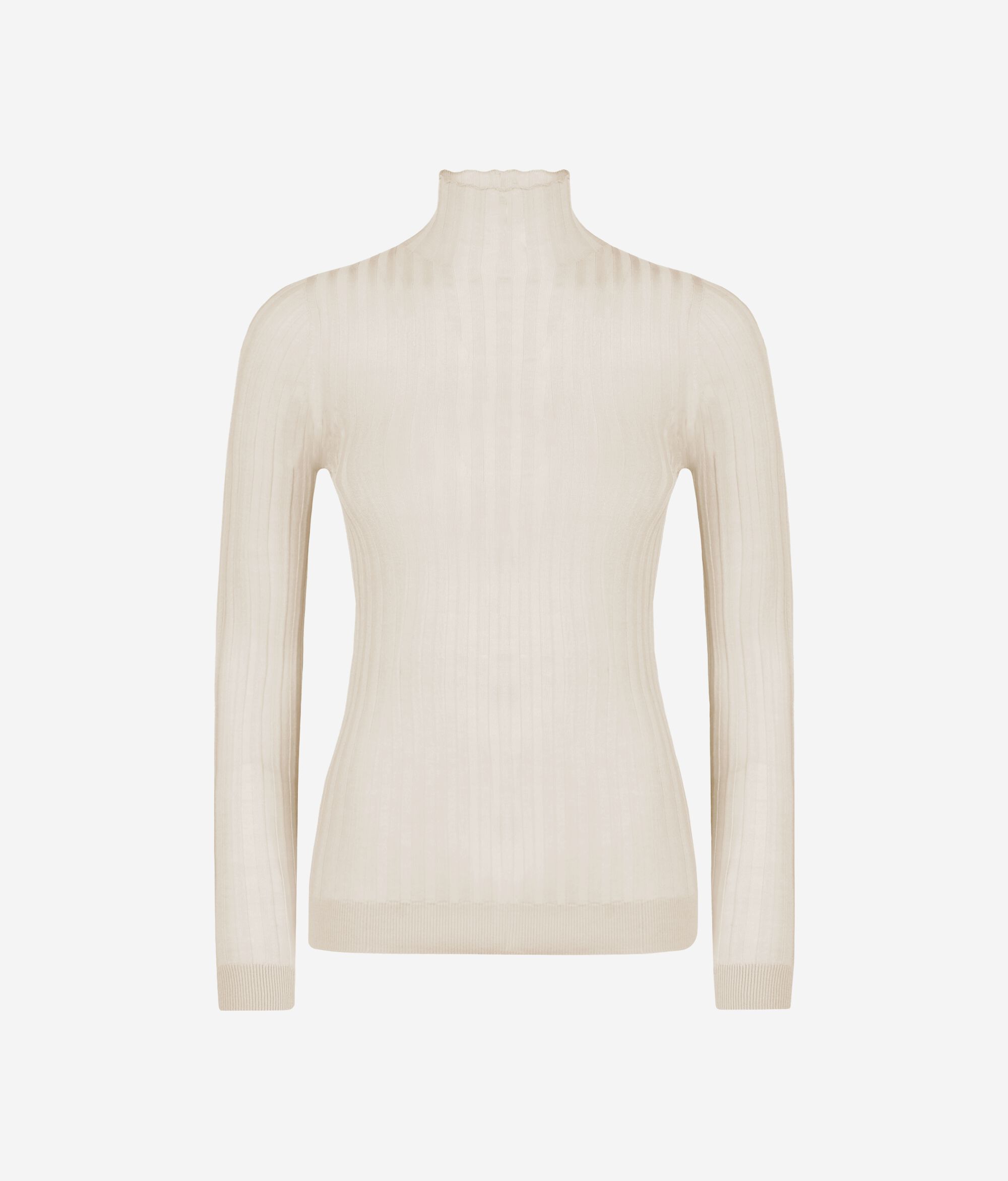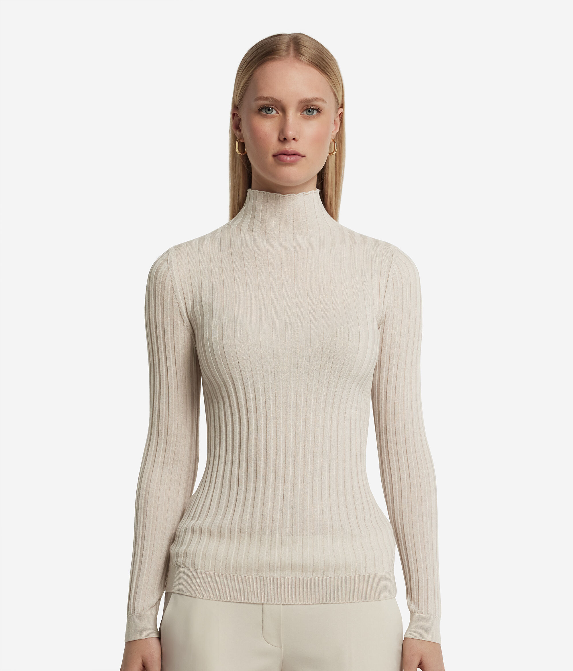 Dolcevita in Cashmere Ultrafine. A caratterizzare il capo una sofisticata lavorazione a costa piatta. La vestibilità slim segue delicatamente le linee del corpo, donando una silhouette sofisticata e femminile.