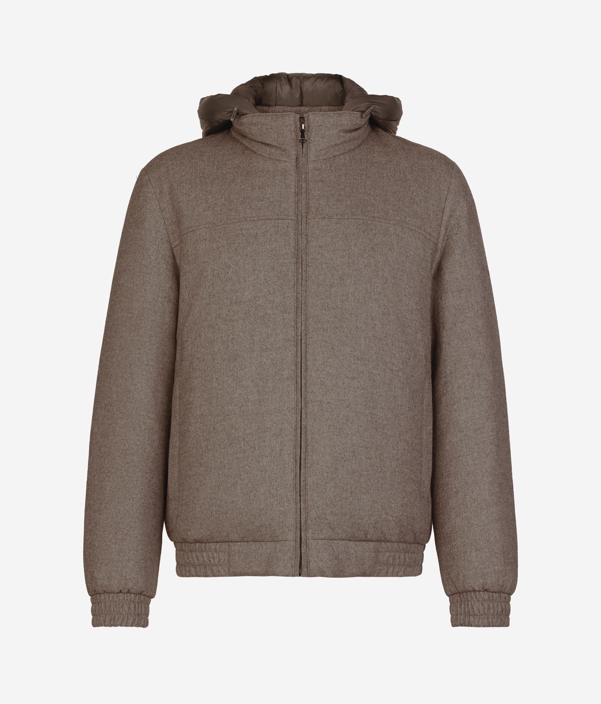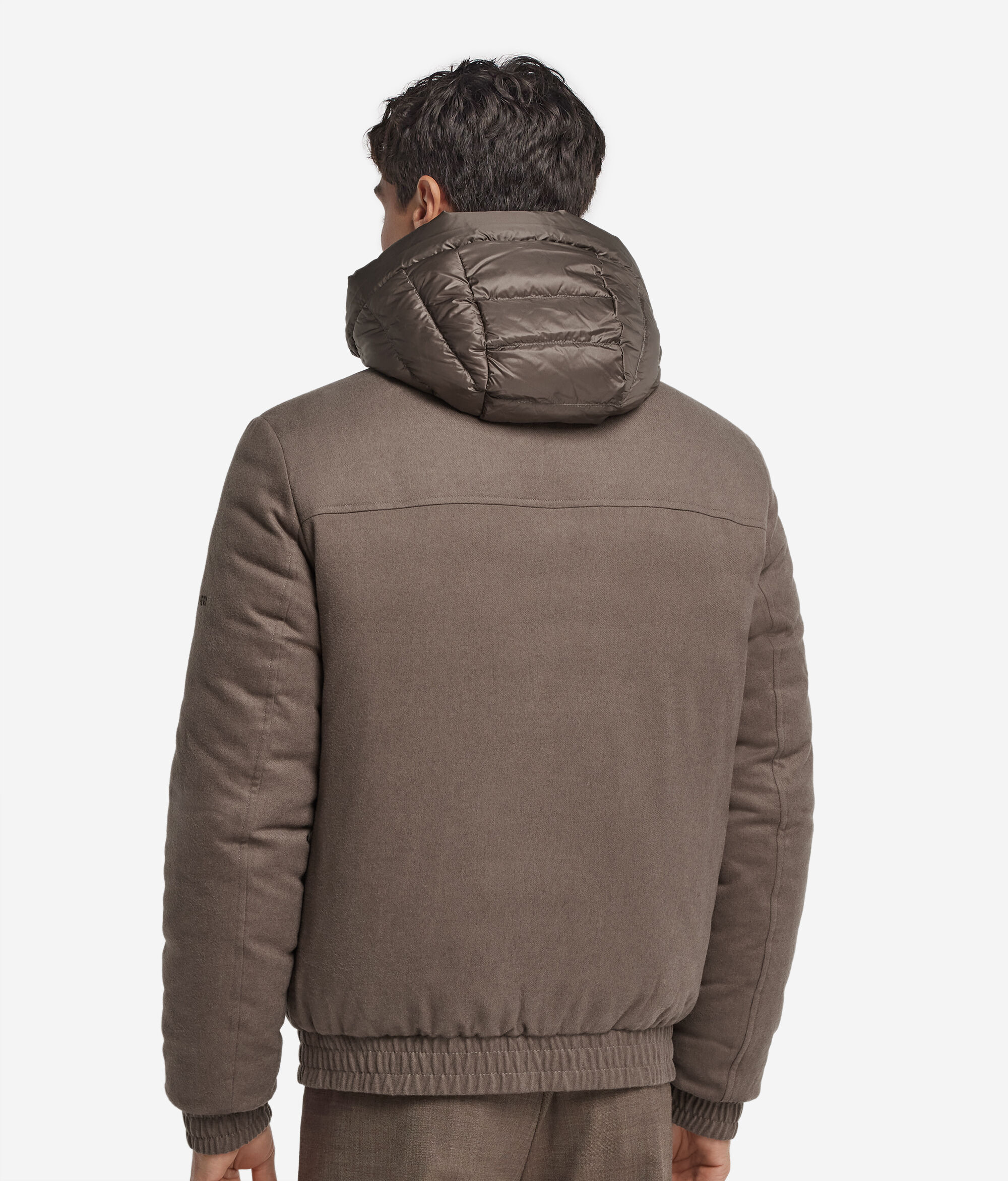 Realizzato in un raffinato mix di seta e cashmere, questo giubbino coniuga eleganza e praticità. Reversibile e imbottito in piuma, presenta un interno in tessuto tecnico trapuntato che assicura calore e protezione. Il cappuccio staccabile con coulisse aggiunge versatilità, mentre la chiusura con zip e le tasche a filetto completano il design. La vestibilità morbida lo rende perfetto per uno stile dinamico e contemporaneo.