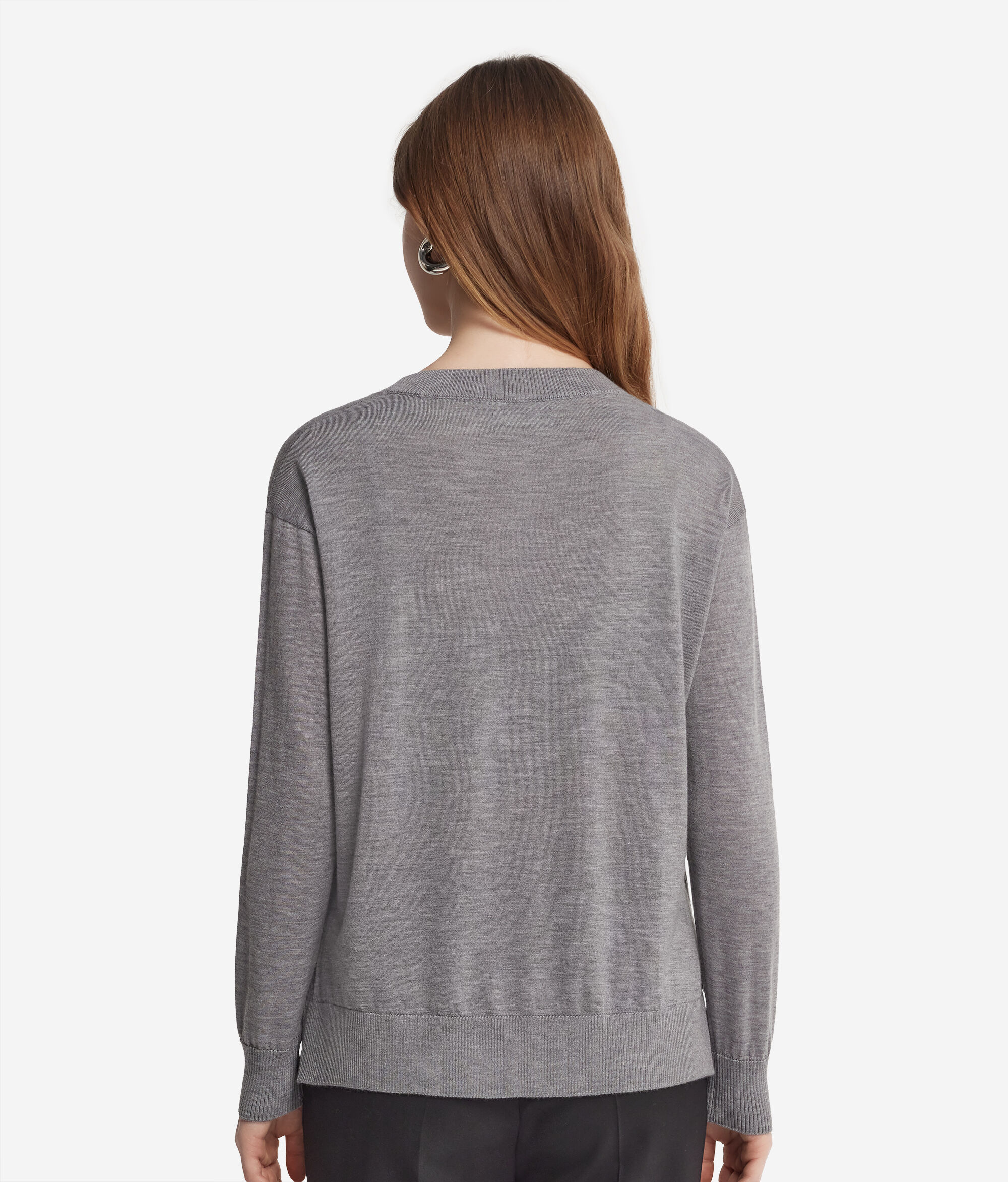 La maglia girocollo realizzata in cashmere ultrafine è un modello a manica lunga che si caratterizza da una lavorazione a costina sullo scollo, sui polsi e sul fondo. La sua peculiarità sono gli spacchi laterali. Le spalle sono leggermente scese e sua vestibilità è morbida.