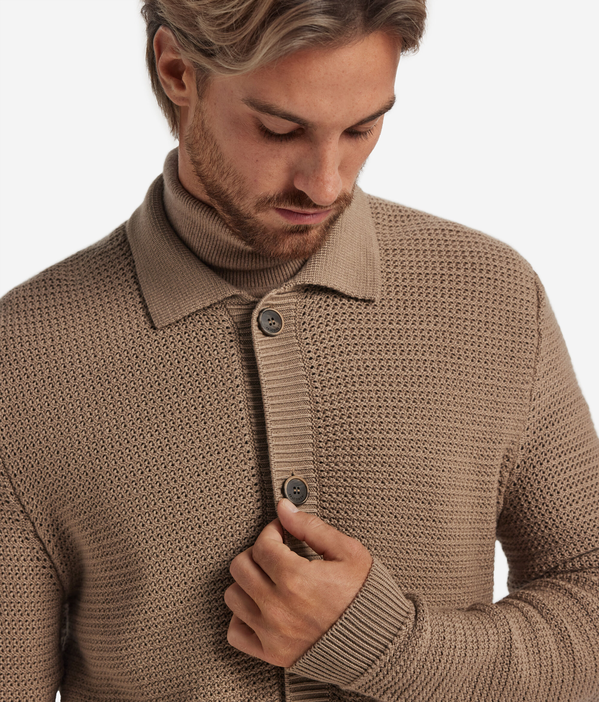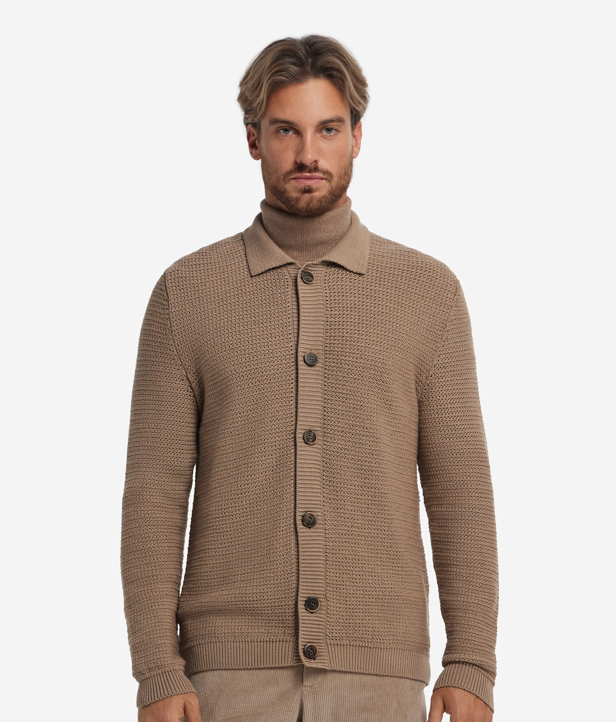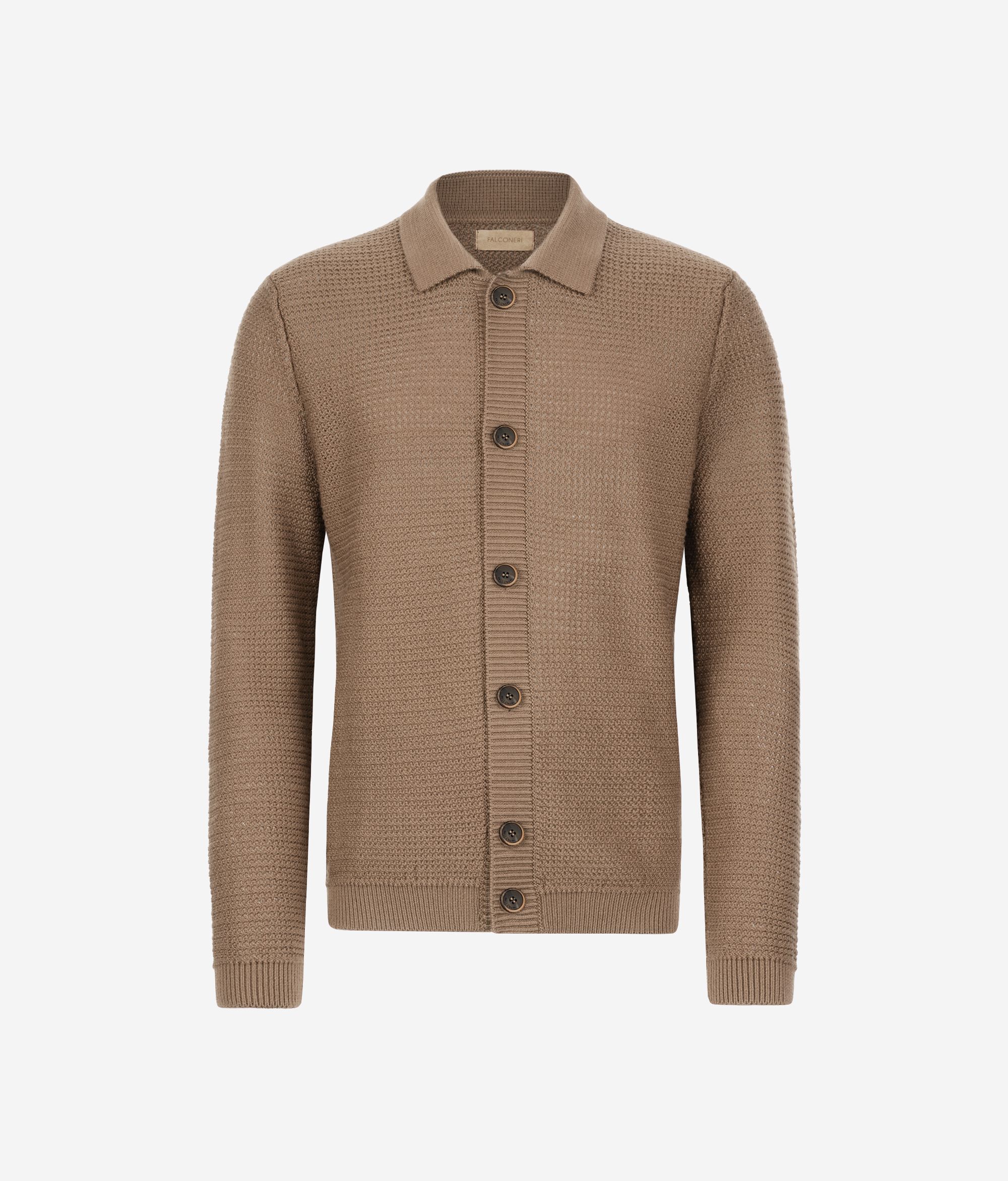 Design pulito e texture materica definiscono questa giacca camicia in maglia di lana. Il colletto strutturato e l’abbottonatura monopetto disegnano una silhouette essenziale e raffinata, valorizzata dalla vestibilità regolare. Capo estremamente versatile, si indossa con disinvoltura da solo o come capospalla leggero, ideale per look stratificati e minimal chic.