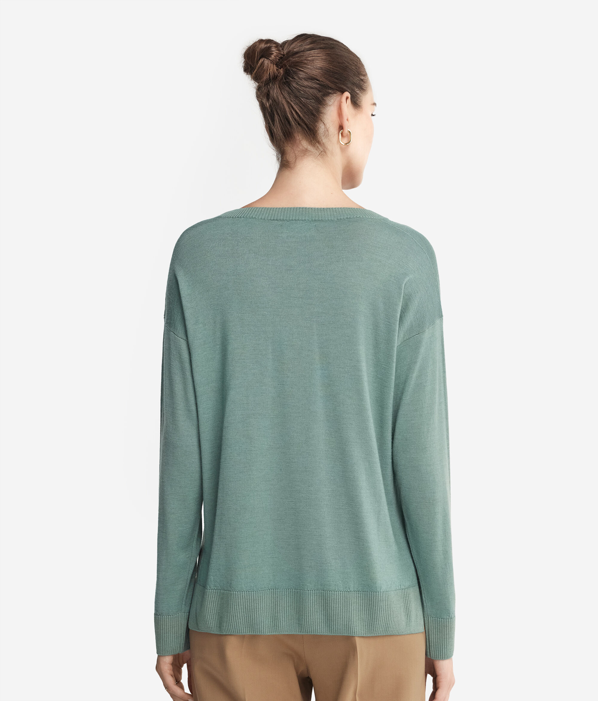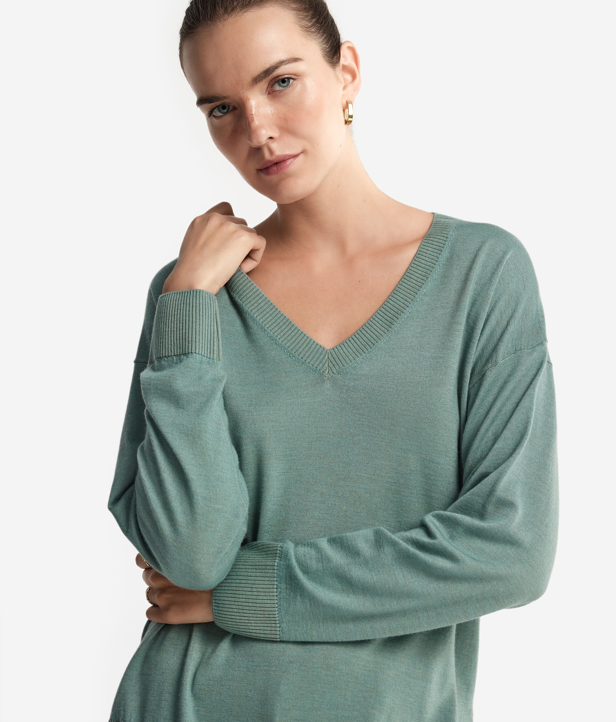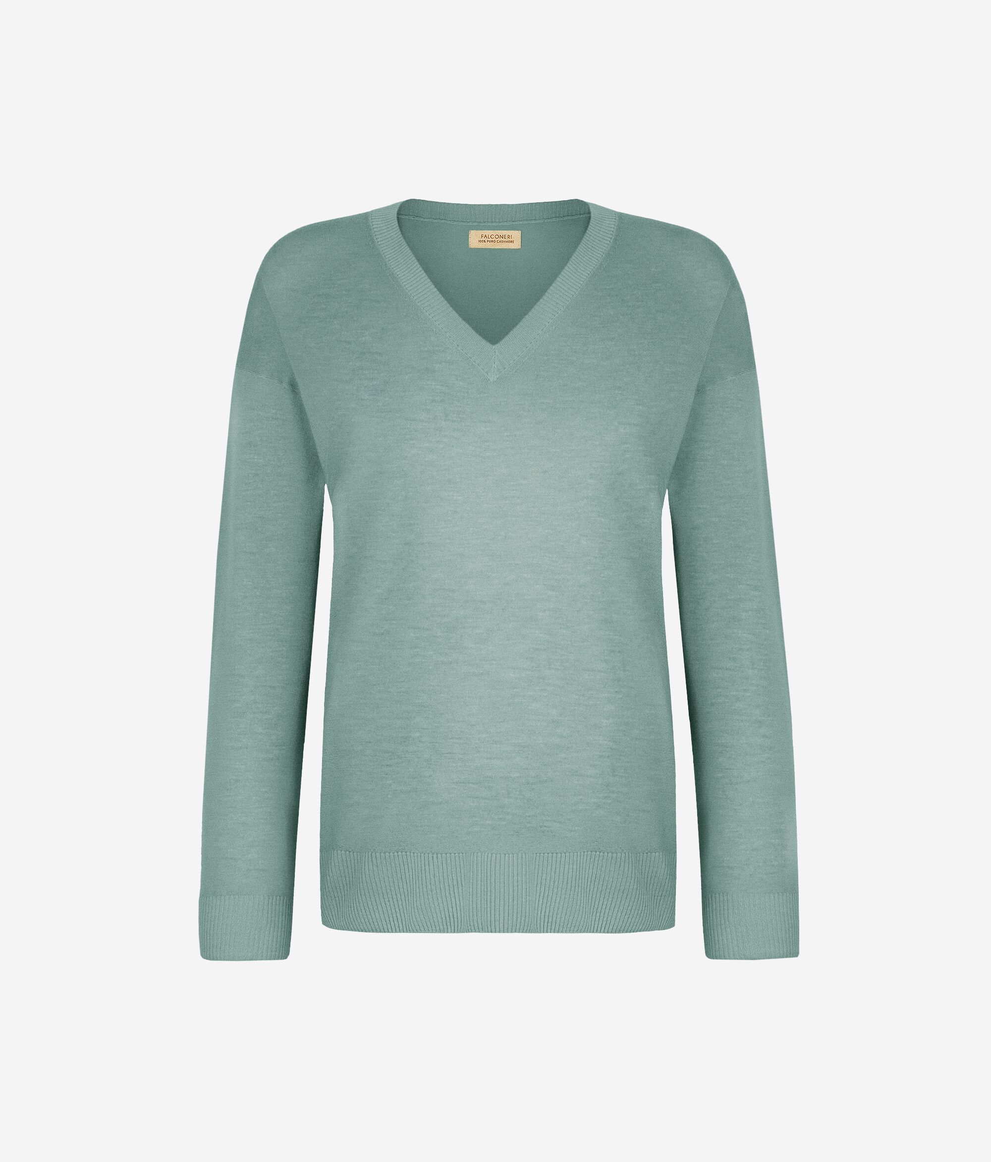 La maglia a scollo a V realizzata in cashmere ultrafine è un modello a manica lunga che si caratterizza da una lavorazione a costina sullo scollo, sui polsi e sul fondo. La sua peculiarità sono gli spacchi laterali. Le spalle sono leggermente scese e sua vestibilità è morbida.