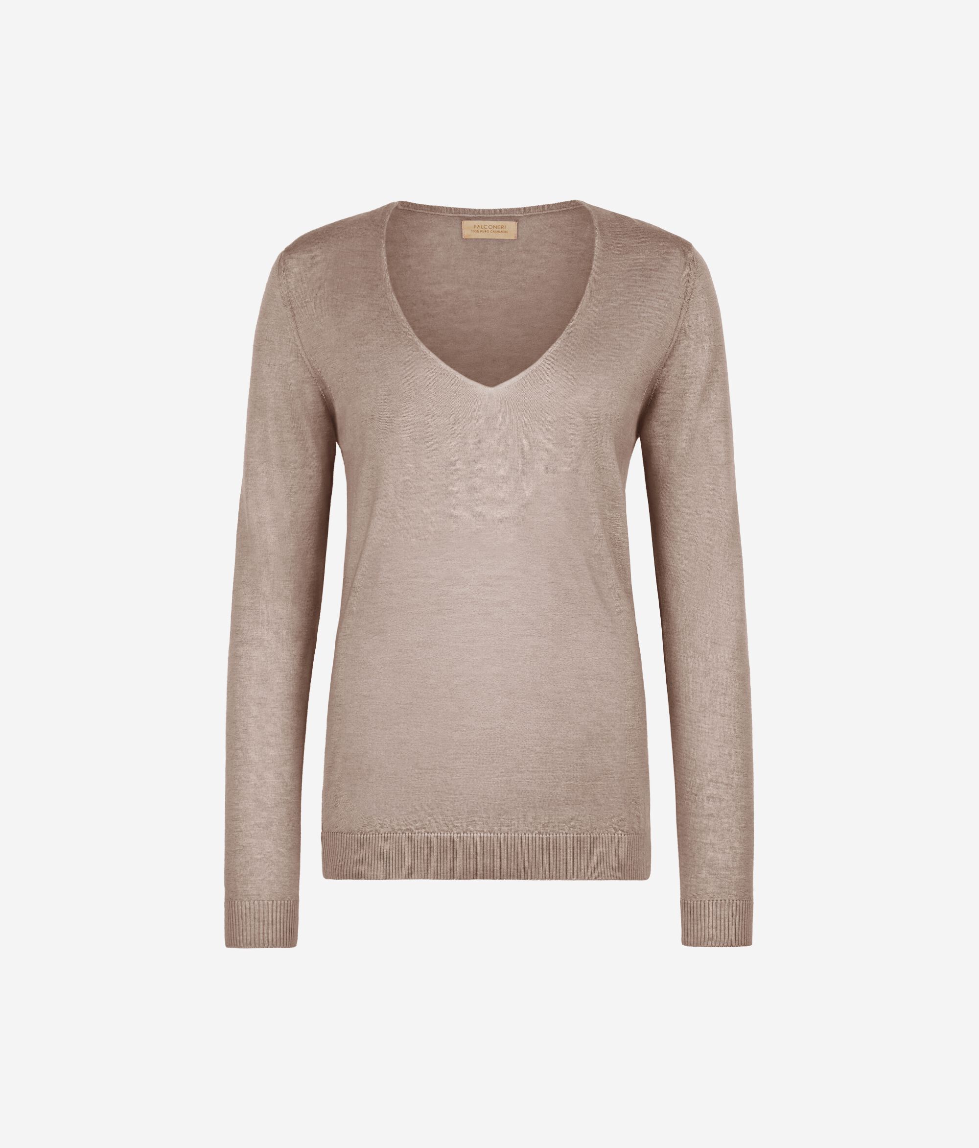 Maglia scollo V in Cashmere Ultrafine, modello a maniche lunghe e spalle leggermente scese. Presenta una finitura con lavorazione a coste sullo scollo, al fondo e sui polsini. Il capo nelle varianti colore in tinto capo è stato sottoposto ad un processo di tintura artigianale. La vestibilità e la spalla della maglia scollo V in cashmere sono regolari.