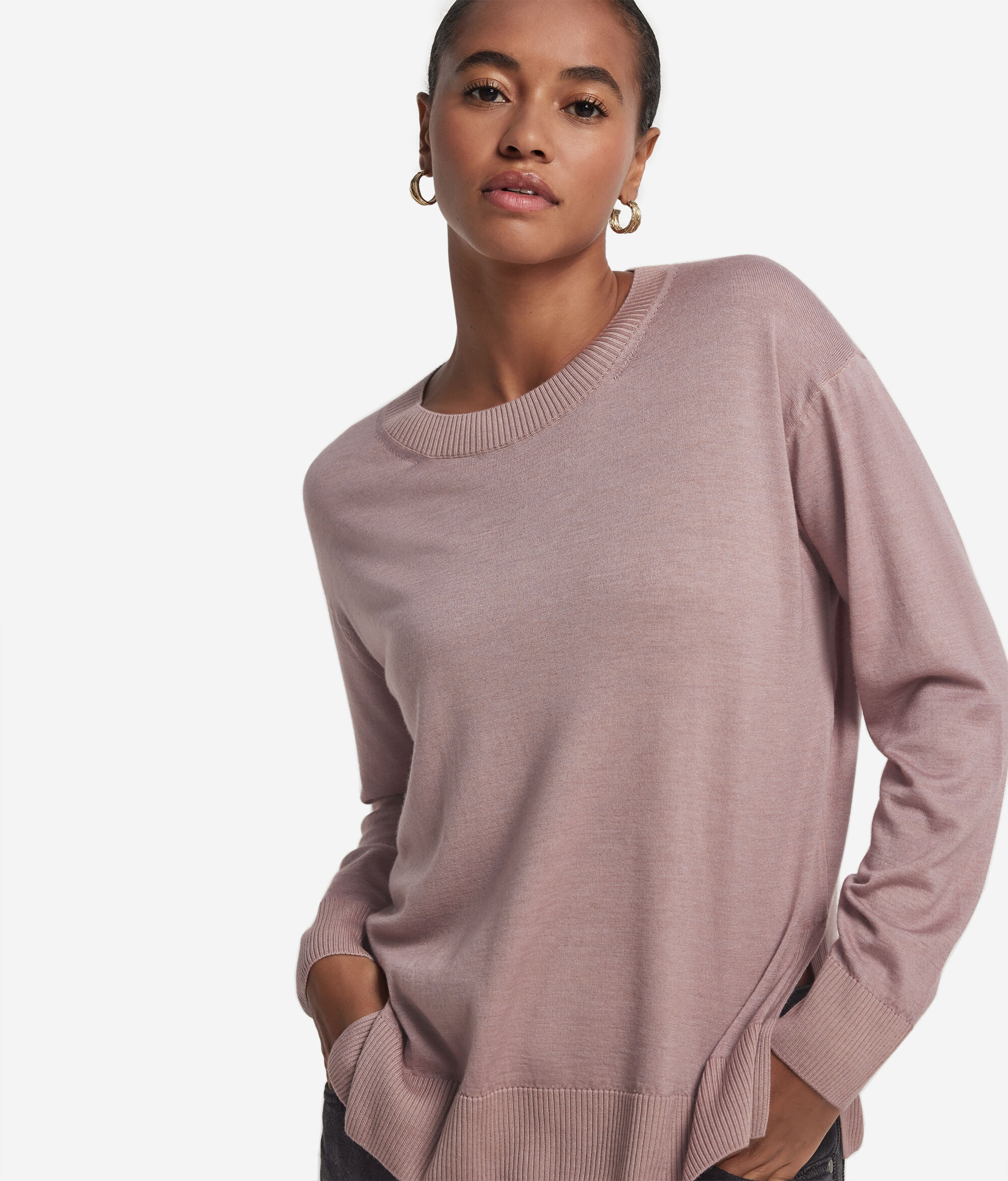La maglia girocollo realizzata in cashmere ultrafine è un modello a manica lunga che si caratterizza da una lavorazione a costina sullo scollo, sui polsi e sul fondo. La sua peculiarità sono gli spacchi laterali. Le spalle sono leggermente scese e sua vestibilità è morbida.