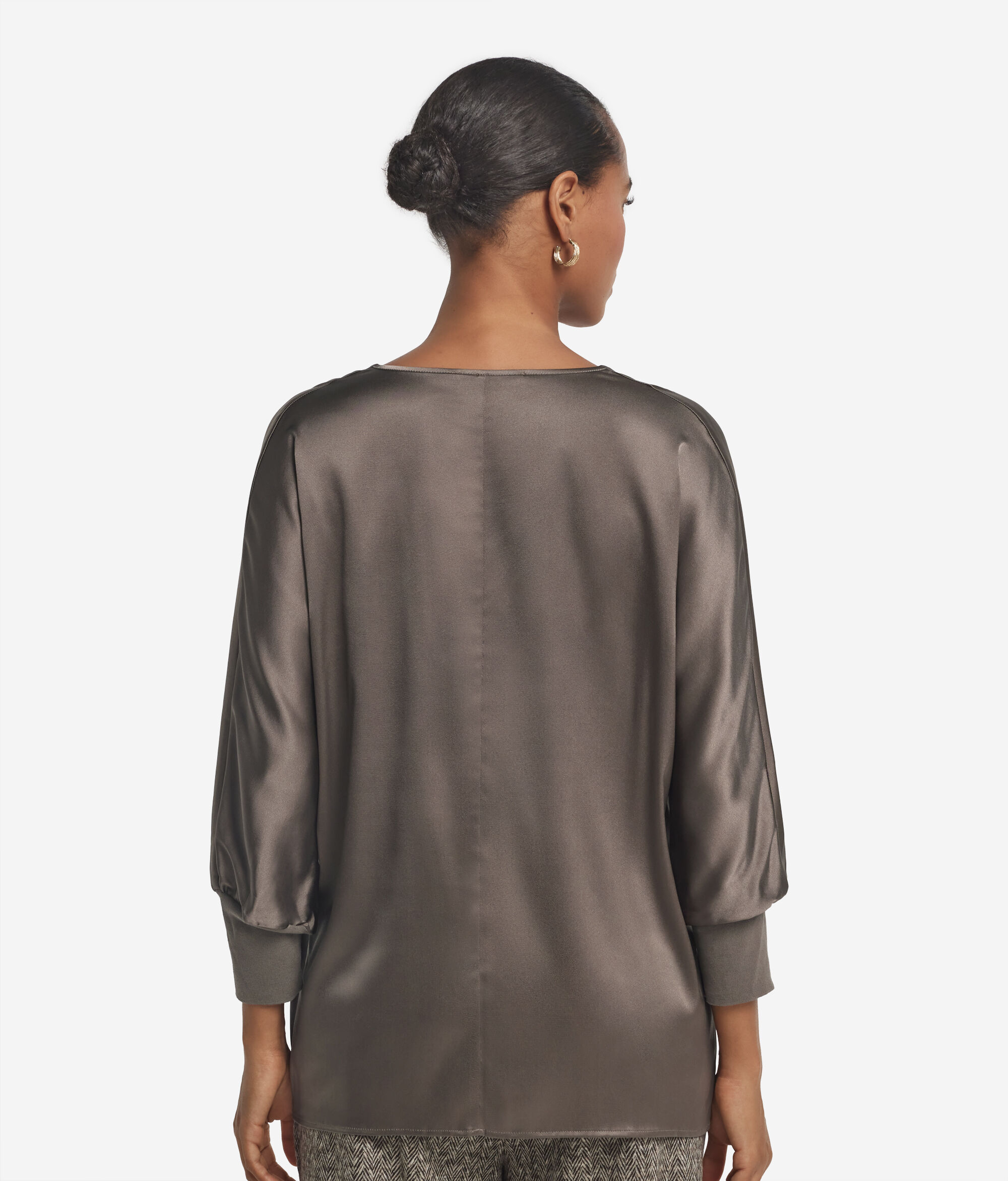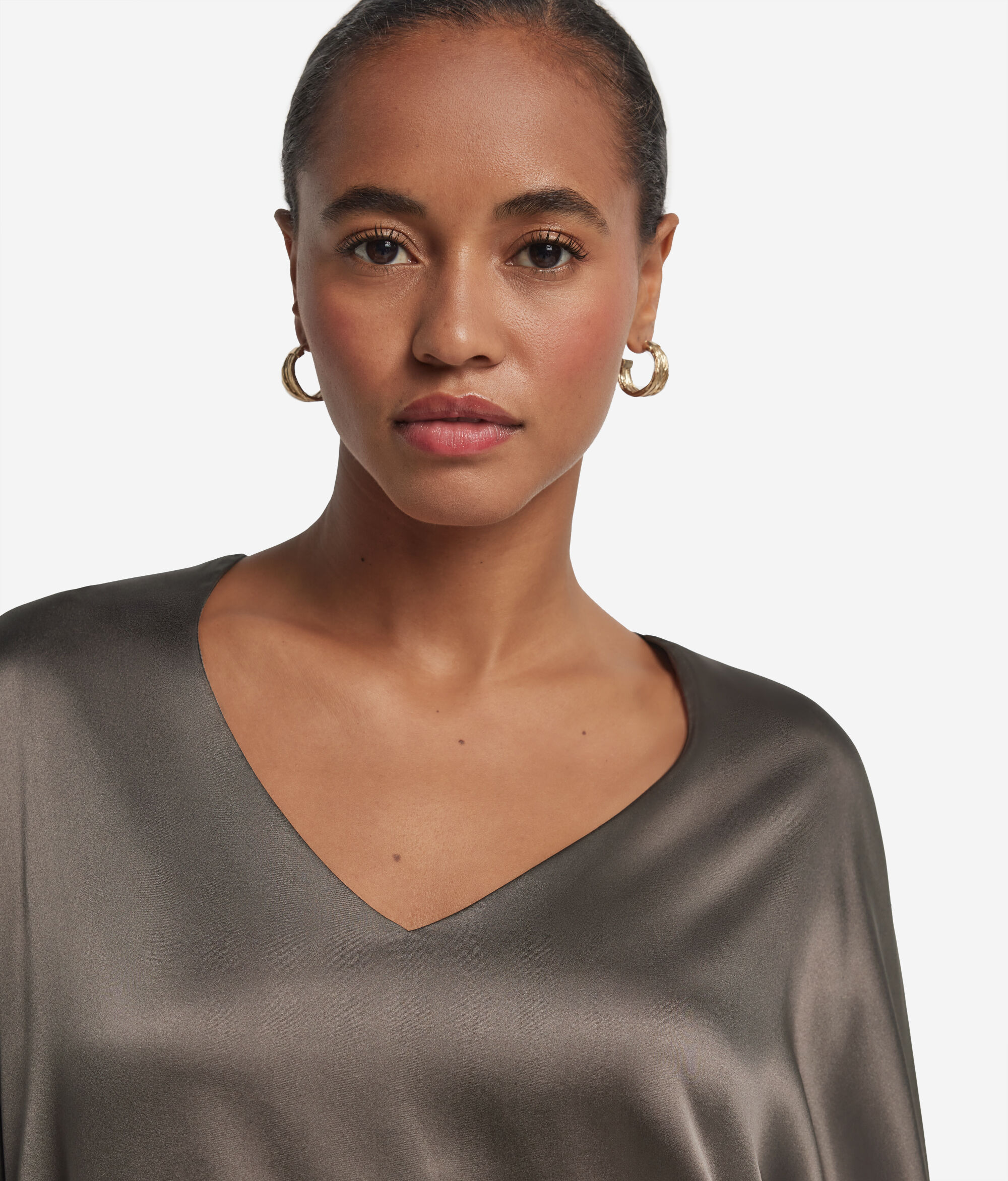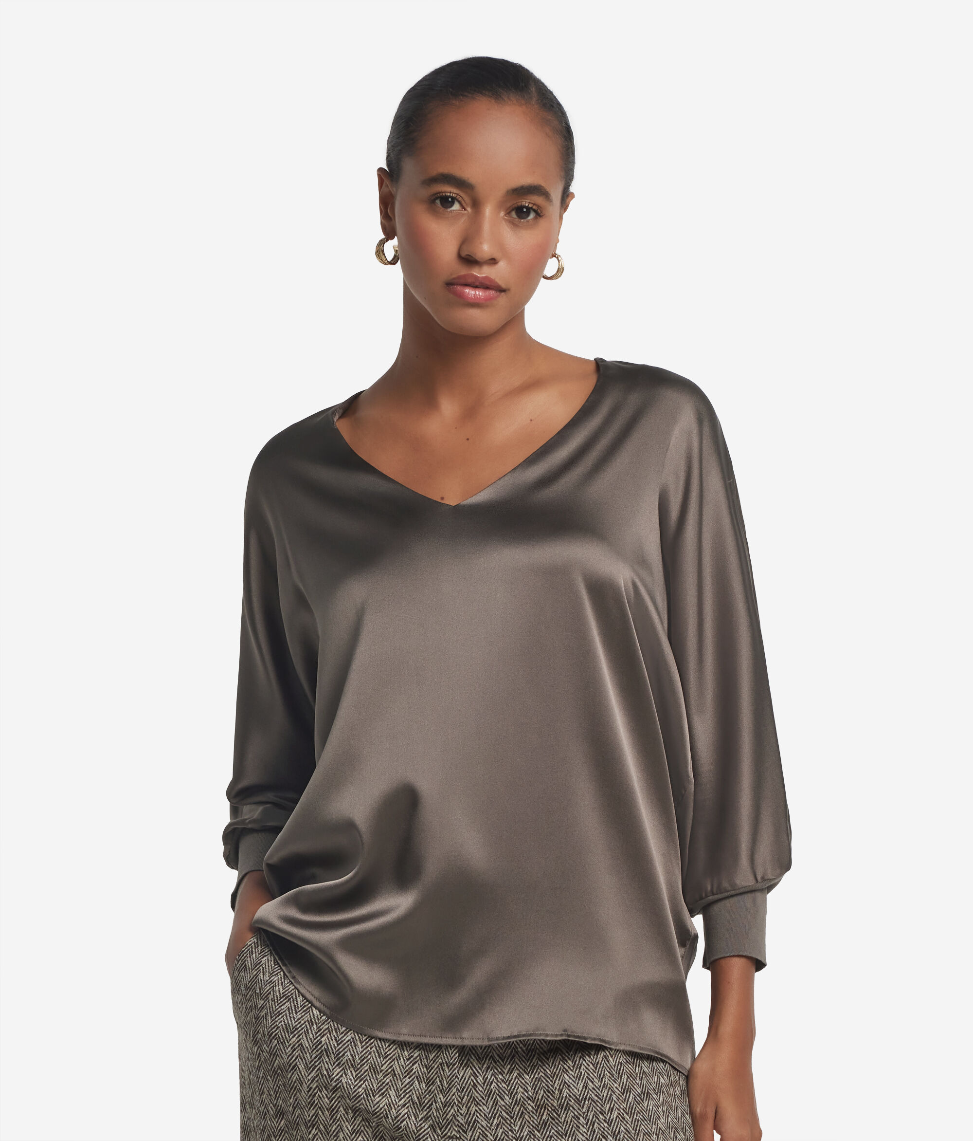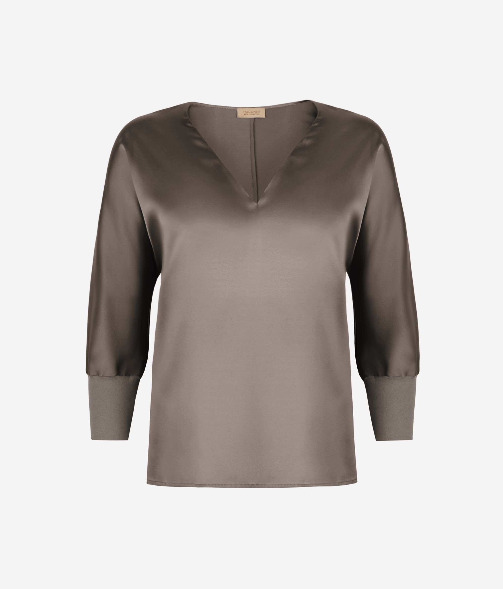 La blusa con scollo a V in seta è perfetta per creare look sofisticati capaci di valorizzare i dettagli con stile. Il modello è realizzato in raso di seta ed è sapientemente disegnato per enfatizzare le morbide linee del tessuto. I dettagli sartoriali come i polsi in maglia di cotone e la forma dello scollo rendono più grintoso lo stile della blusa in seta con scollo a V.