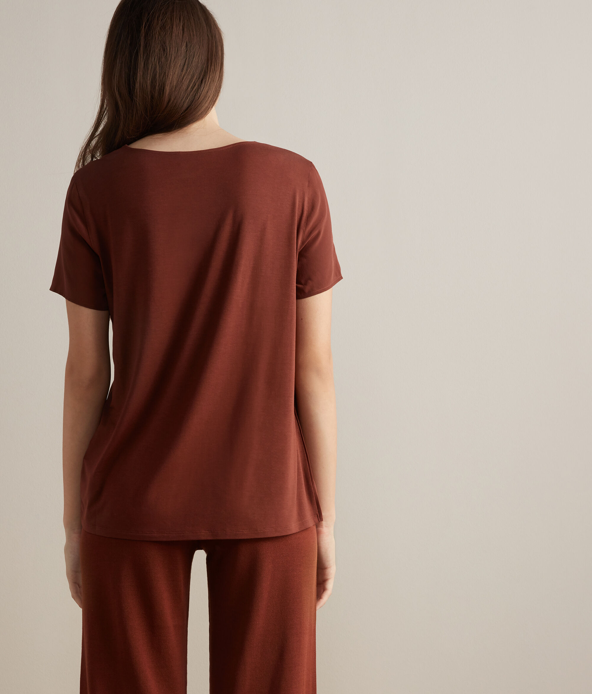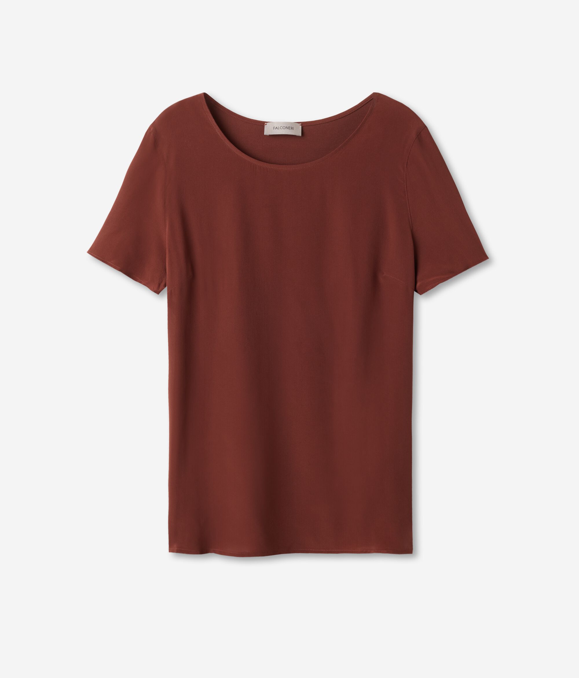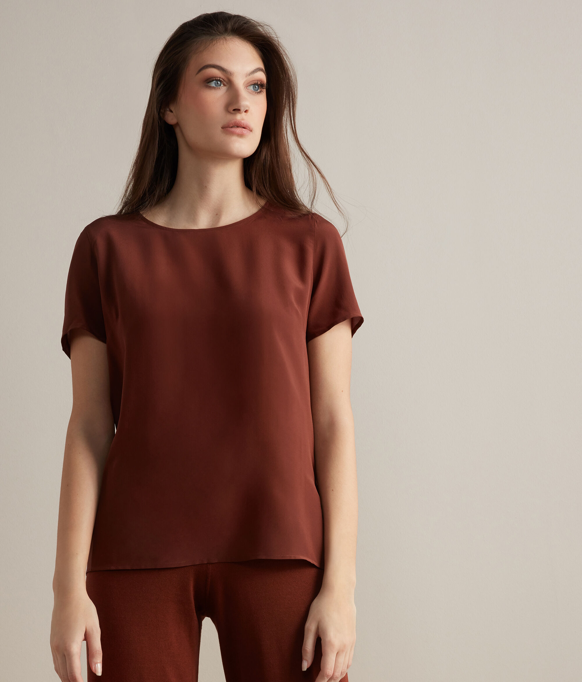 La texture rarefatta della pura seta crepe de chine esalta i volumi di questa t-shirt girocollo. Il retro in modal crea un raffinato contrasto di tessuti donando praticità e una piacevole sensazione a contatto con la pelle. La vestibilità fluida avvolge la silhouette, giocando con leggere trasparenze. Il design essenziale la rende perfetta come sottogiacca, aggiungendo un tocco di classe discreta e senza tempo a qualsiasi look.