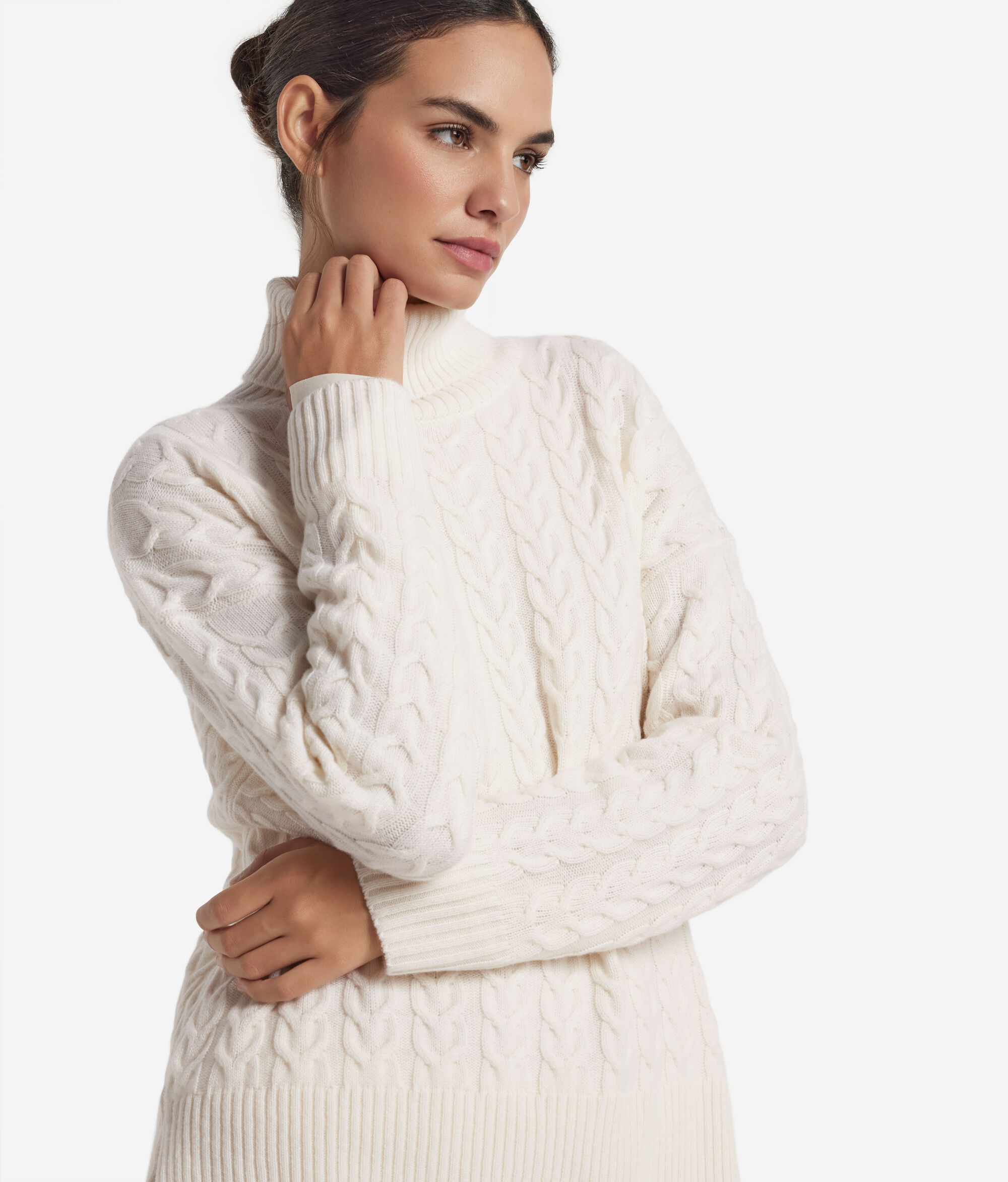 Soffice e avvolgente, questo dolcevita in cashmere ultrasoft unisce comfort e raffinatezza. Il collo alto e la spalla leggermente scesa creano un’allure rilassata, mentre la lavorazione a trecce verticali slancia la linea. I dettagli a coste arricchiscono il design aggiungendo texture, e i delicati spacchi al fondo donano movimento. La lunghezza sotto i fianchi e la vestibilità morbida lo rendono un alleato prezioso durante le giornate più fresche.