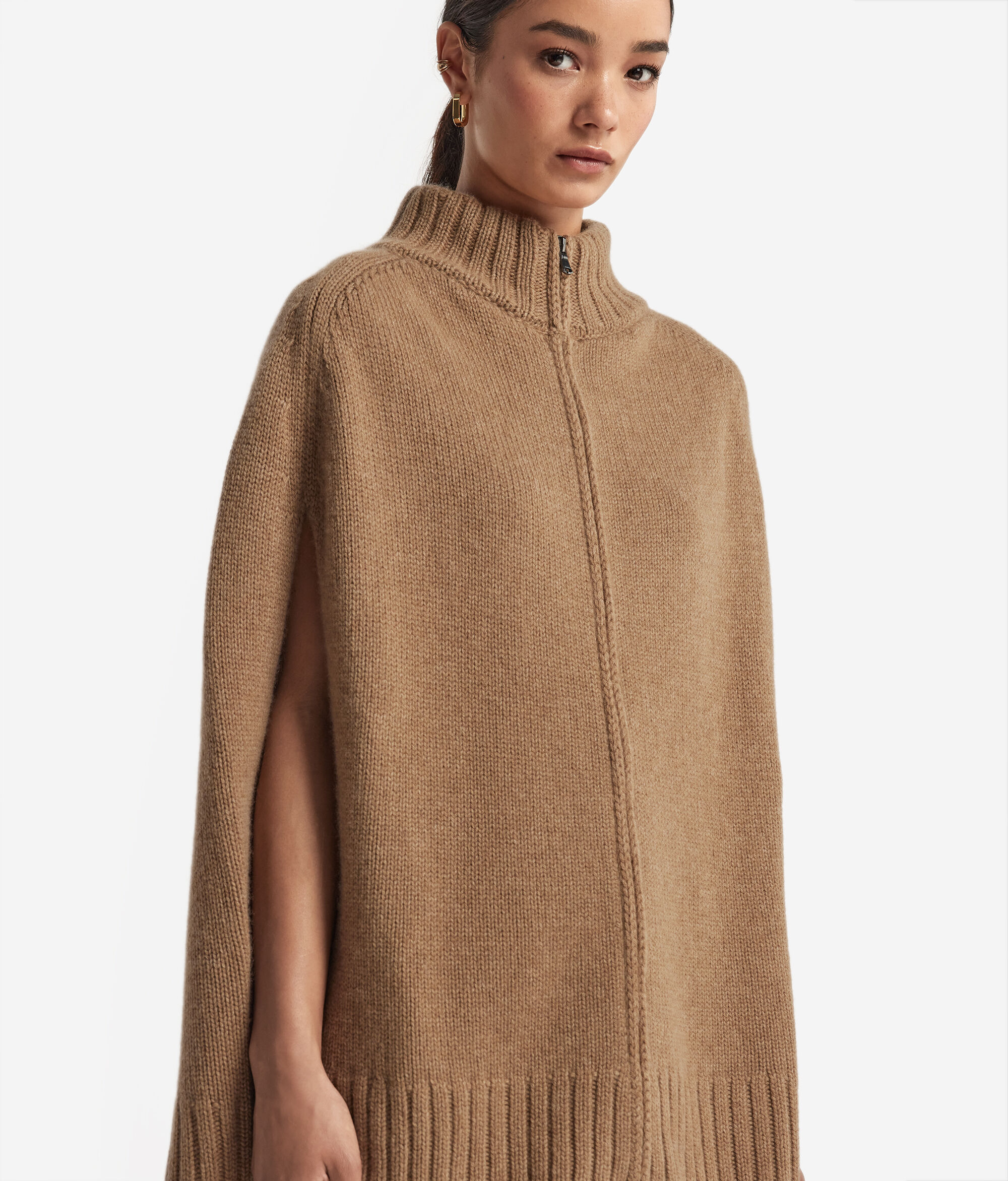 Linee rilassate e dettagli d'ispirazione scandinava si incontrano in questa cappa senza maniche realizzata in soffice Cashmere Ultrasoft. Dotata di una chiusura con zip è ulteriormente arricchita da un motivo a costine su collo e bordo. La sua vestibilità morbida e il taglio leggermente corto offrono un look moderno e sofisticato, perfetto per completare ogni outfit con un tocco di eleganza casual.