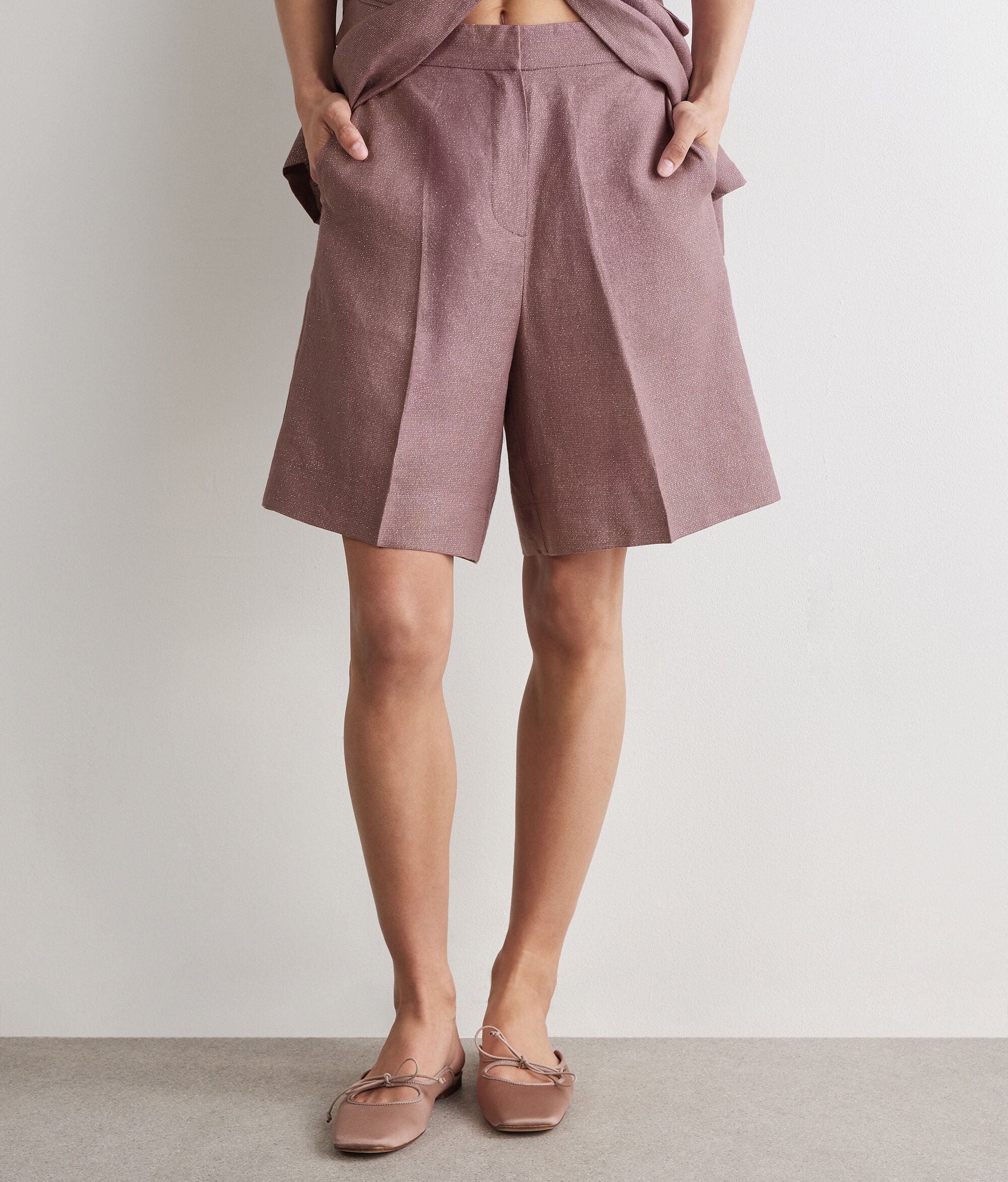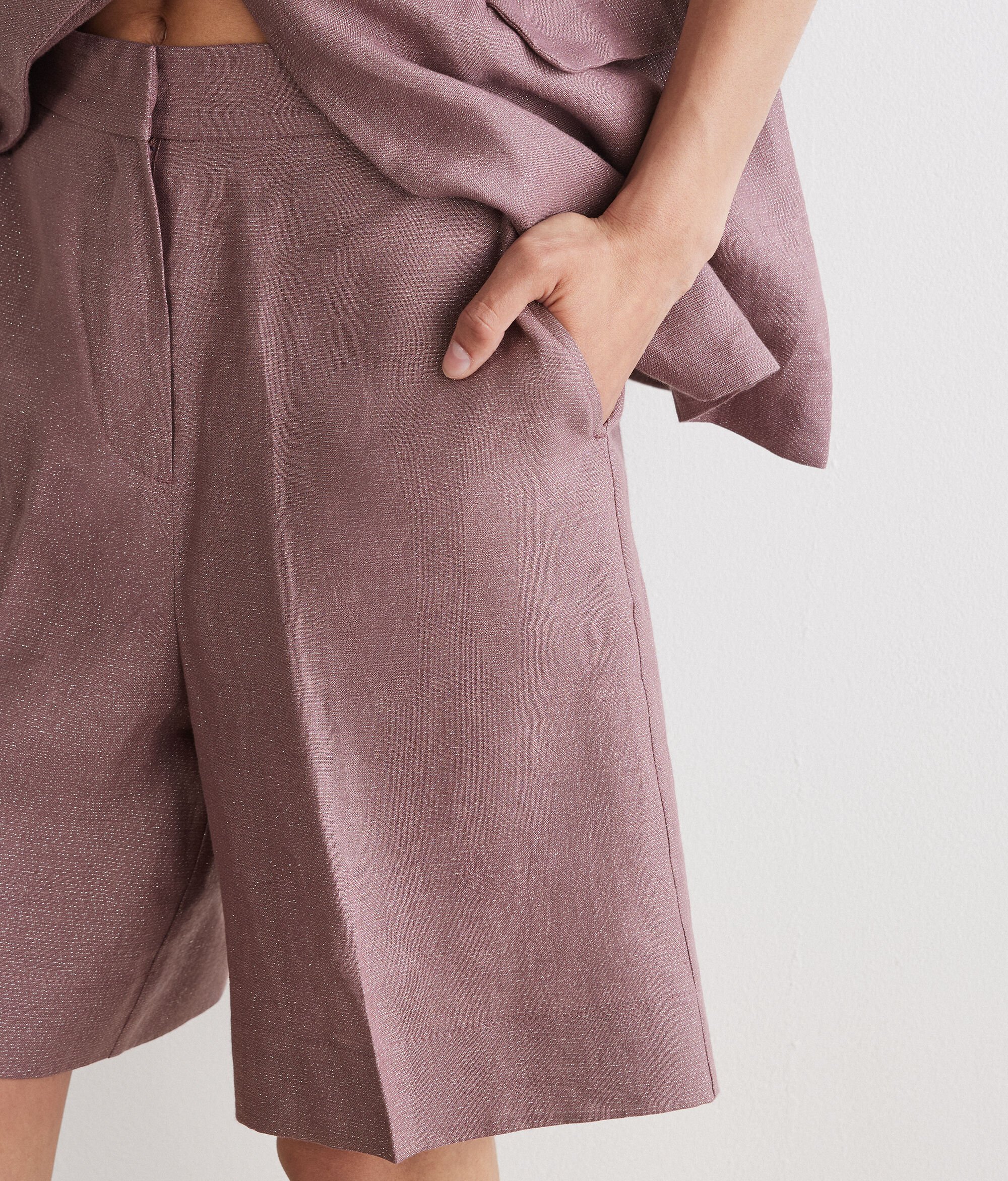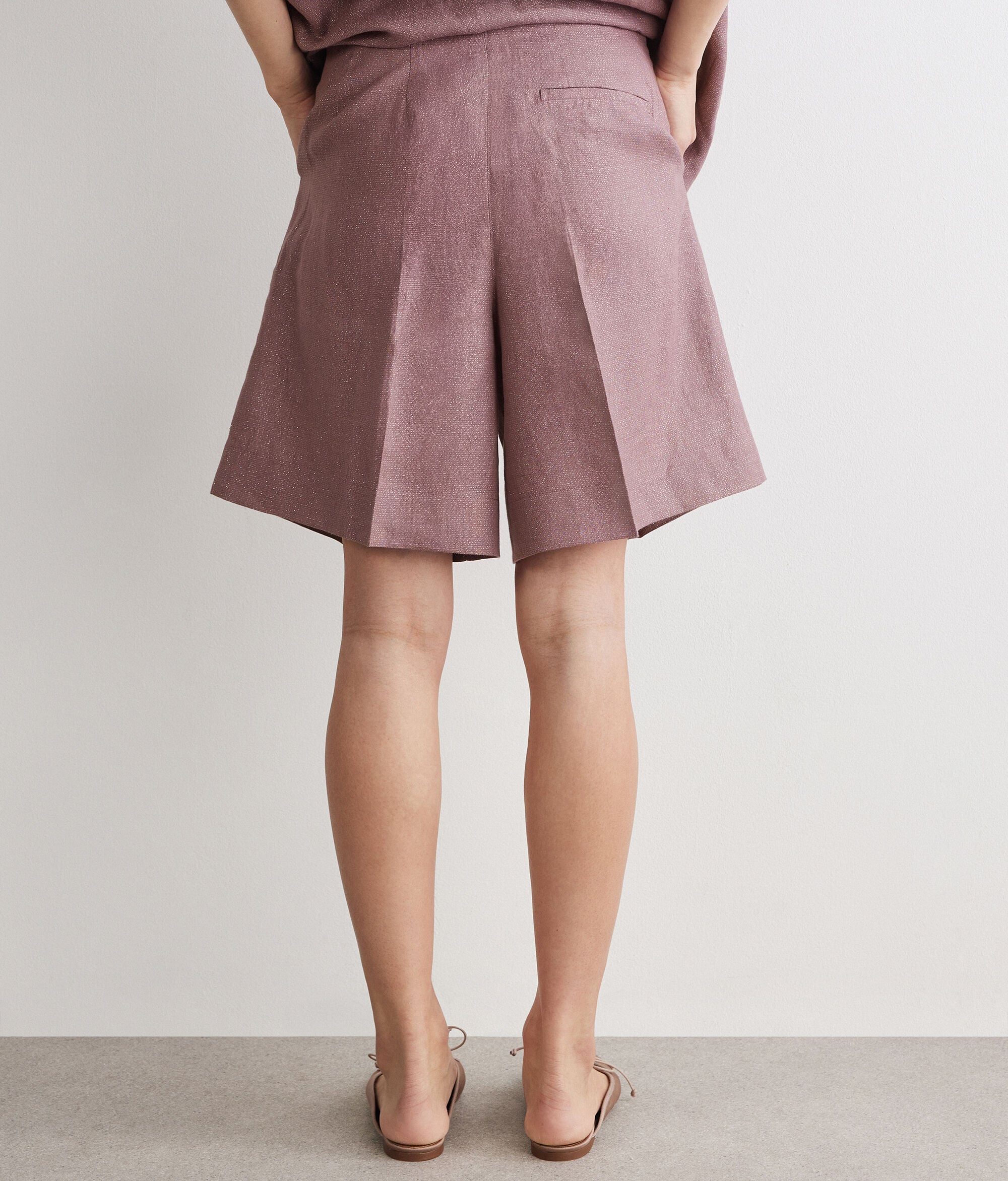 Bermudas em tela de linho, adornado com fio lamé. A peça, com corte regular, apresenta uma prega central que realça a sua inspiração na alfaiataria.