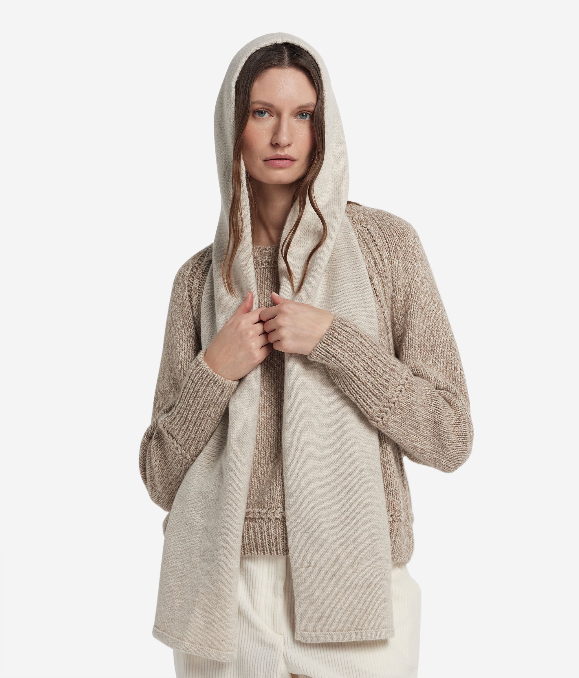 Um acessório icónico que combina conforto e charme contemporâneo. Confecionado em fina caxemira ultrasoft, envolve com uma suavidade impercetível, proporcionando calor e leveza ao mesmo tempo. O capuz integrado com cachecol cria um design fluido e versátil, pensado para transformar cada look num gesto de estilo. O detalhe canelado confere um toque de carácter elegante, realçando o cuidado artesanal e a elegância intemporal de uma peça destinada a ser protagonista.