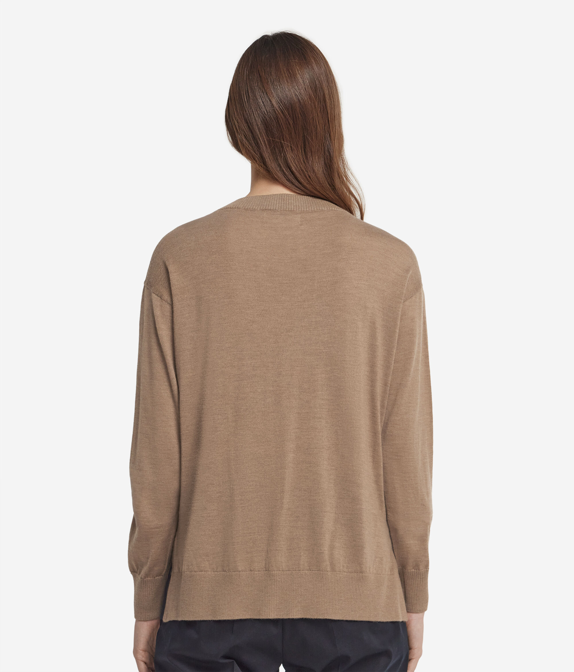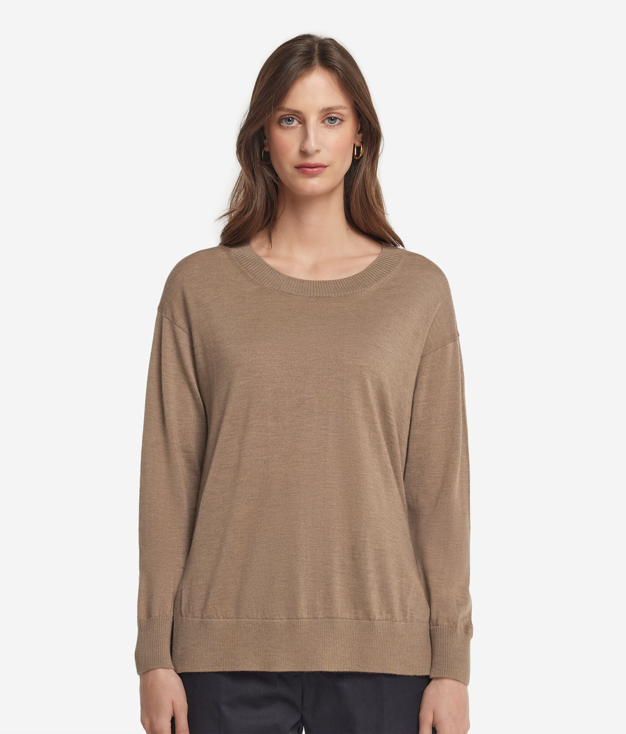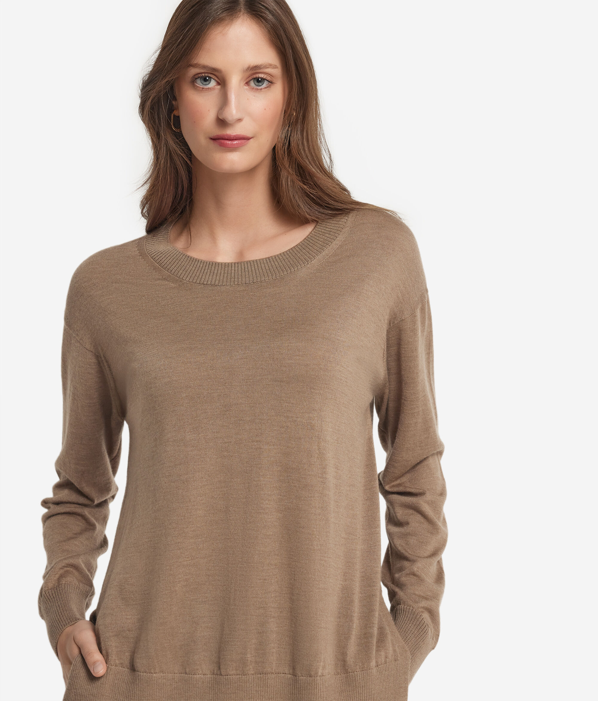 A camisola com decote redondo confecionada em caxemira ultrafine é um modelo de manga comprida que se caracteriza por um padrão canelado no decote, nos punhos e no cós. As suas peculiaridades são as rachas laterais. Os ombros são levemente descaídos e o seu corte é confortável.