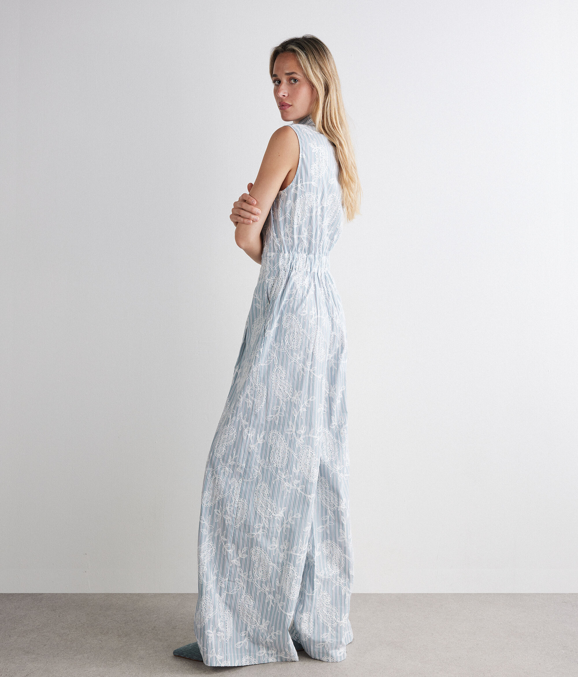Para a coleção Primavera/Verão 2026, a Falconeri apresenta uma nova coleção cápsula em edição limitada. Este macacão sem mangas, confeccionado em algodão fino, destaca-se pelo elegante bordado floral que se sobrepõe ao padrão às riscas, criando um sofisticado jogo de contrastes.