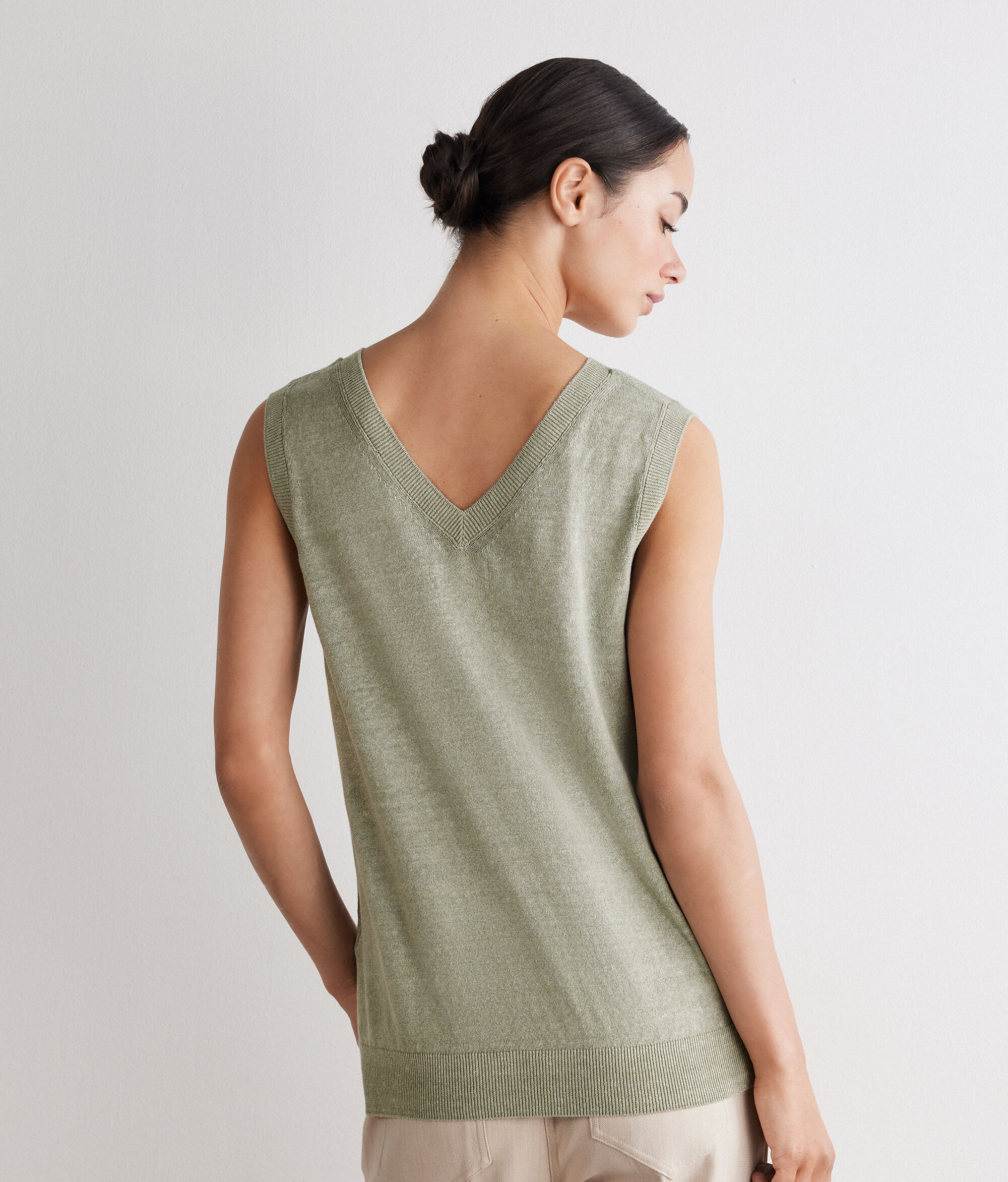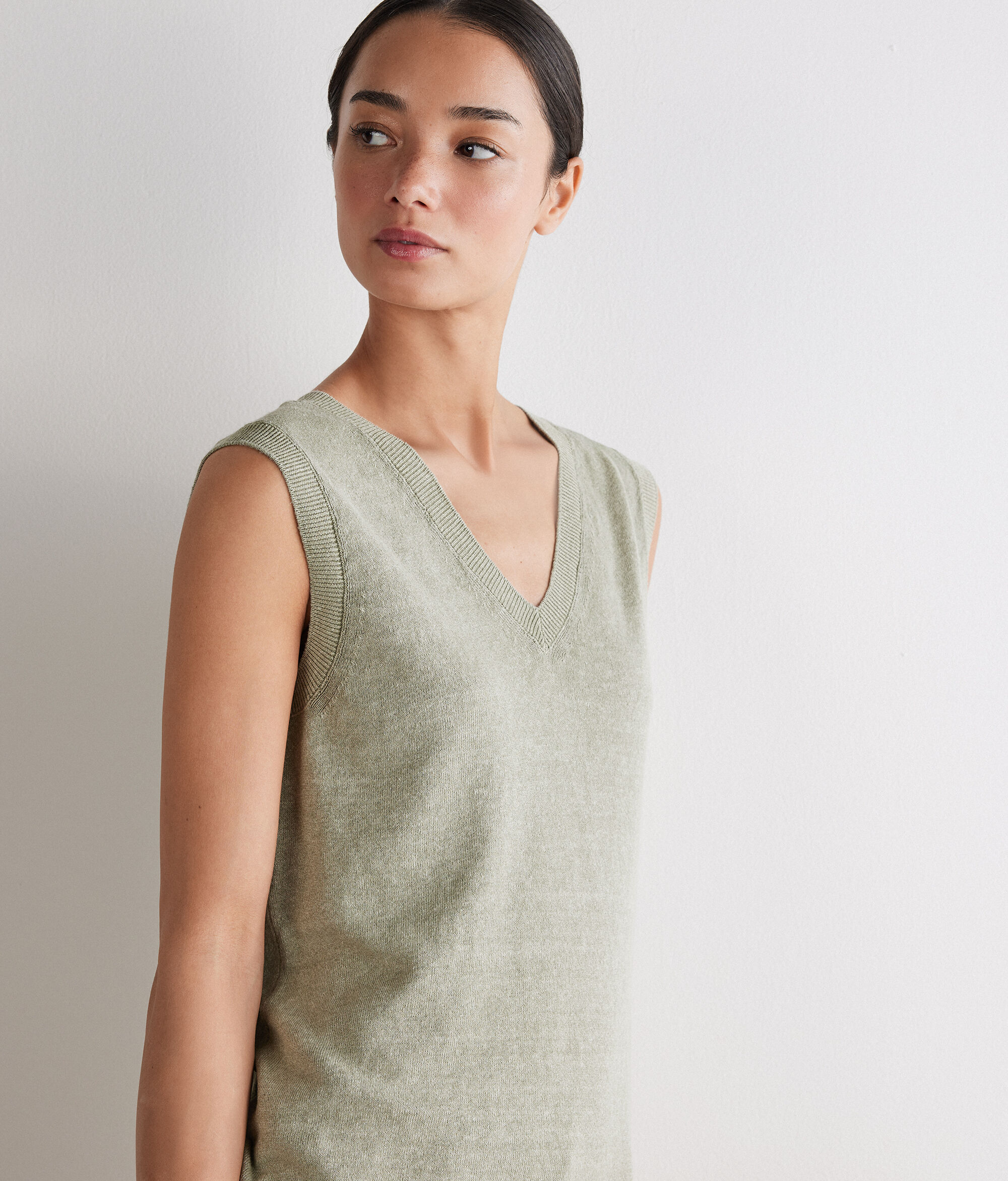 Simples e requintada, este top de linho e algodão destaca-se pelo decote duplo em V, que realça delicadamente o contorno do colo e das costas. Os acabamentos em canelado acrescentam textura ao design essencial, mantendo um estilo limpo e natural. O corte regular e o comprimento até à anca fazem dele um aliado versátil para looks de verão com um estilo natural e intemporal.