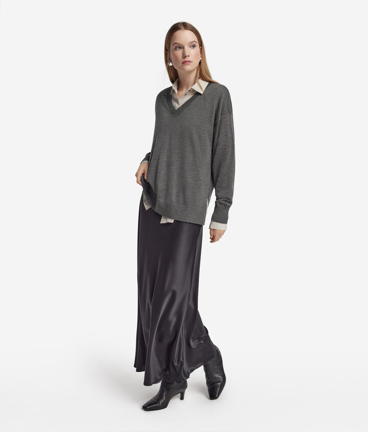 Camisola com Decote em V em Caxemira com Rachas