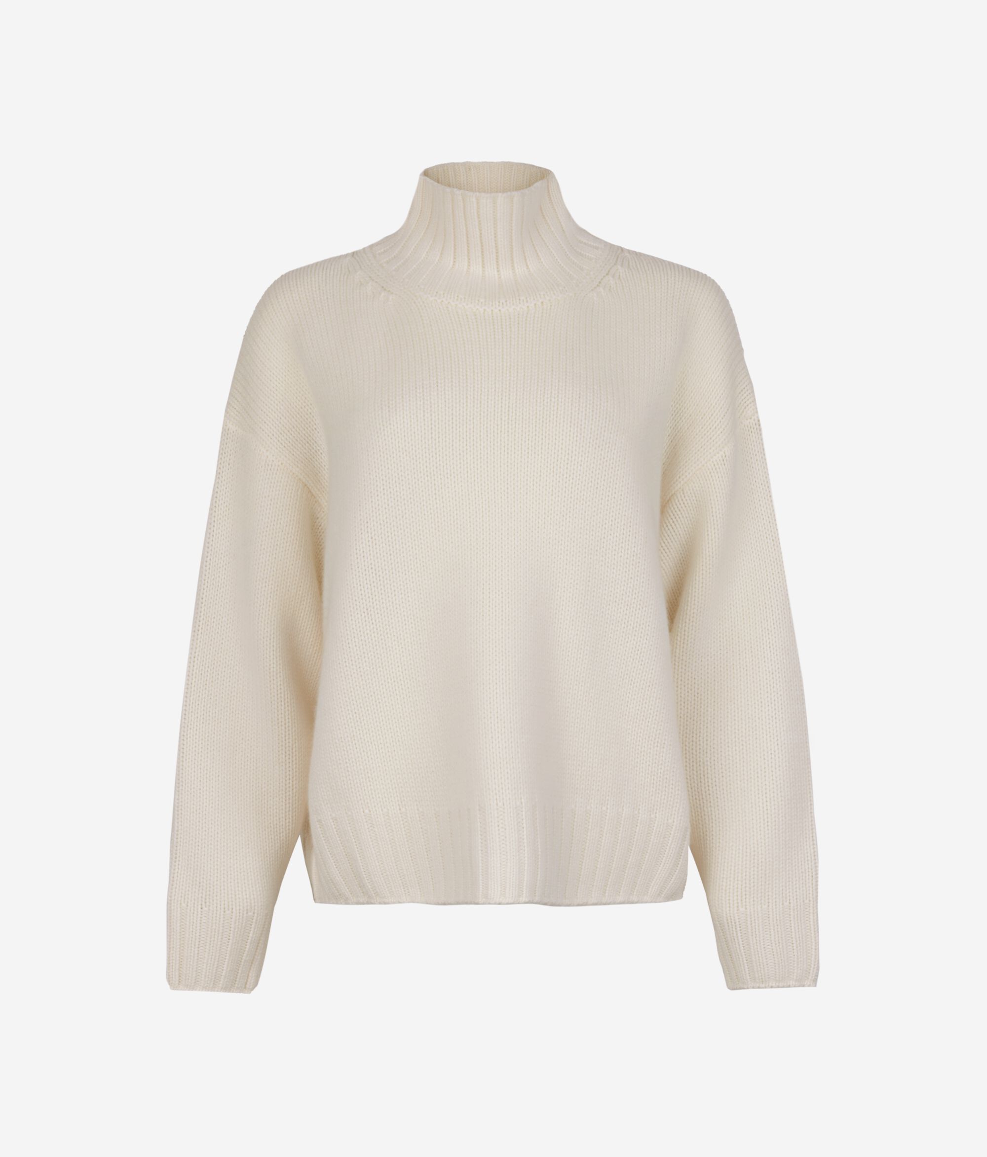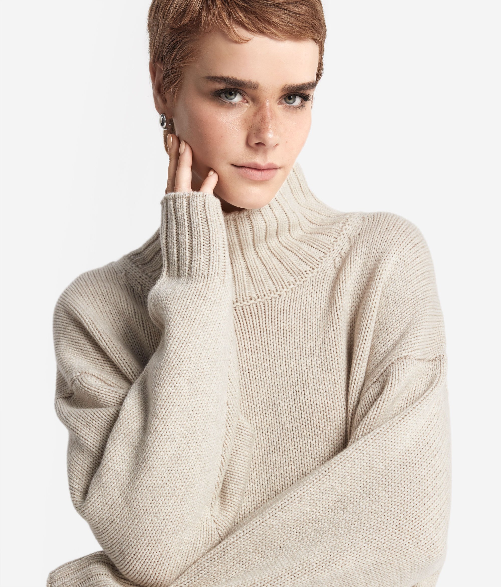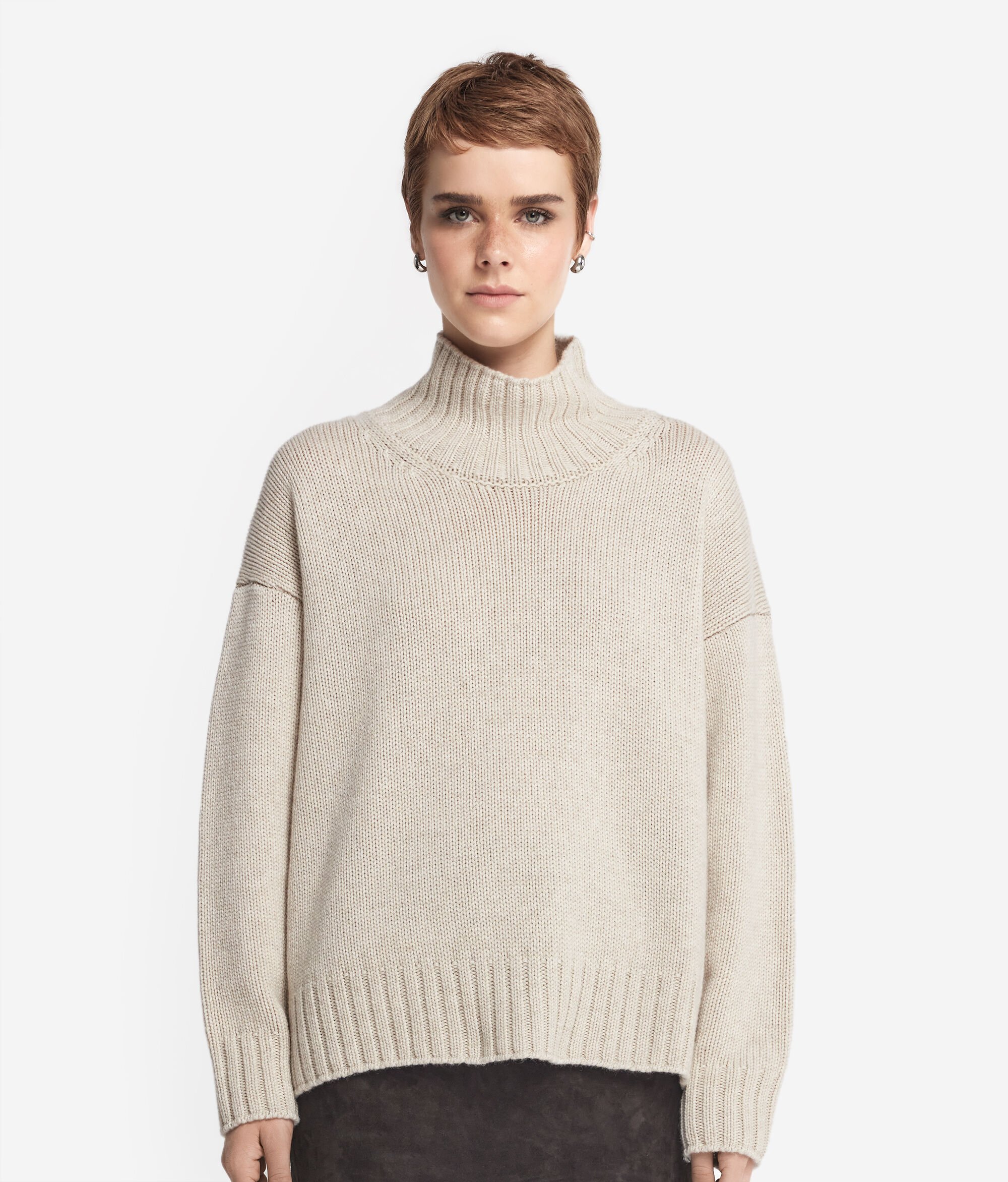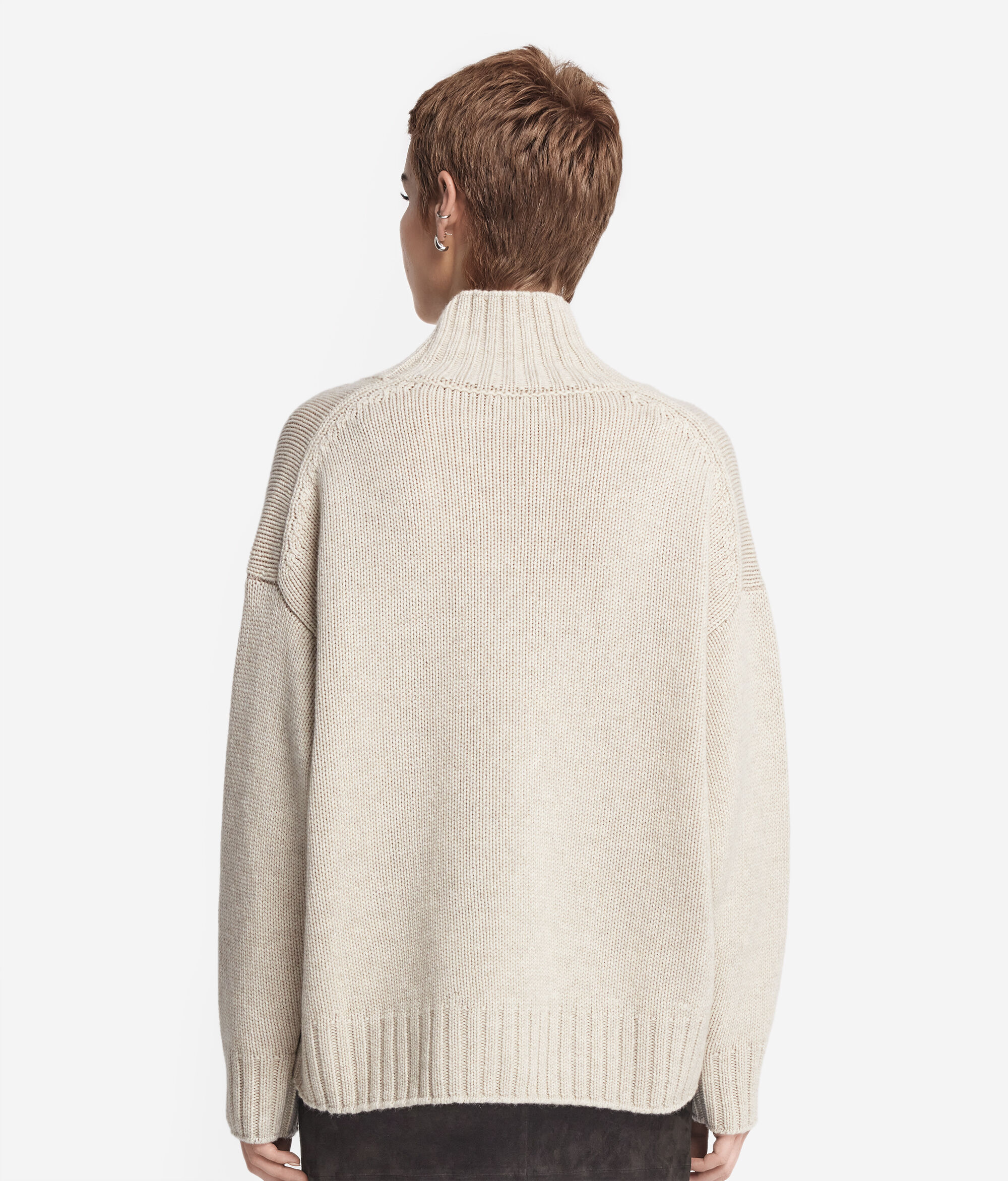 Calitatea deosebită a tricotului din cașmir Ultrasoft se îmbină cu liniile contemporane în această bluză înaltă pe gât. Tenta clasică se îmbină cu catifelarea naturală a firului și cu silueta cu volum delicat, cu umeri căzuți, astfel articolul devenind comod de purtat zilnic.